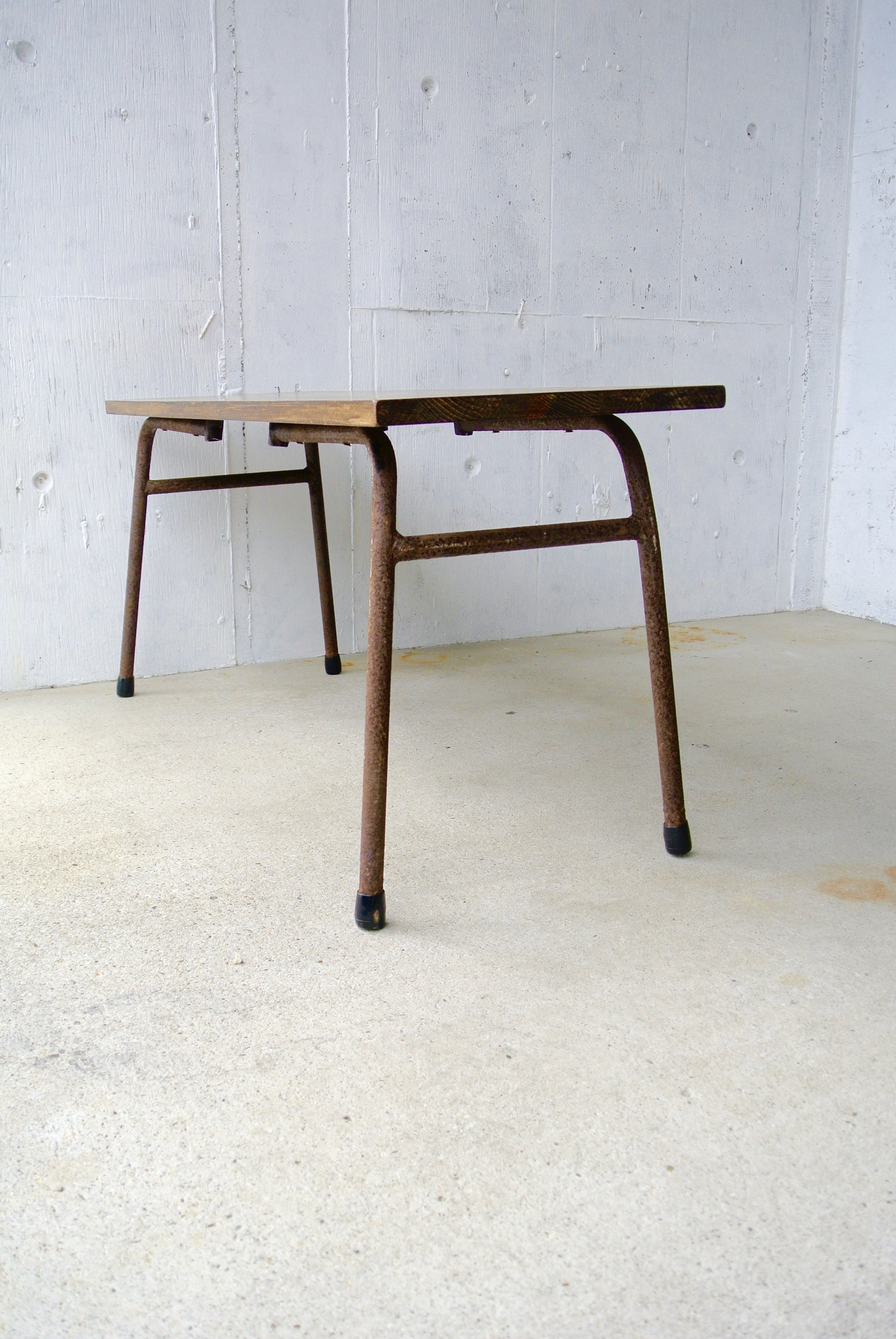 味のある天板と古いサビ脚が良く馴染んだベンチ。食卓テーブルの椅子にしてみたり、庭先をゆっくり眺める休憩椅子にしてみても素敵です。実用使い以外でも、お気に入りの植物や小物などを飾るディスプレイとしても感じ良くなります。