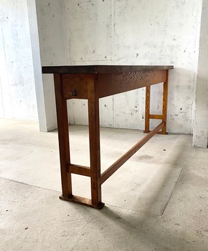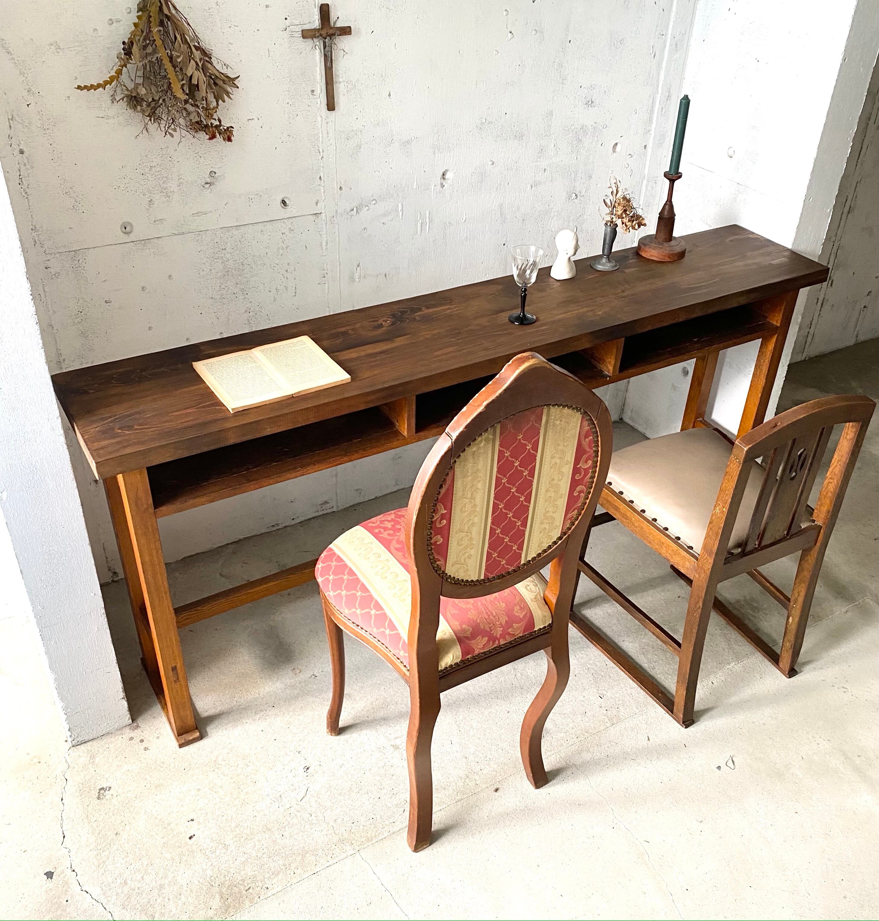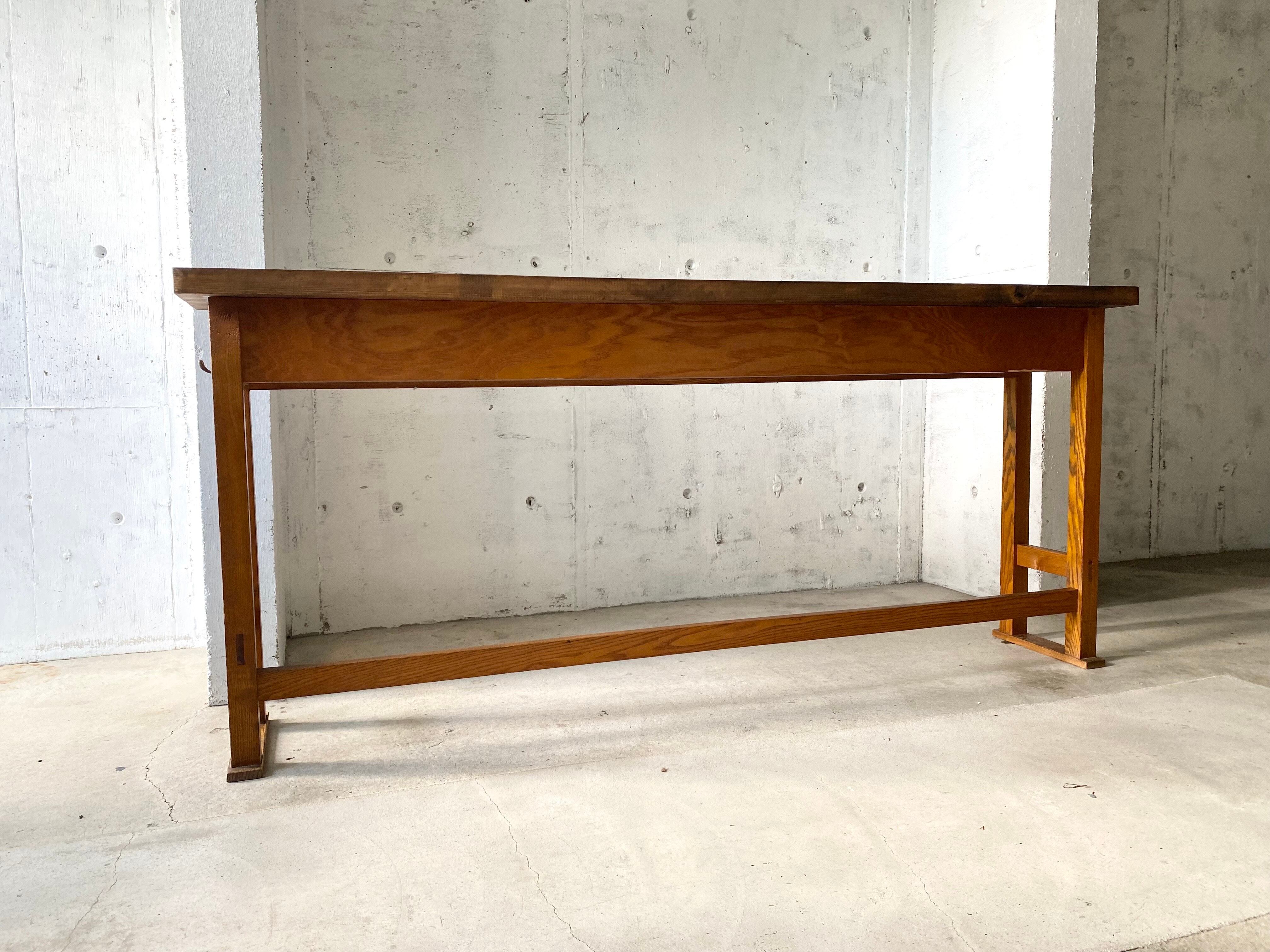 経年変化の味のある木肌と堂々とした佇まい、横幅のある姿が感じ良い木製デスク。収納は天板下に3箇所あり、収納力も十分です。アトリエで作業テーブルとしてや、リビングで壁側に置いてティータイムをするテーブルやお気に入りのコレクションや植物を飾るディスプレイ台としても素敵です。