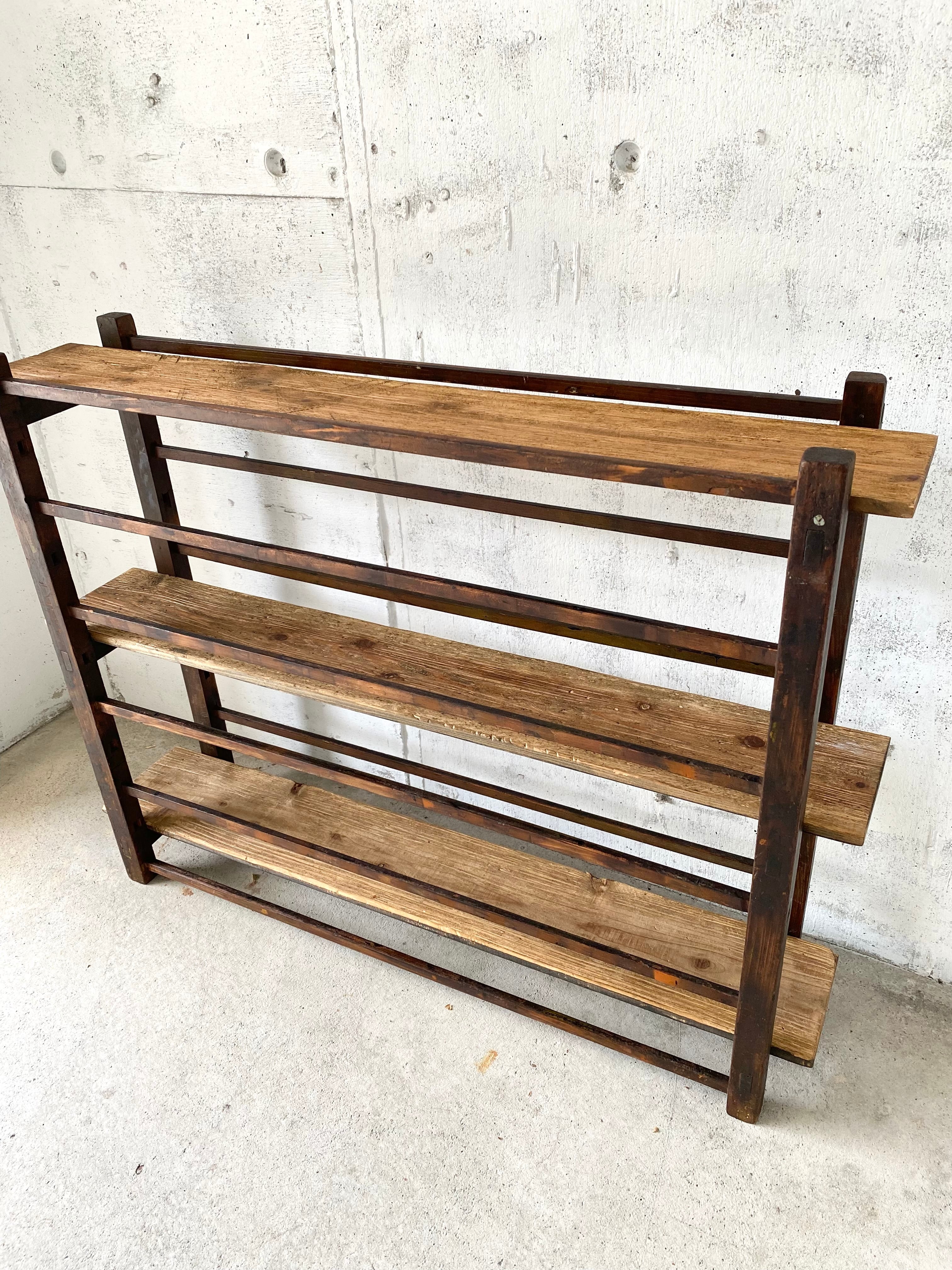 古いシェルフになります。スレや欠け、当たりキズ、割れ、禿げ、隙間、落としきれない汚れ、匂いなどがあります。少しのがたつきはありますが、全体的に状態も良いのでまだまだ実用的に活躍してくれます。