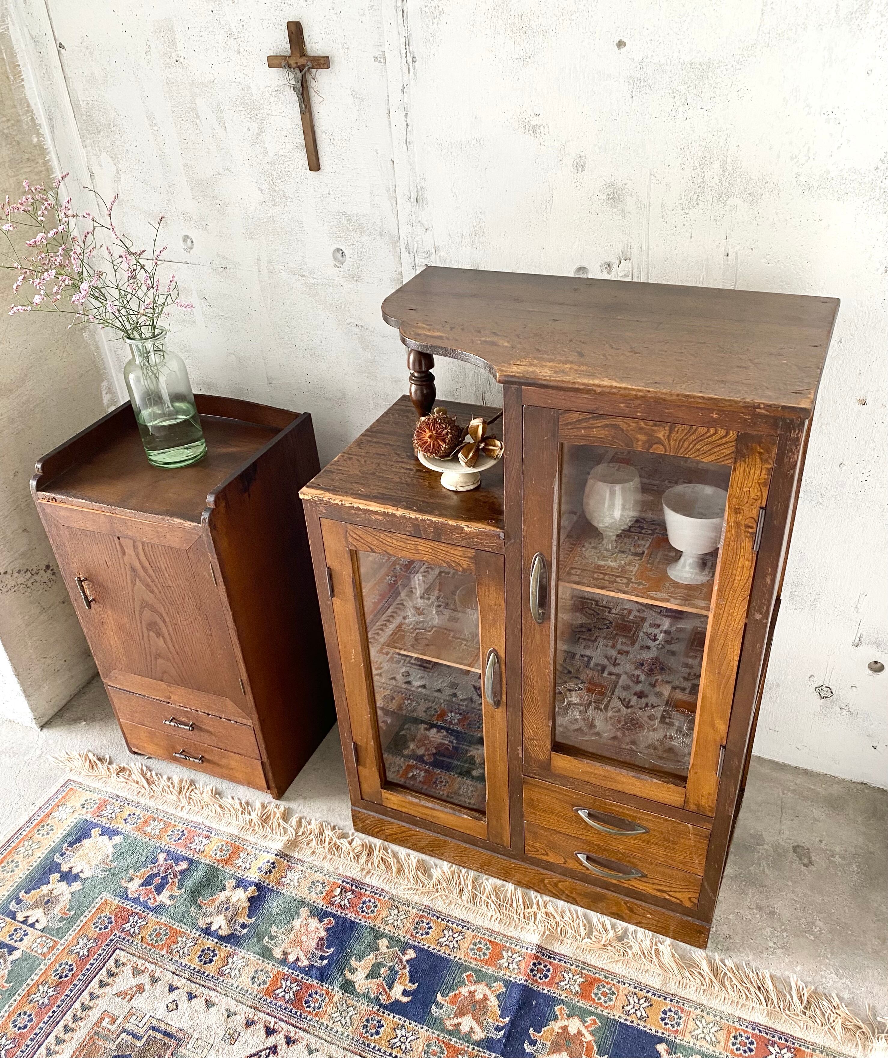 古いキャビネットになります.。スレやハゲ、割れ、欠け、隙間、反り、サビ、当たりキズ、落としきれない汚れなどがあります。特にガラスの割れもなく、扉、引出しの開閉も比較的スムーズに行えます。全体的に状態も良いのでまだまだ実用的に活躍してくれます。