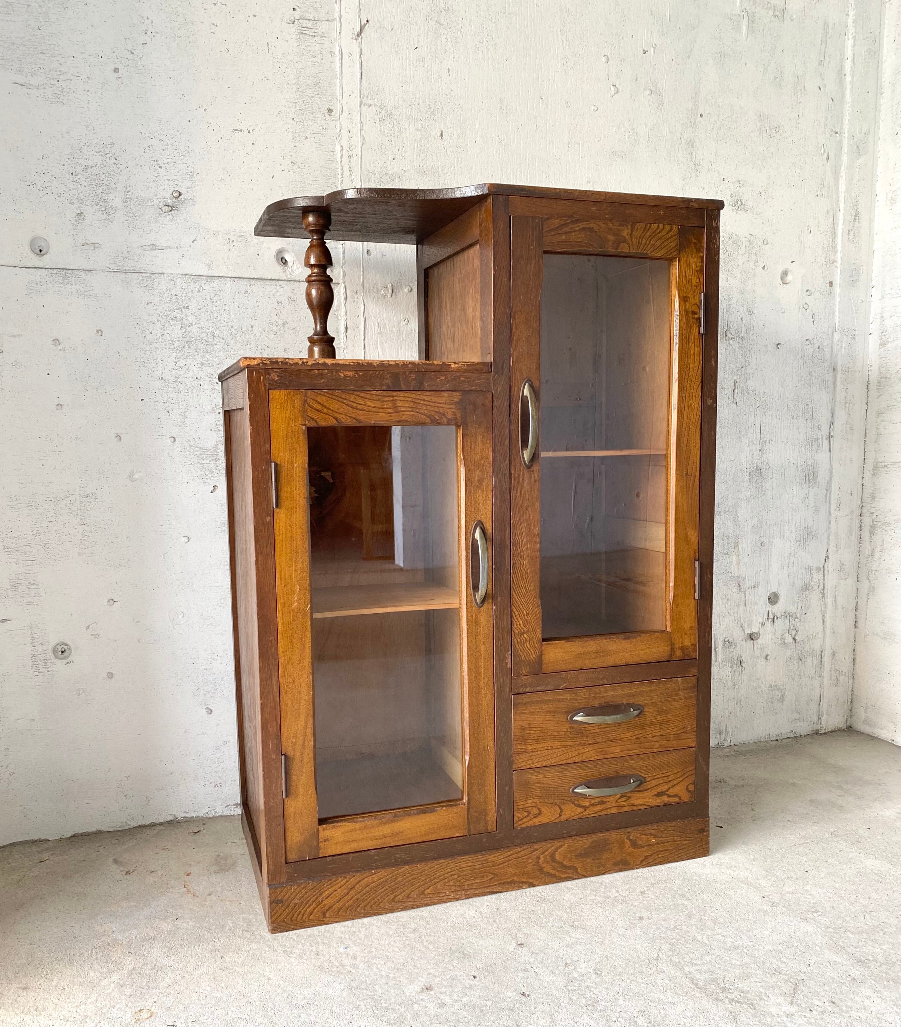 経年変化の雰囲気良い木肌と取手、デザイン性のあるろくろ飾りが感じ良いキャビネット。キッチンで食器棚としてやリビングで小物、本などの収納棚として、毎日の暮らしの中で手元に置いてお役立てください。