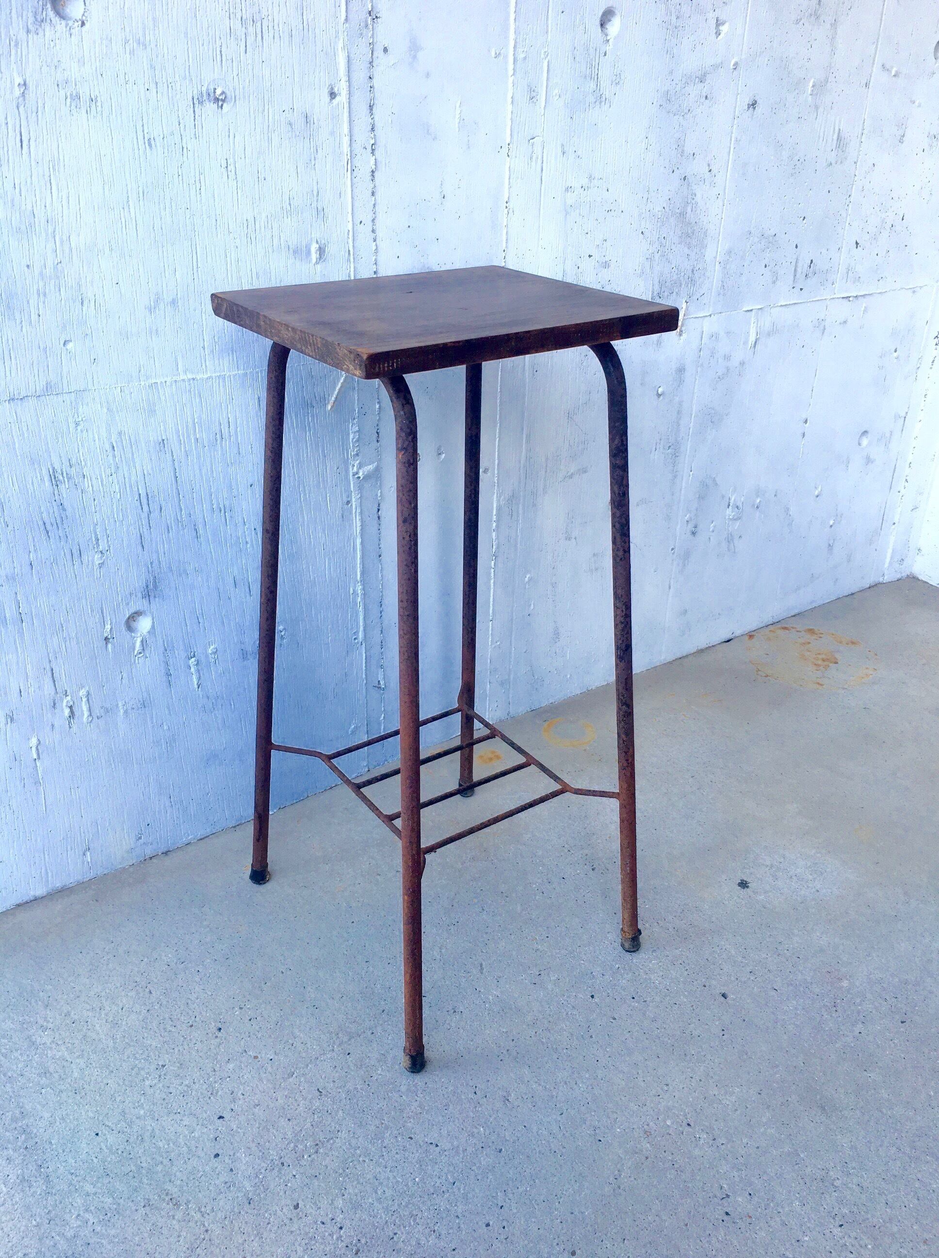 古い鉄脚と新材を使ったオリジナルリメイクのサイドテーブルになります。スレや剥げ、当たりキズ、サビ、落としきれない汚れなどがあります。古い鉄脚になりますので、少しのがたつきはありますが、使用上問題なくお使いいただけます。全体的に状態も良く、まだまだ実用的に活躍してくれます。
