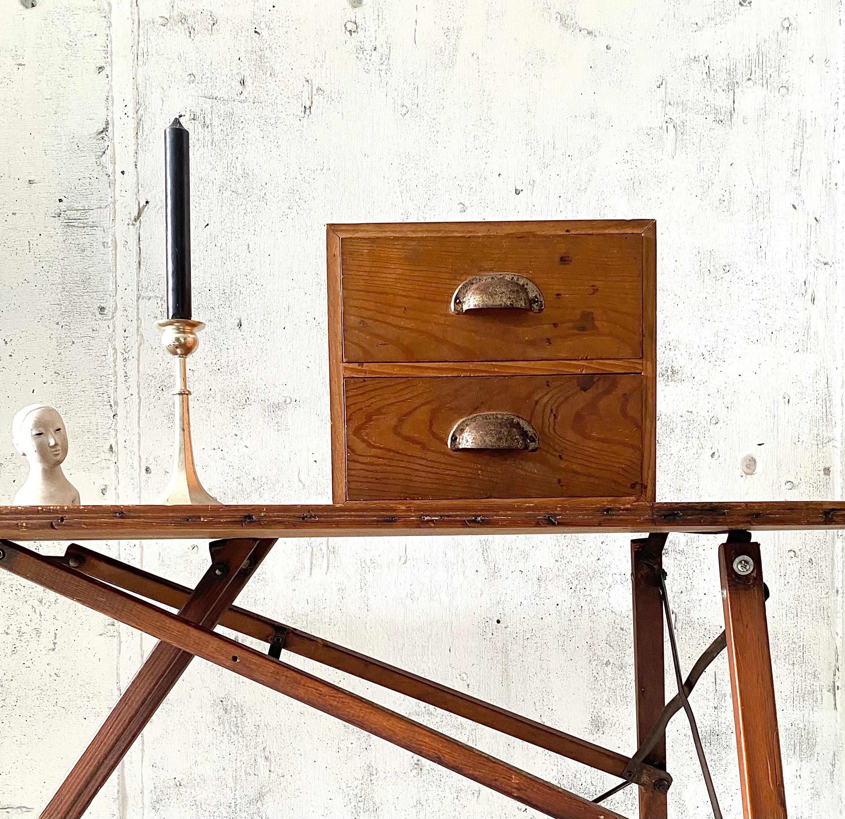 経年変化の雰囲気良い木肌と取手、小振りなサイズ感が可愛らしい小引出し。お部屋の卓上、棚上、カウンター上に置いて細々した物の収納としても素敵です。