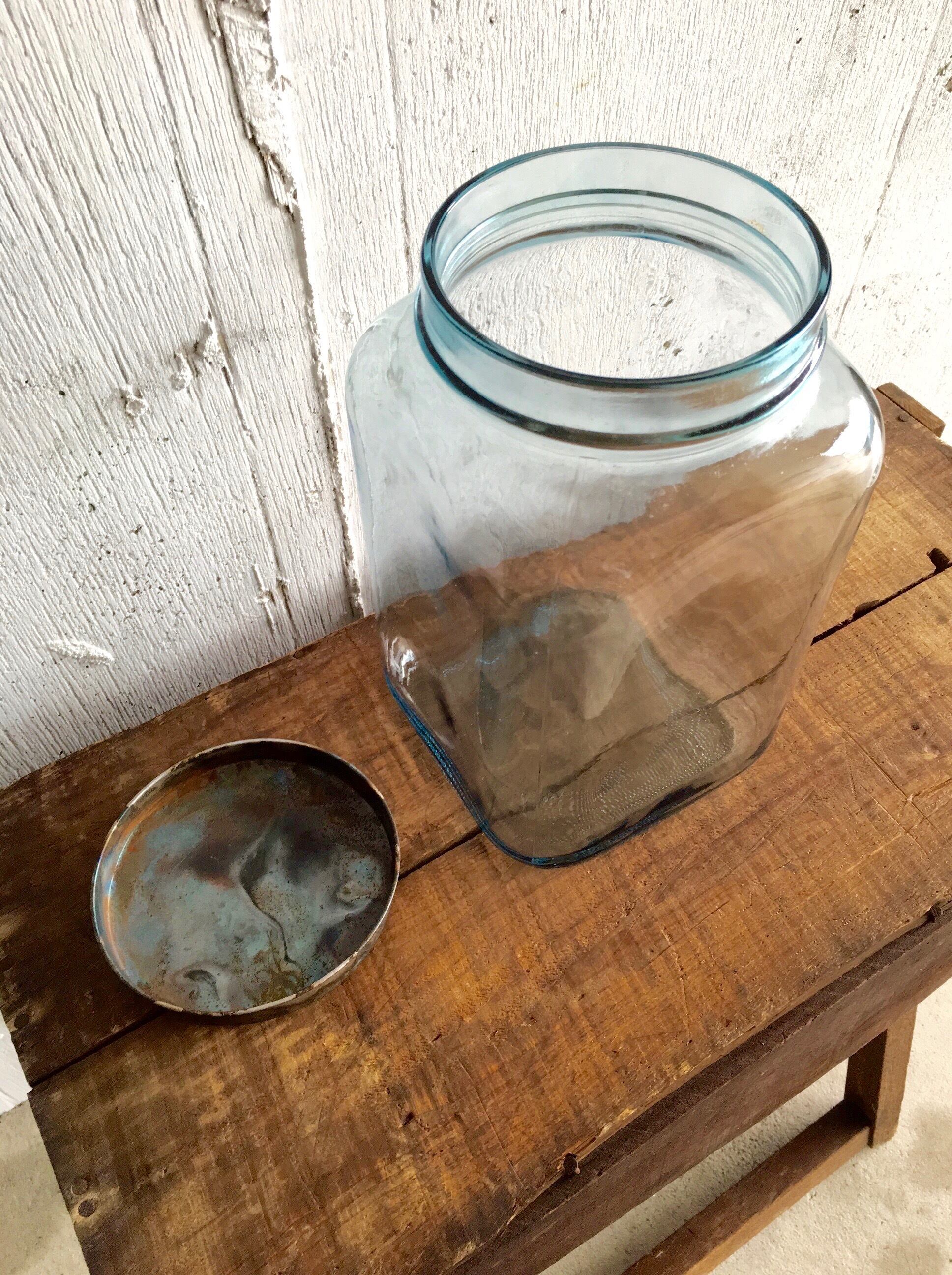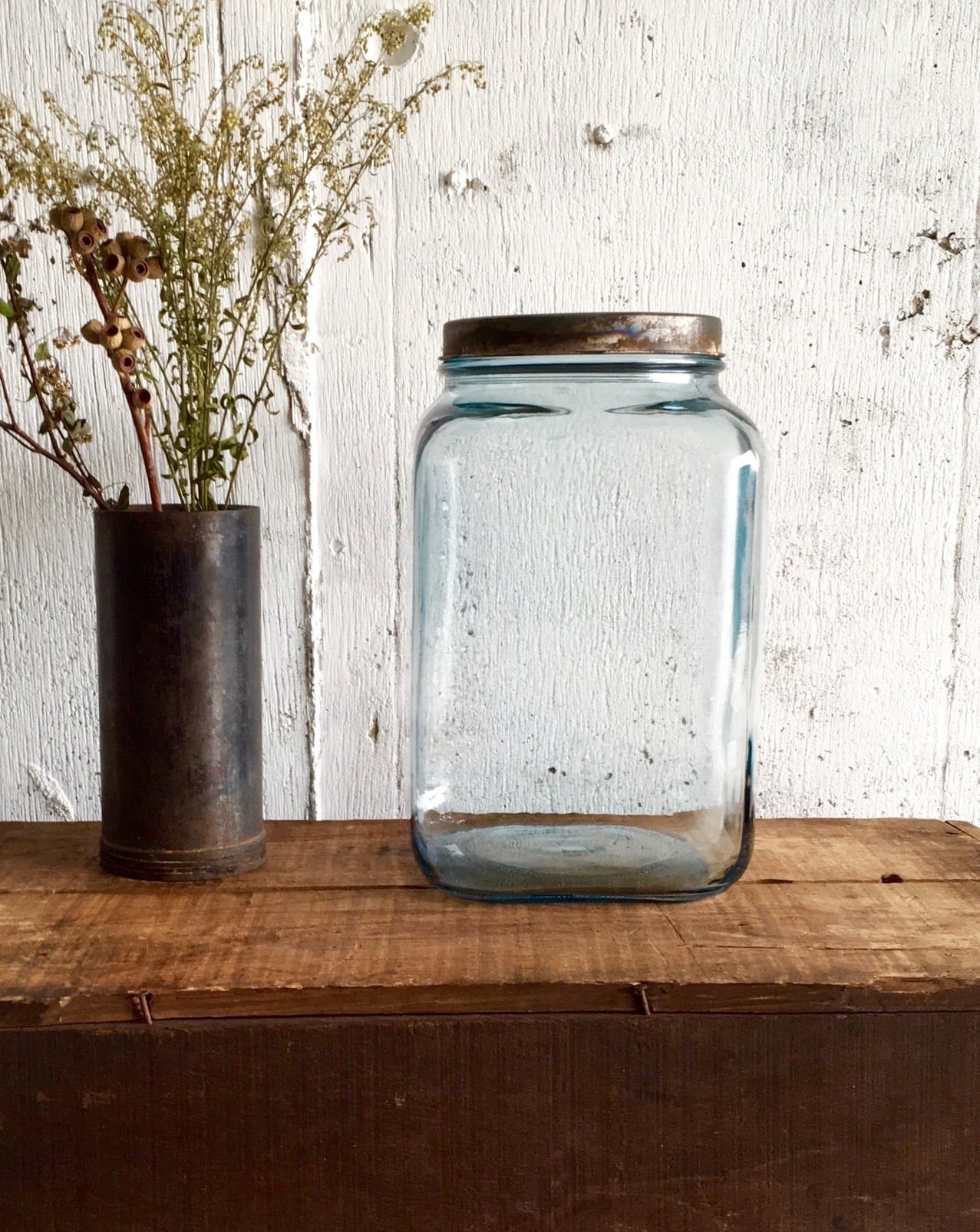 少し青みがかった綺麗な色のガラスと経年変化で雰囲気の出たアルミの蓋が感じ良いガラス瓶です。全体的に綺麗で状態も良いです。卓上などでドライの実を入れて飾ってみたり、お菓子入れにしてみたり、キッチンで材料入れなどとしても素敵にお使いいただけます。