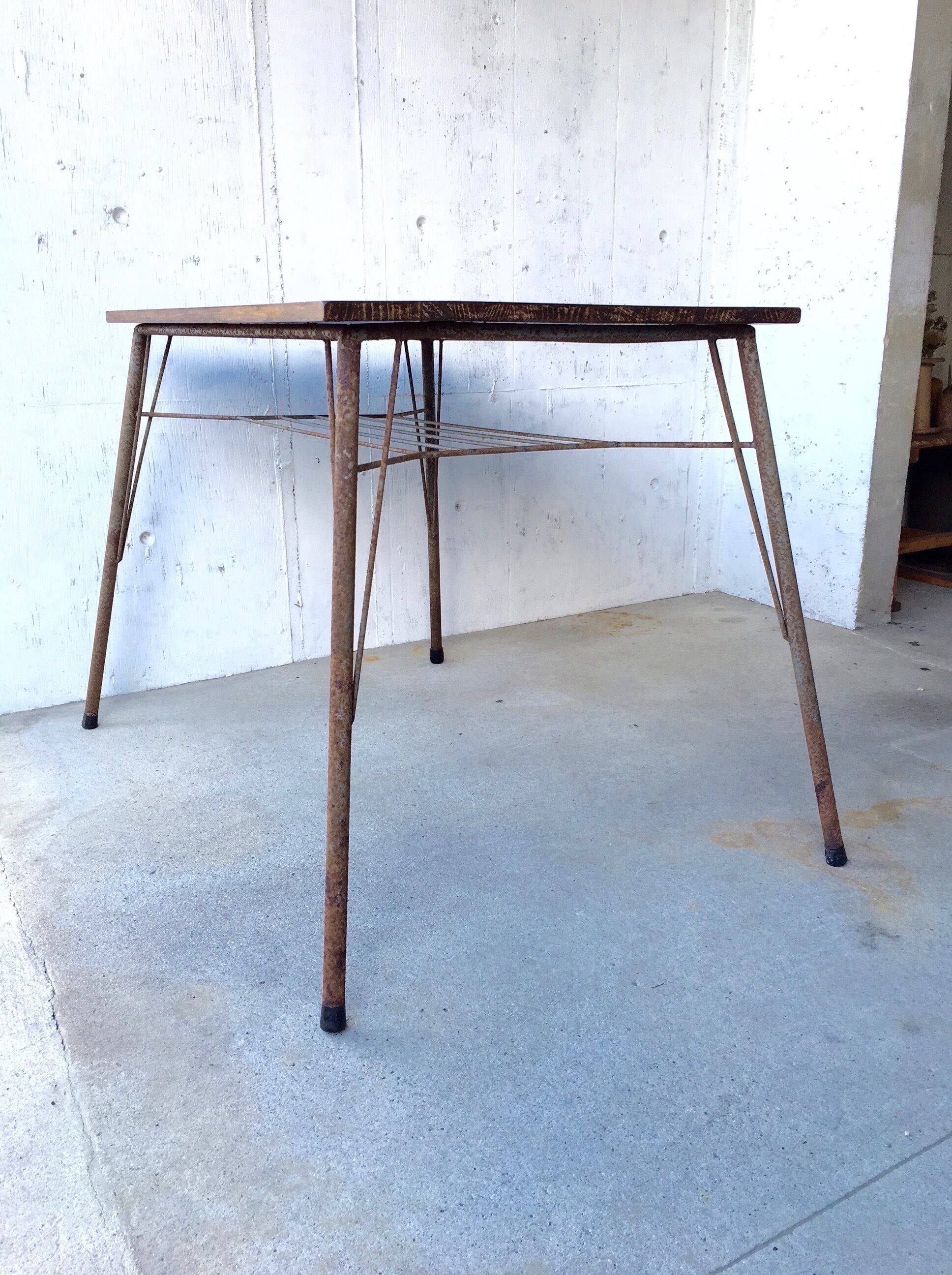 古い鉄脚と新材を使ったオリジナルリメイクのテーブルになります。スレや剥げ、当たりキズ、サビ、落としきれない汚れなどがあります。古い鉄脚になりますので、少しのがたつきはありますが、使用上問題なくお使いいただけます。全体的に状態も良く、まだまだ実用的に活躍してくれます。