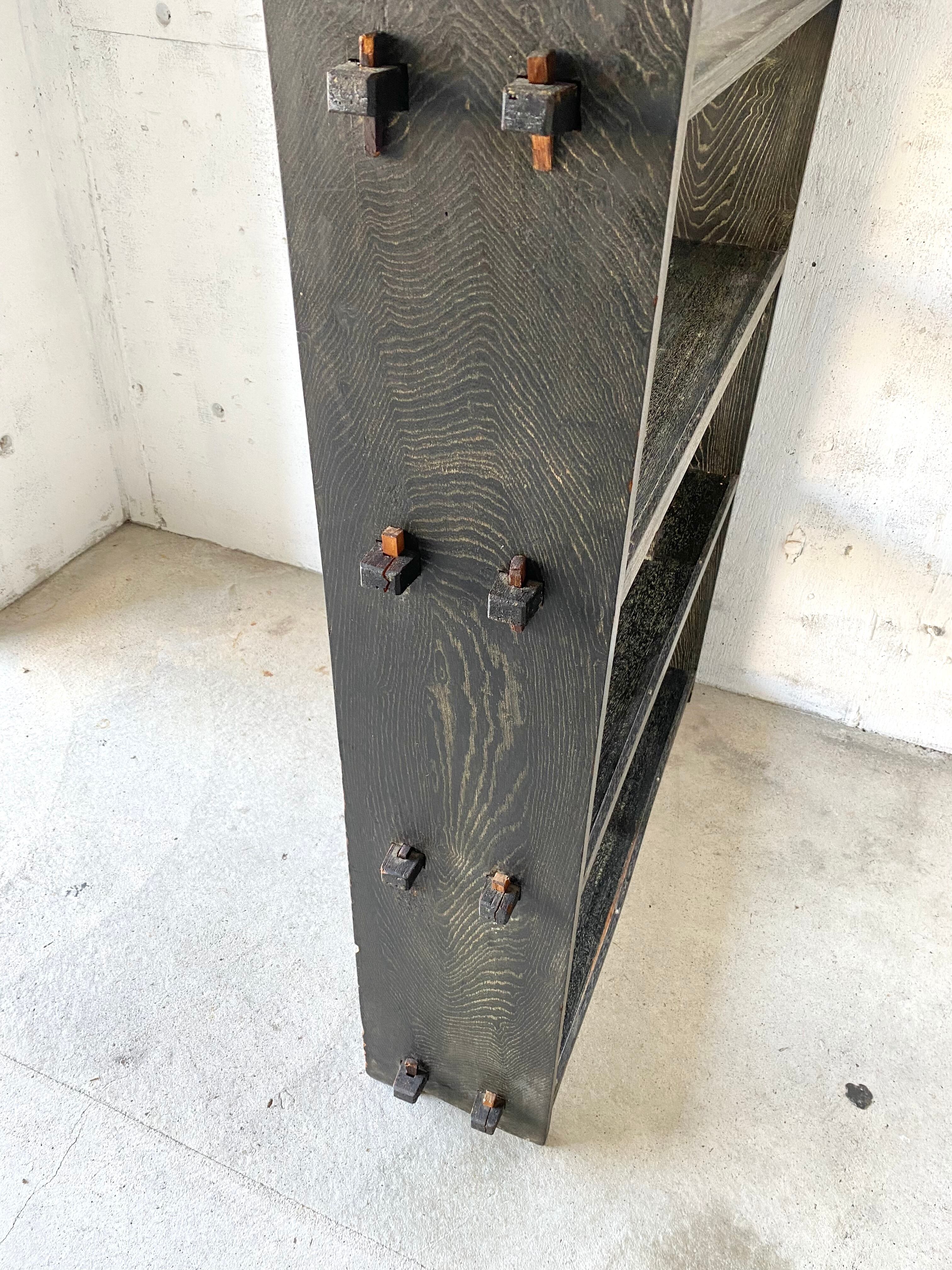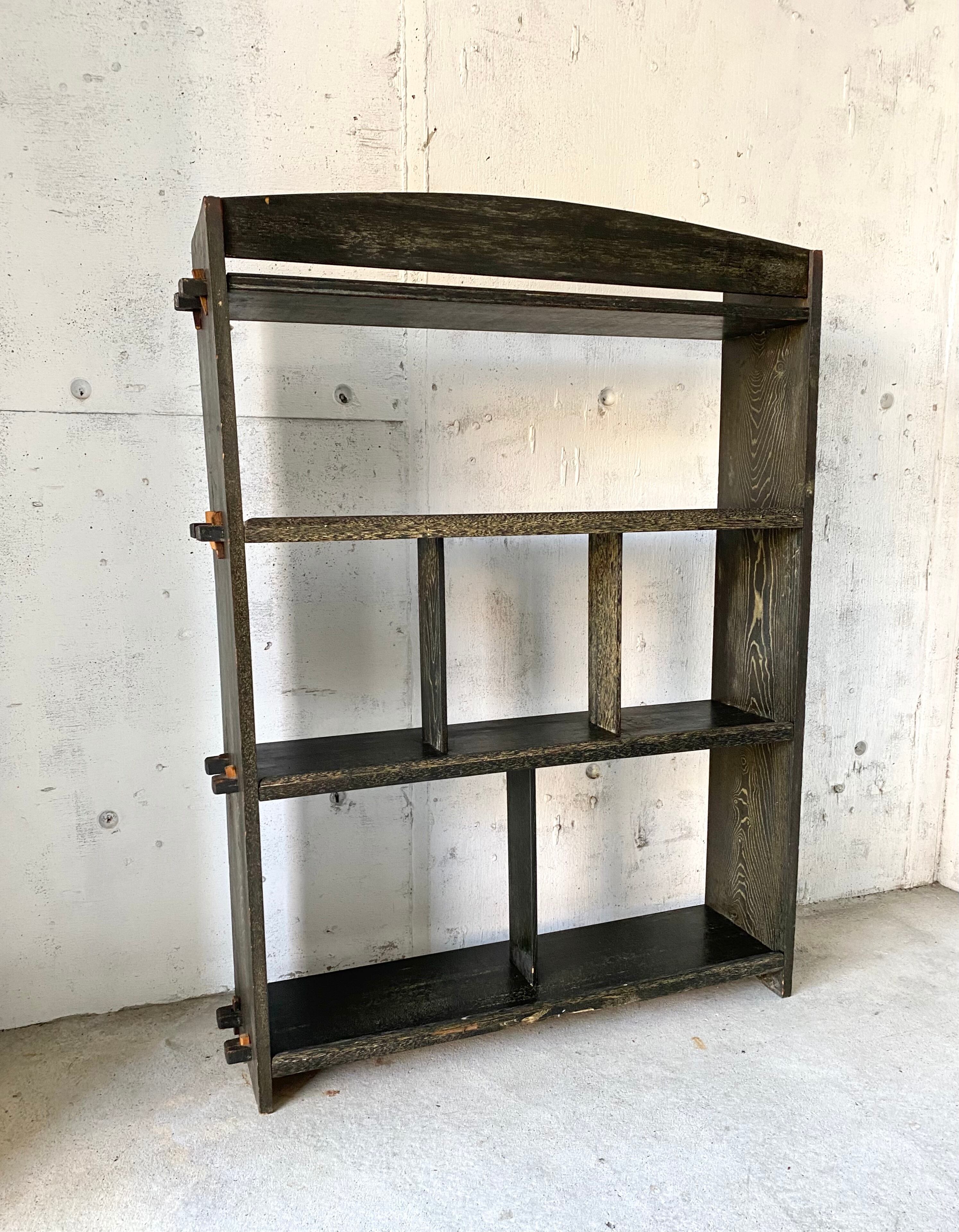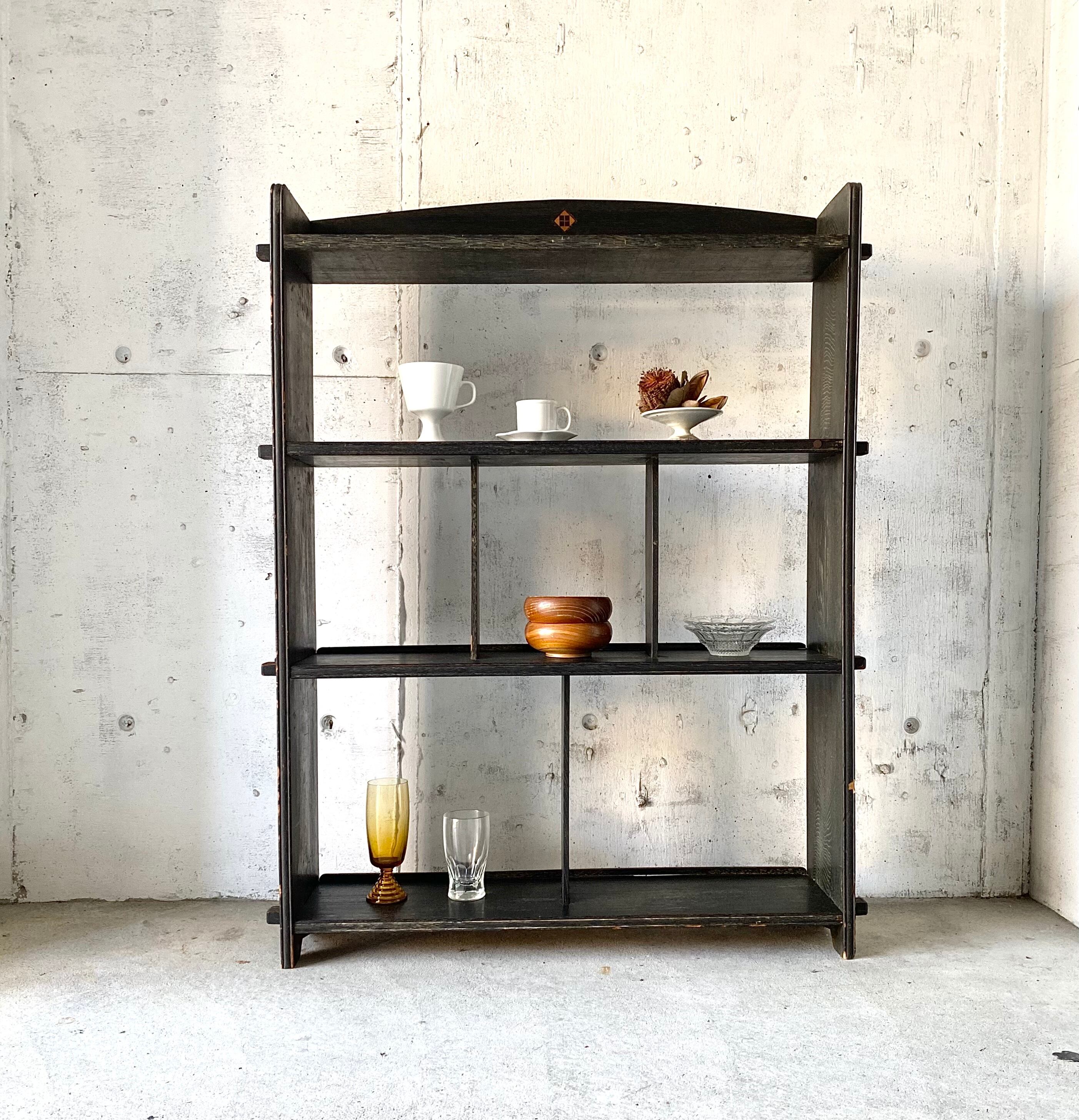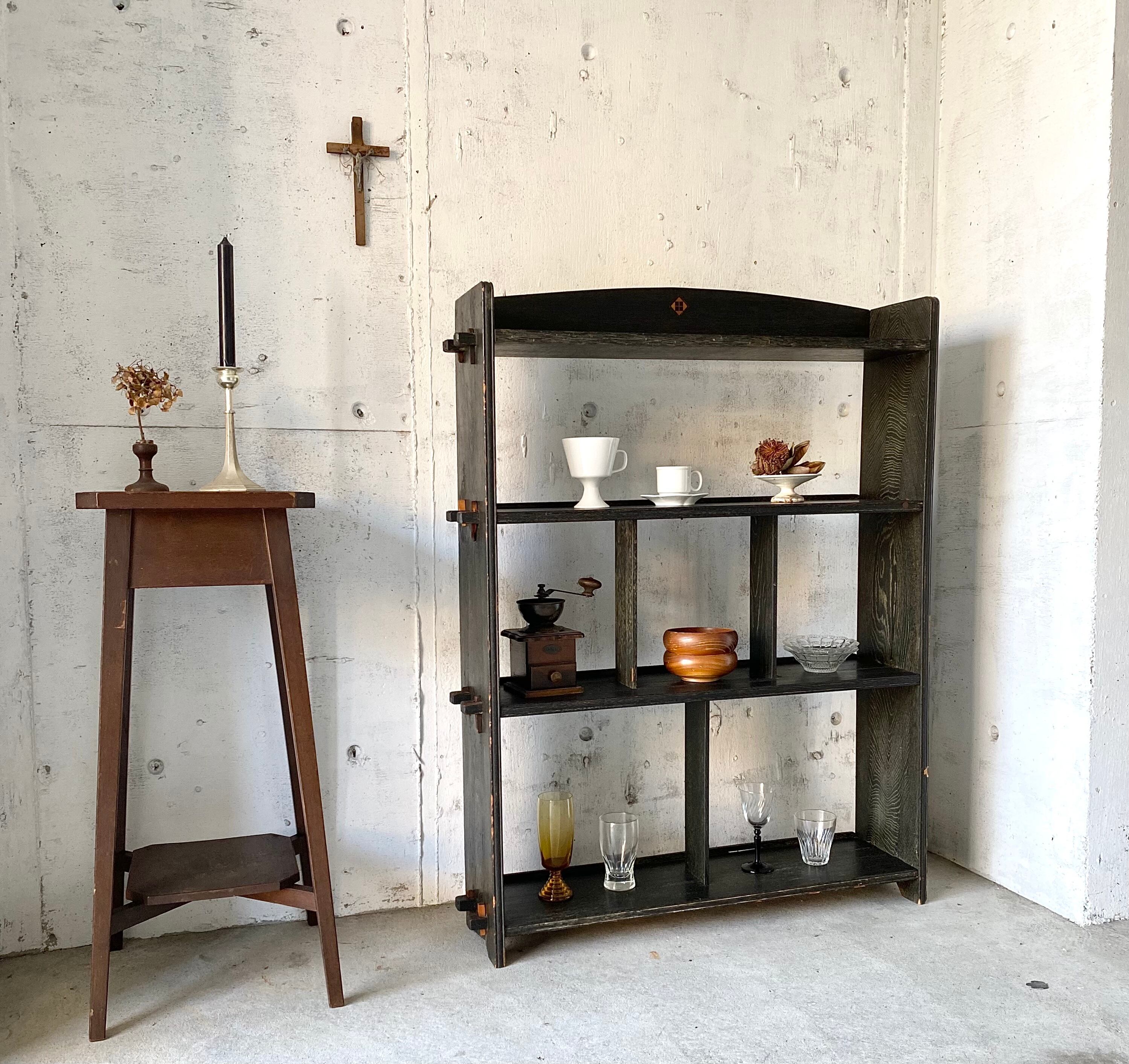 古いオープンラックになります。スレや欠け、当たりキズ、割れ、反り、隙間、落としきれない汚れなどがあります。少しのぐらつきはありますが、全体的に状態も良いのでまだまだ実用的に活躍してくれます。