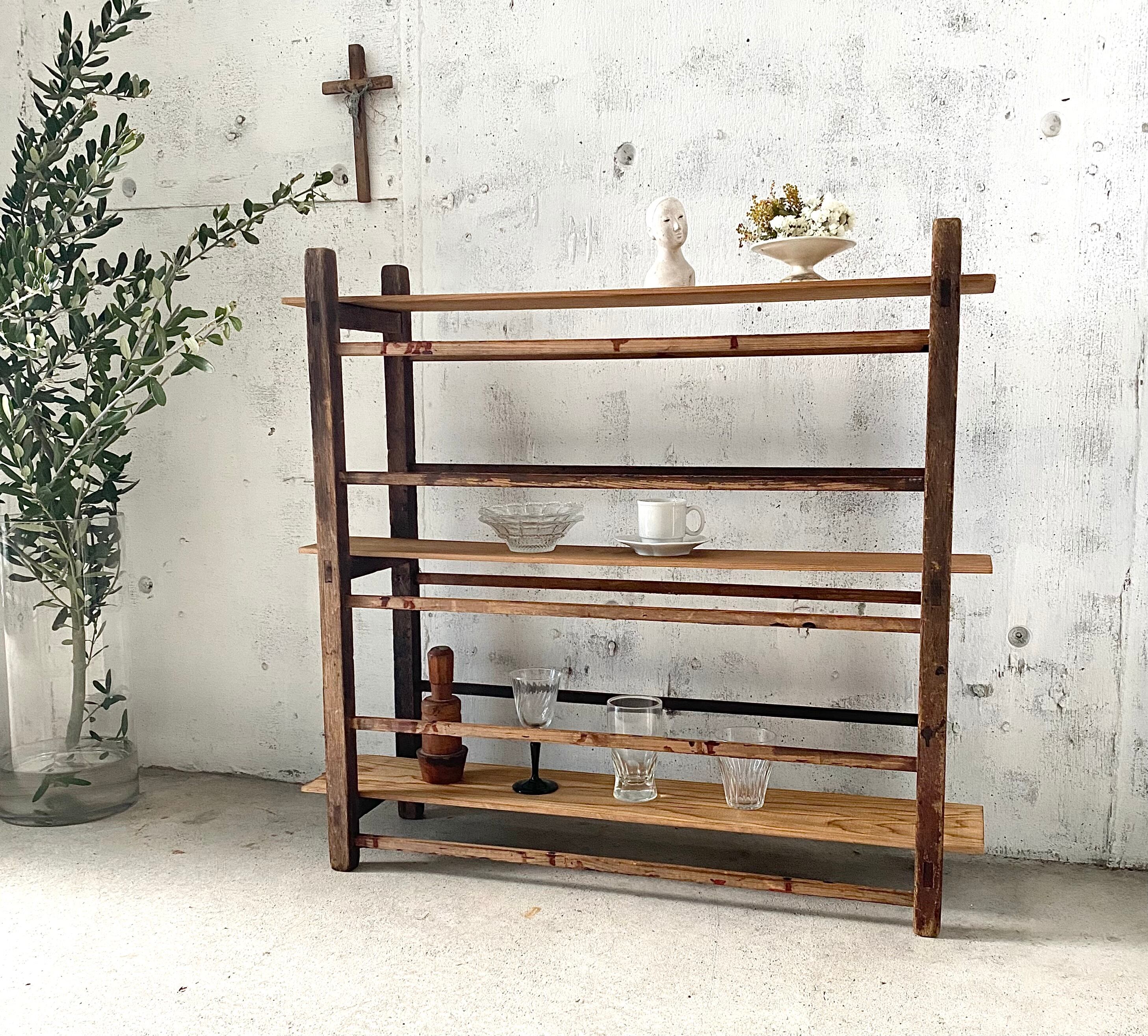 経年変化の古木の風合い、すっきりとした姿が感じ良いオープンラック。奥行も深すぎず、場所を取らないので使いやすいです。本や小物、植物のディスプレイ棚としてや、キッチンで食器や調味料のストック棚、ショップのディスプレイ棚としてもオススメです。
