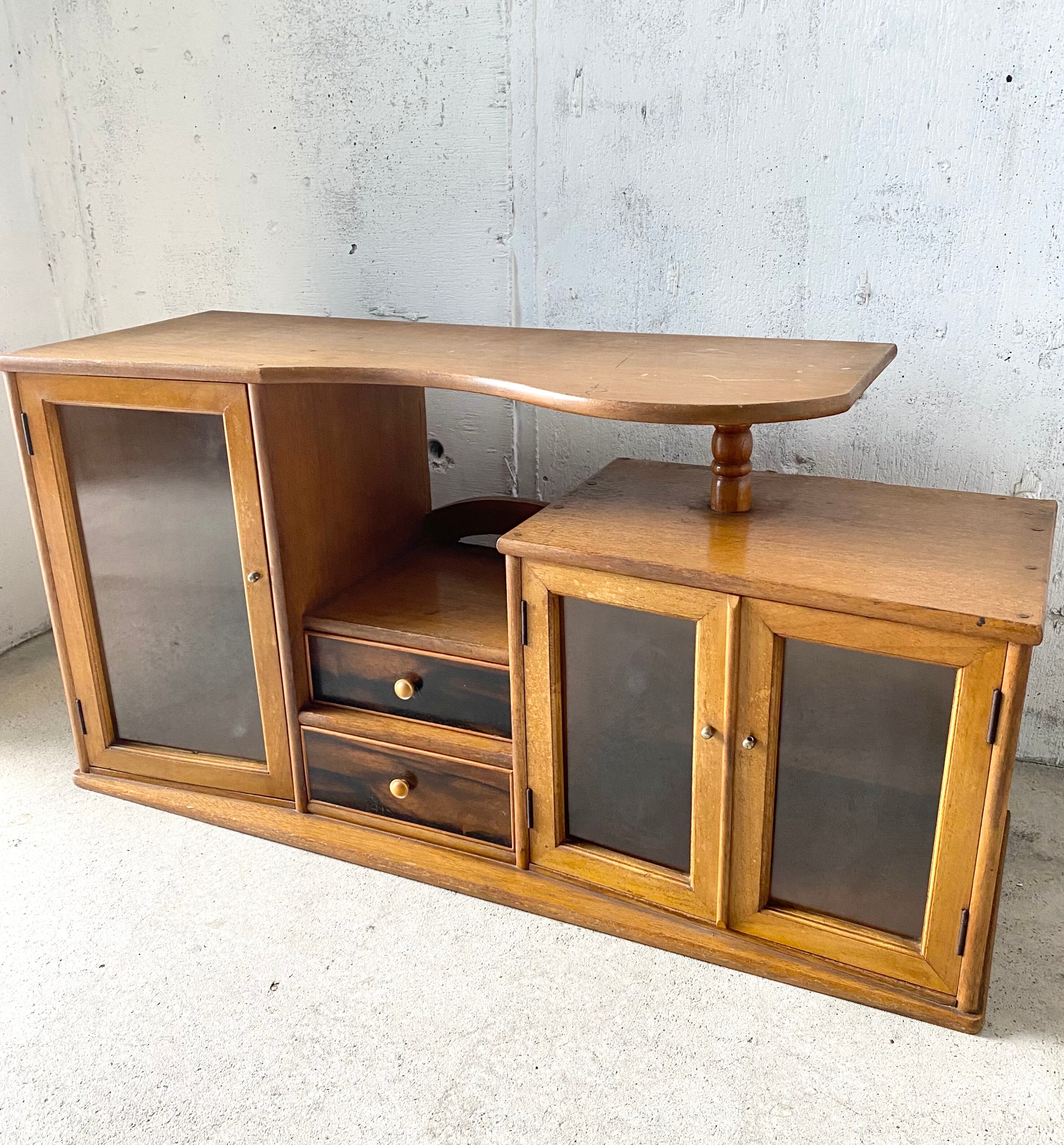 経年変化の雰囲気良い木肌と取手、個性的な姿が感じ良い収納棚。ガラス扉、引出しの開閉は比較的スムーズに行えます。お部屋の卓上やカウンターなどに置いて、細々した物や本、紙物の収納としても素敵にお使い頂けそうです。