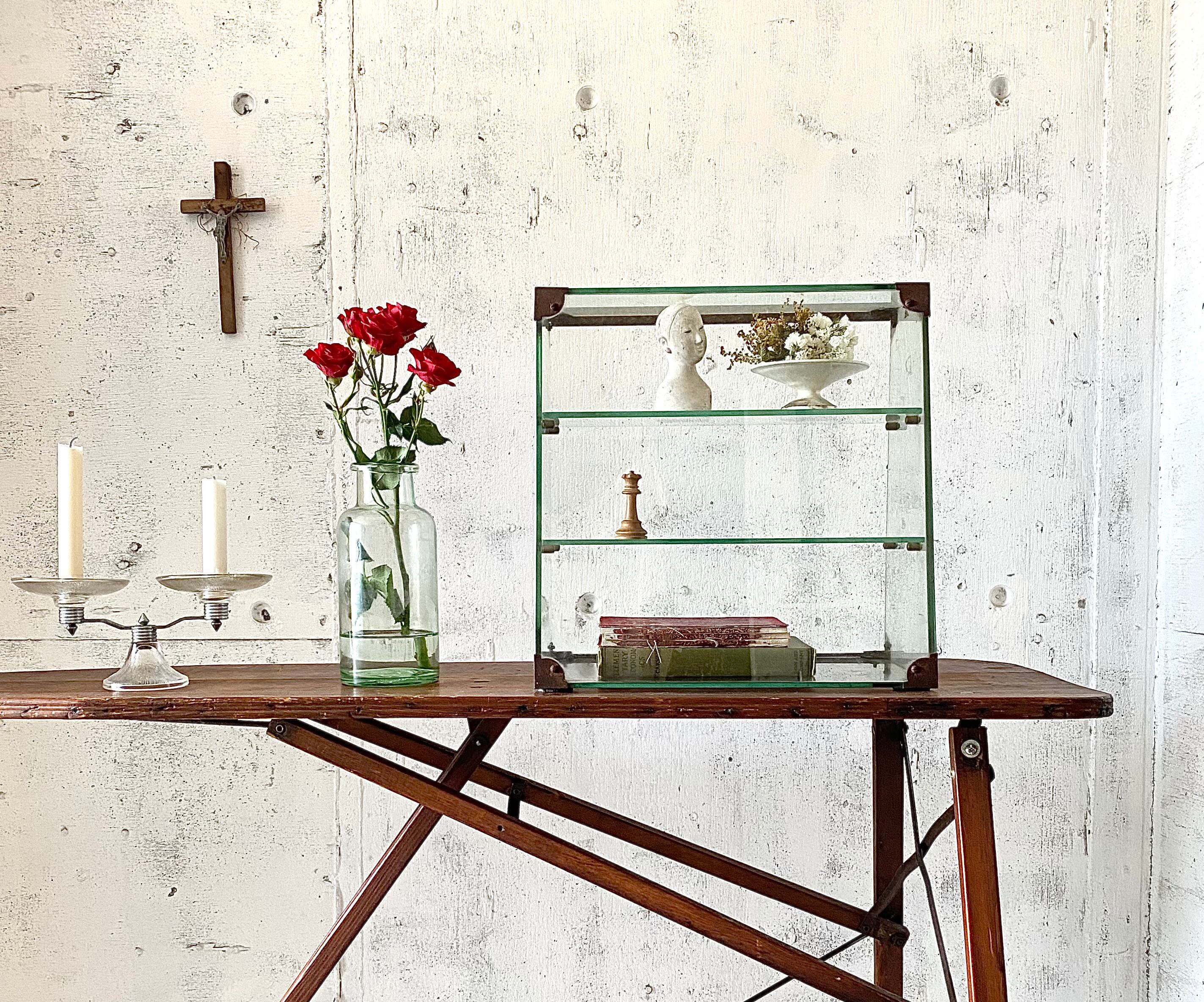 雰囲気の良いガラスが綺麗なショーケース。特に気になる割れなどはなく、状態は良いです。お部屋の卓上やカウンター上などで、お気に入りの小物やアクセサリー、ドライフラワーを飾っても素敵です。ショップの店舗什器としてもオススメの品です。