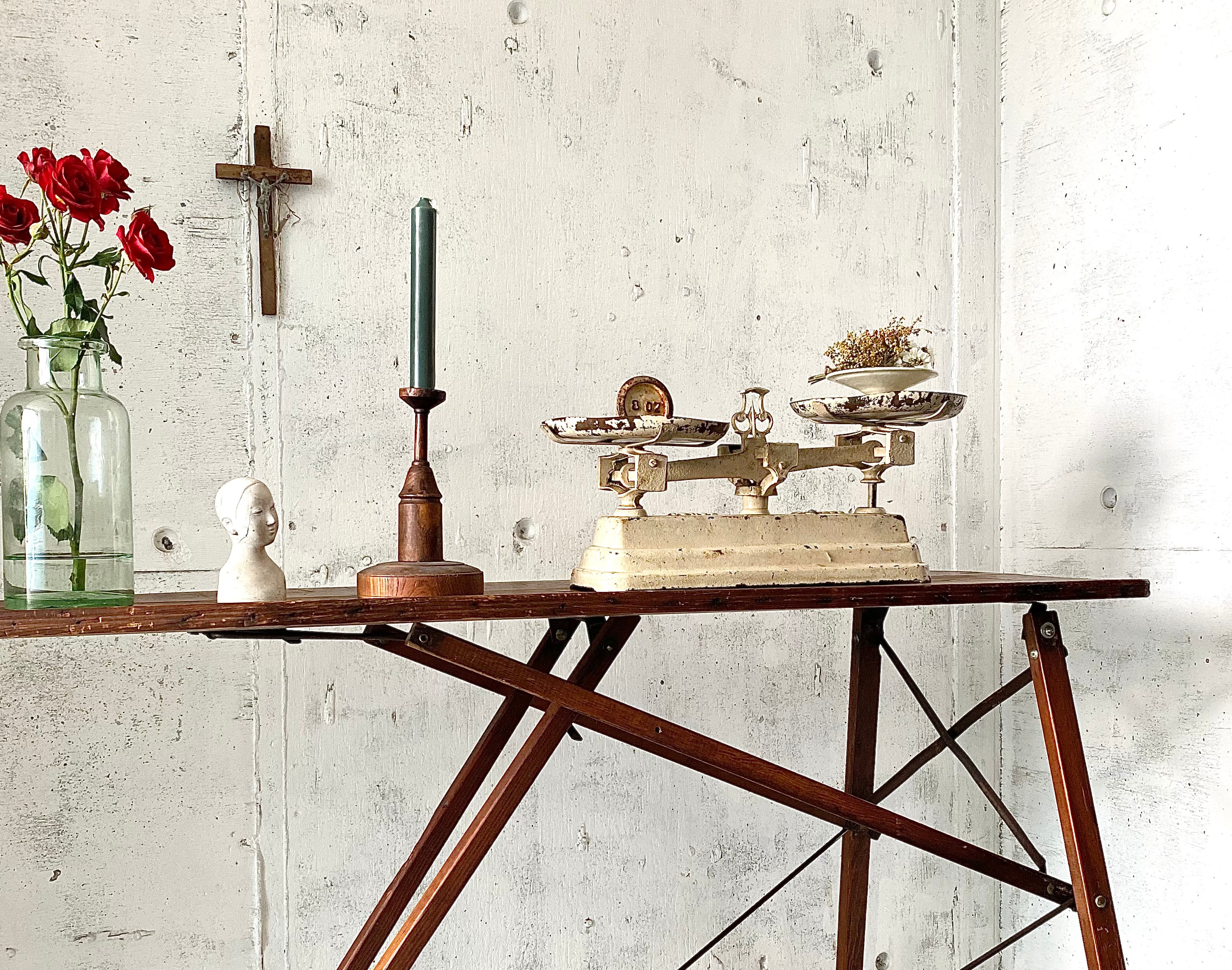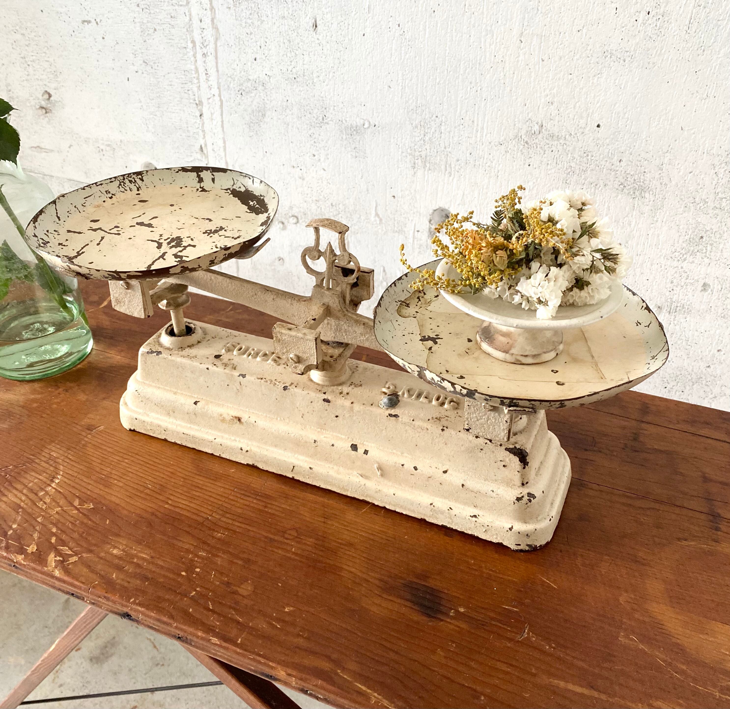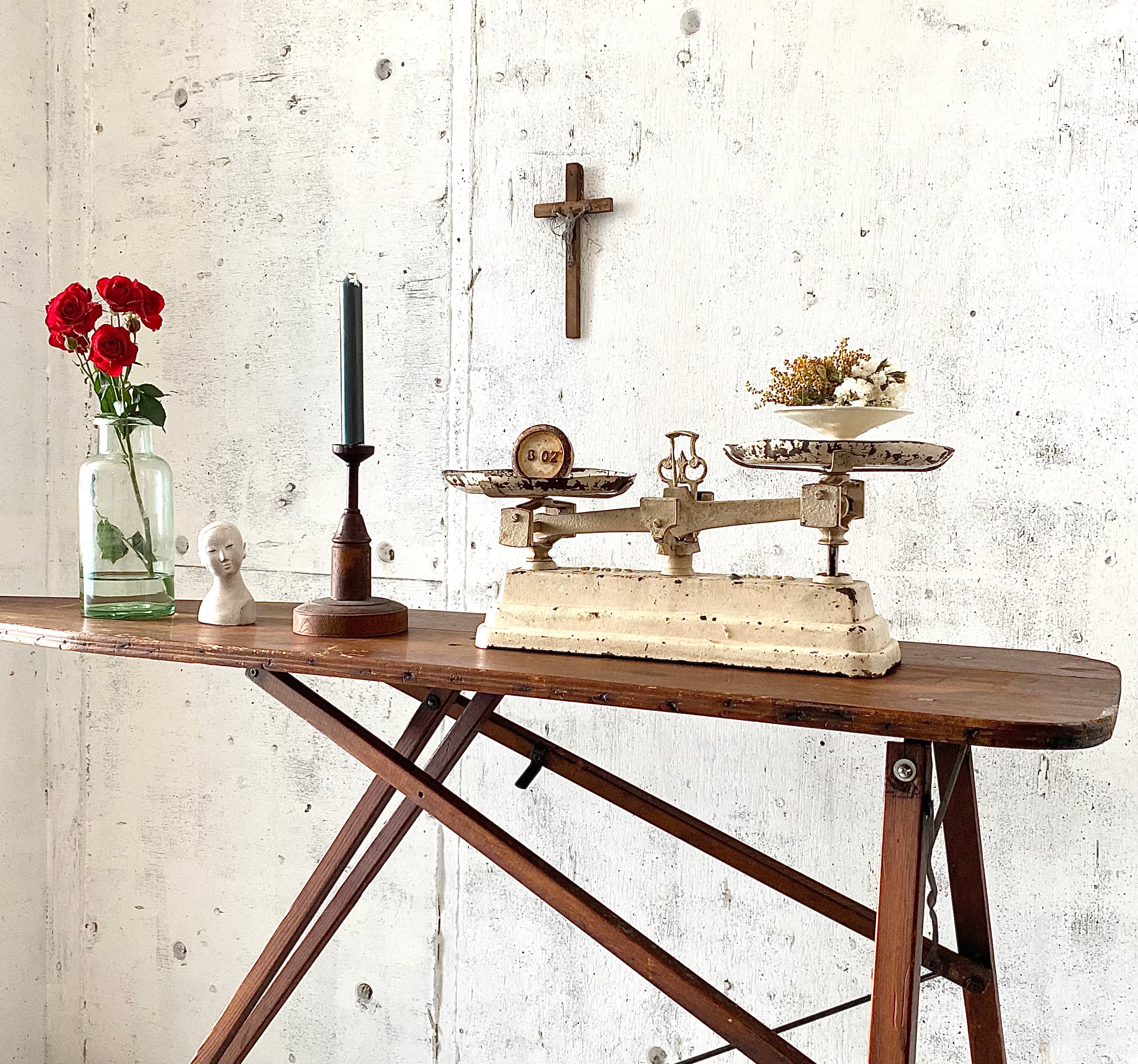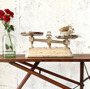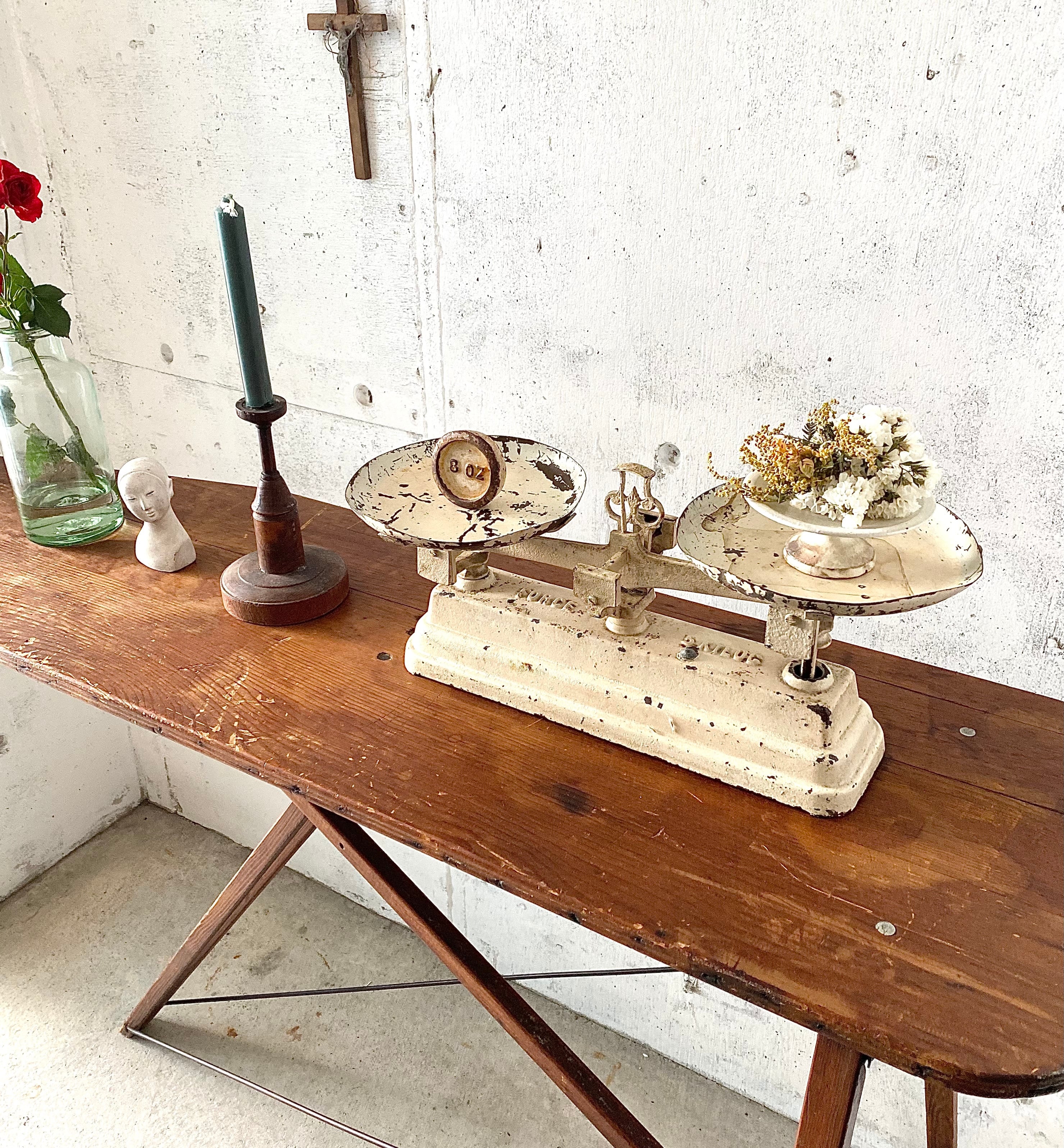 経年変化の程良く禿げたペイント、サビ感が雰囲気良い天秤台。お部屋の卓上やカウンター上で植物、小物を置いてディスプレイしてみたり、お店の店舗什器としてもオススメの品です。