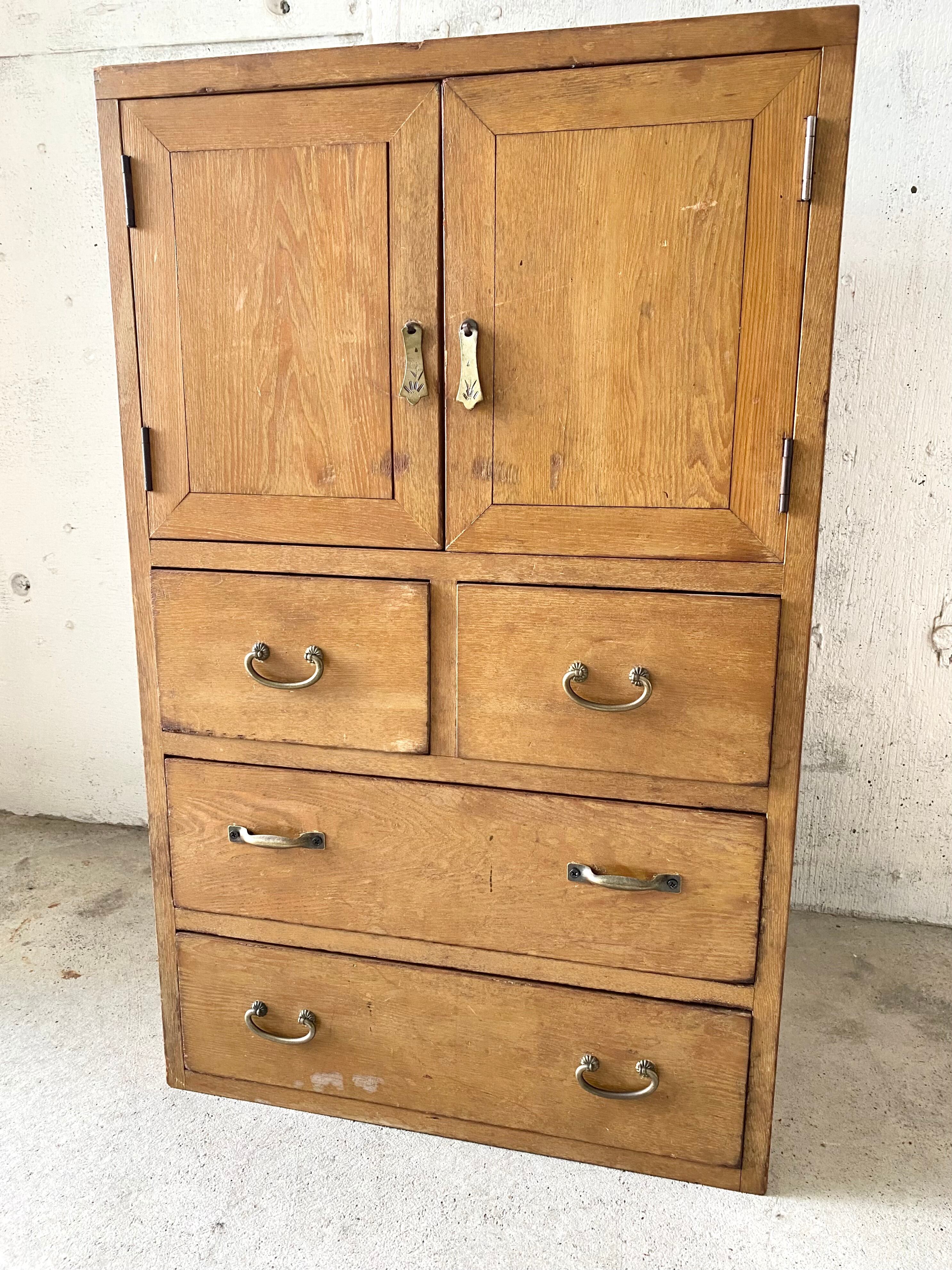 経年変化の雰囲気良い木肌と取手、すっきりとした姿が感じ良い収納棚。扉、引出しの開閉はスムーズに行えます。キッチンで食器や調味料のストック棚としてや、趣味部屋で本や小物の収納としても素敵です。