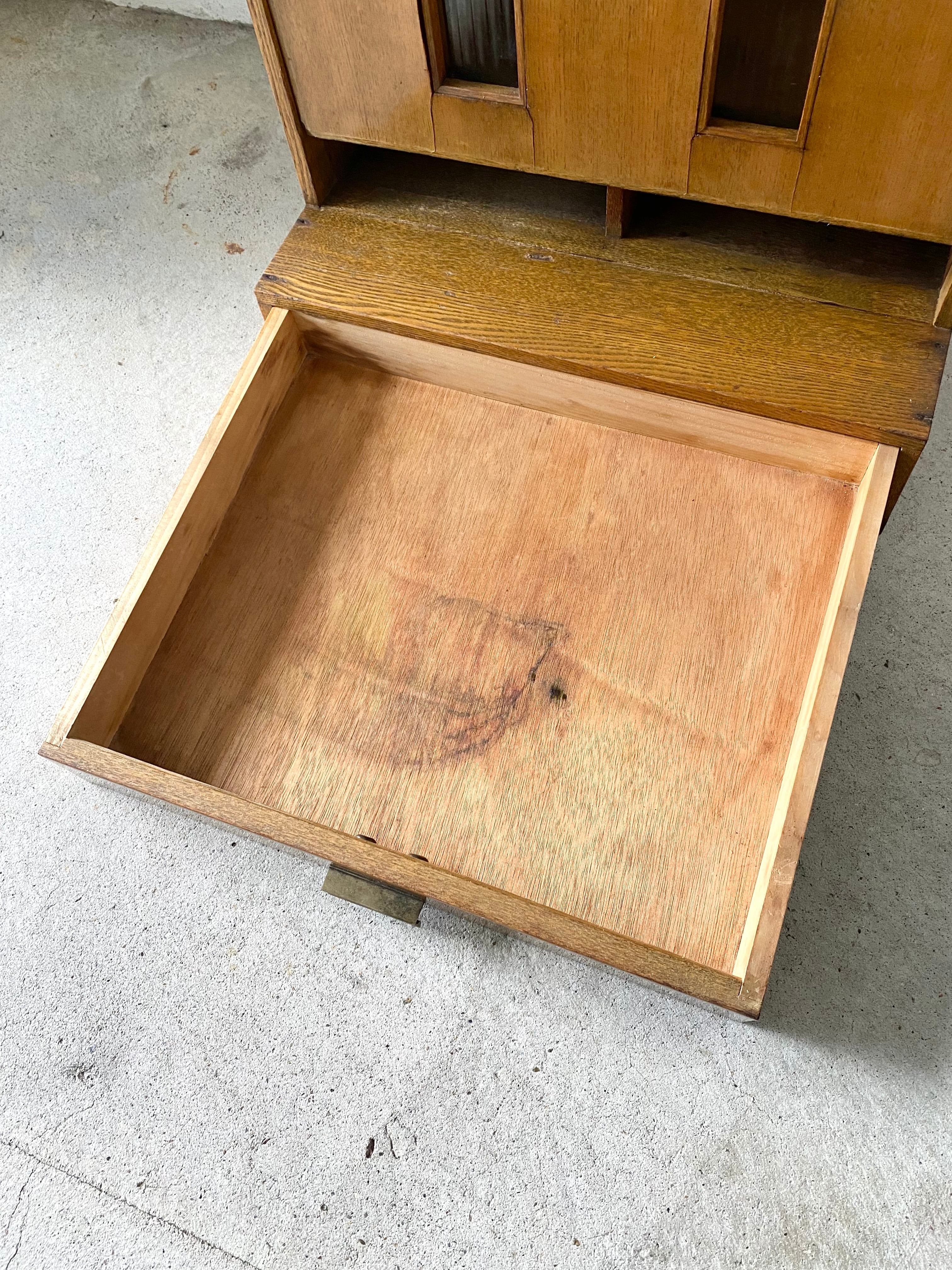 経年変化の味のある木肌と取手、個性のある姿が感じ良い収納棚。扉、引出しの開閉は比較的スムーズに行えます。リビングや趣味部屋で本や書物、細々した物の収納としても素敵です。