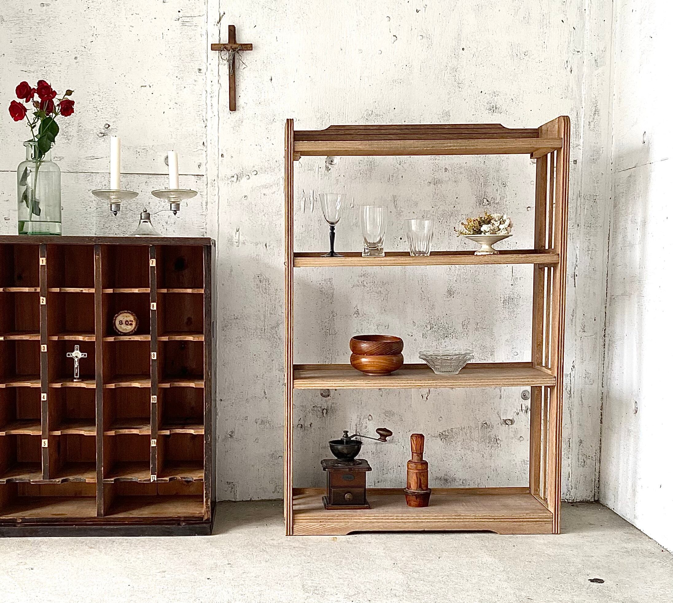 経年変化の古木の風合いが雰囲気良いシェルフ。リビングやアトリエなどでお気に入りのコレクションや本、植物を飾りながら収納したら、お店のような素敵な空間が演出出来そうです。