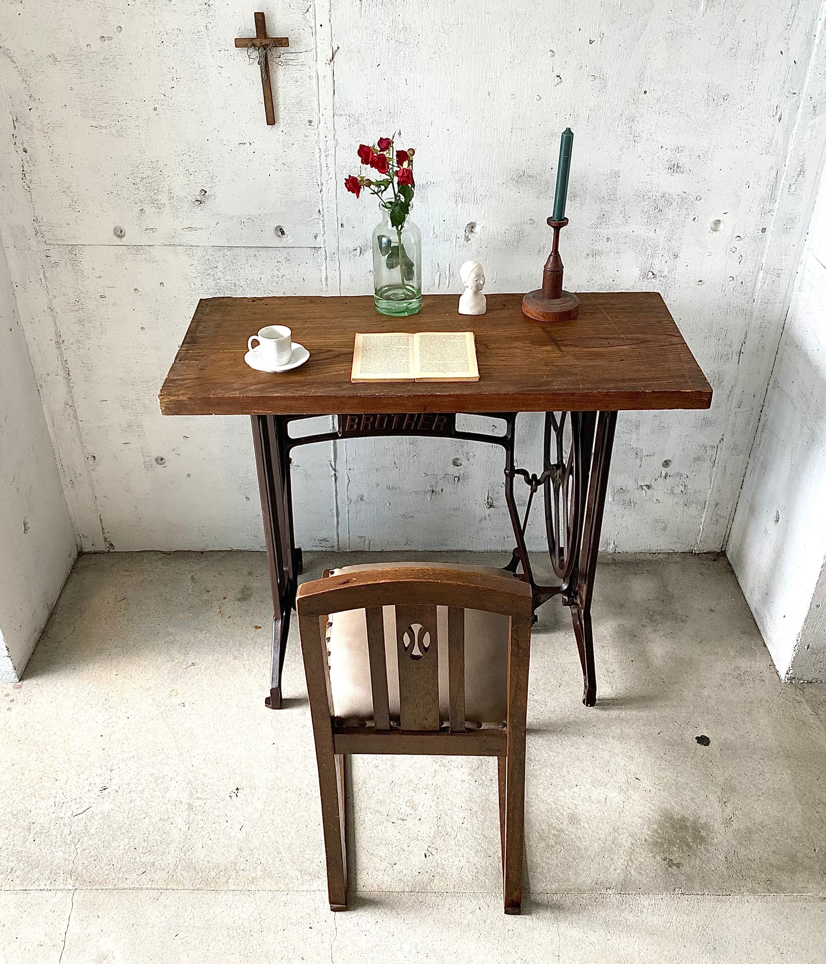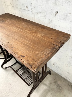 雰囲気の良い古材と古いミシン脚が良く馴染んだテーブル。少しのがたつきはありますが、状態は良いです。お部屋でお気に入りの植物や小物を飾るディスプレイ台としてや、日常の作業をするのに程よいサイズ感がオススメです。味のあるテーブルひとつプラスするだけで雰囲気あるお部屋作りが叶いそうです。