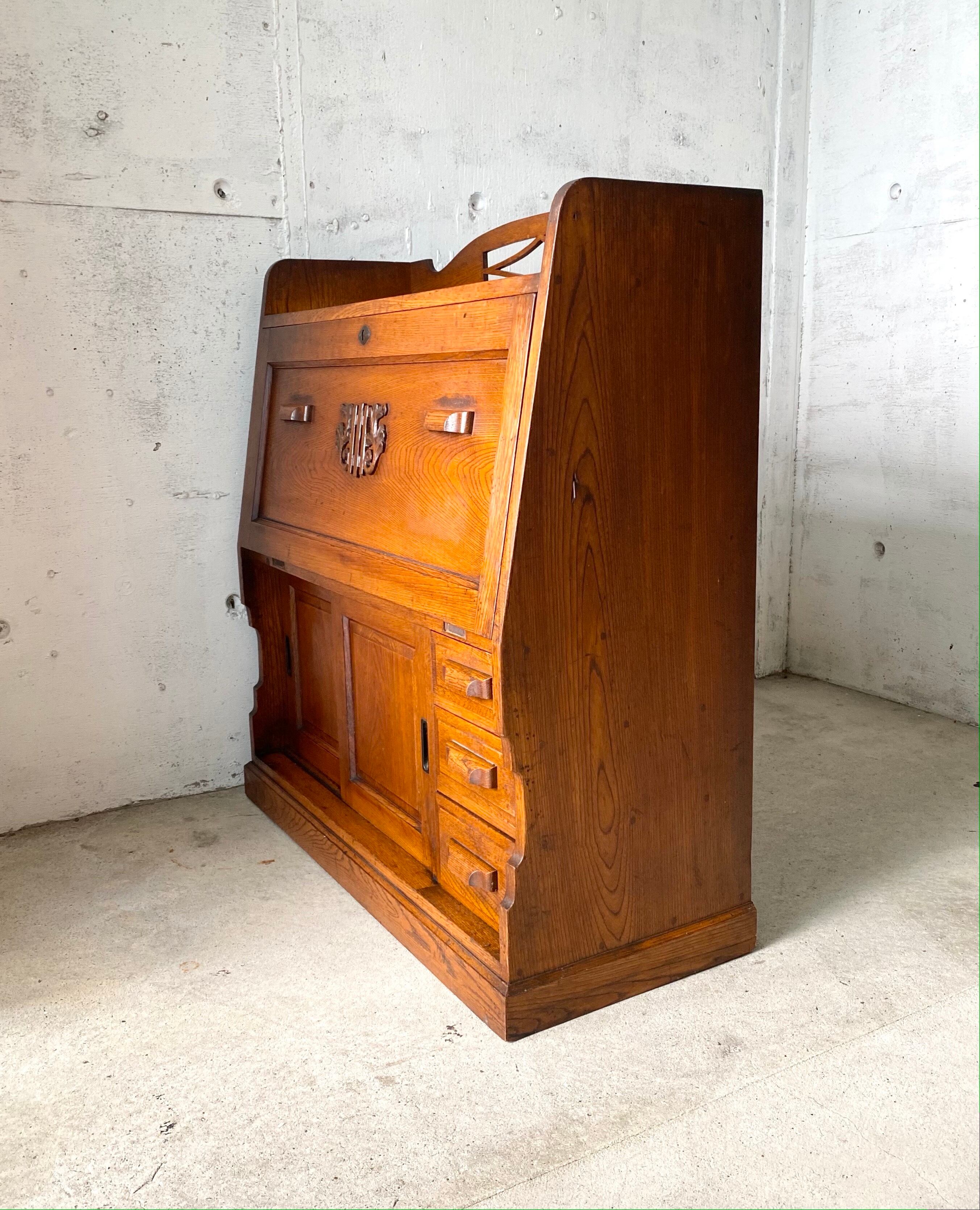 古い収納棚になります。スレや当たりキズ、禿げ、欠け、隙間、割れ、落としきれない汚れなどがあります。扉戸、引出しの開閉は比較的スムーズに行えます。全体的に状態も良いのでまだまだ活躍してくれます。