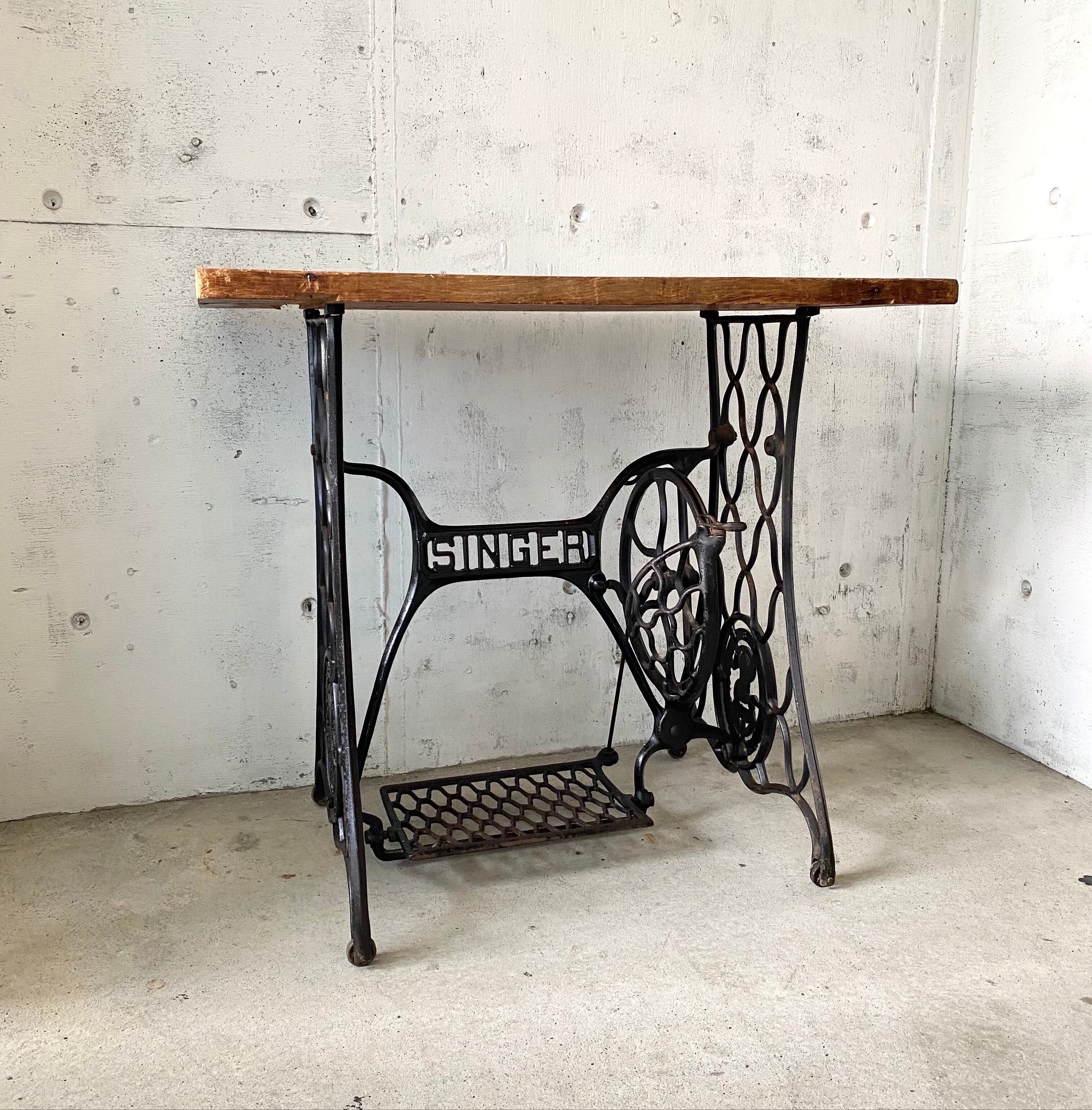 雰囲気の古材と古いシンガーミシン脚が良く馴染んだテーブル。少しのがたつきはありますが、状態は良いです。お部屋でお気に入りの植物や小物を飾るディスプレイ台としてや、日常の作業をするのに程よいサイズ感がオススメです。味のあるテーブルひとつプラスするだけで雰囲気あるお部屋作りが叶いそうです。