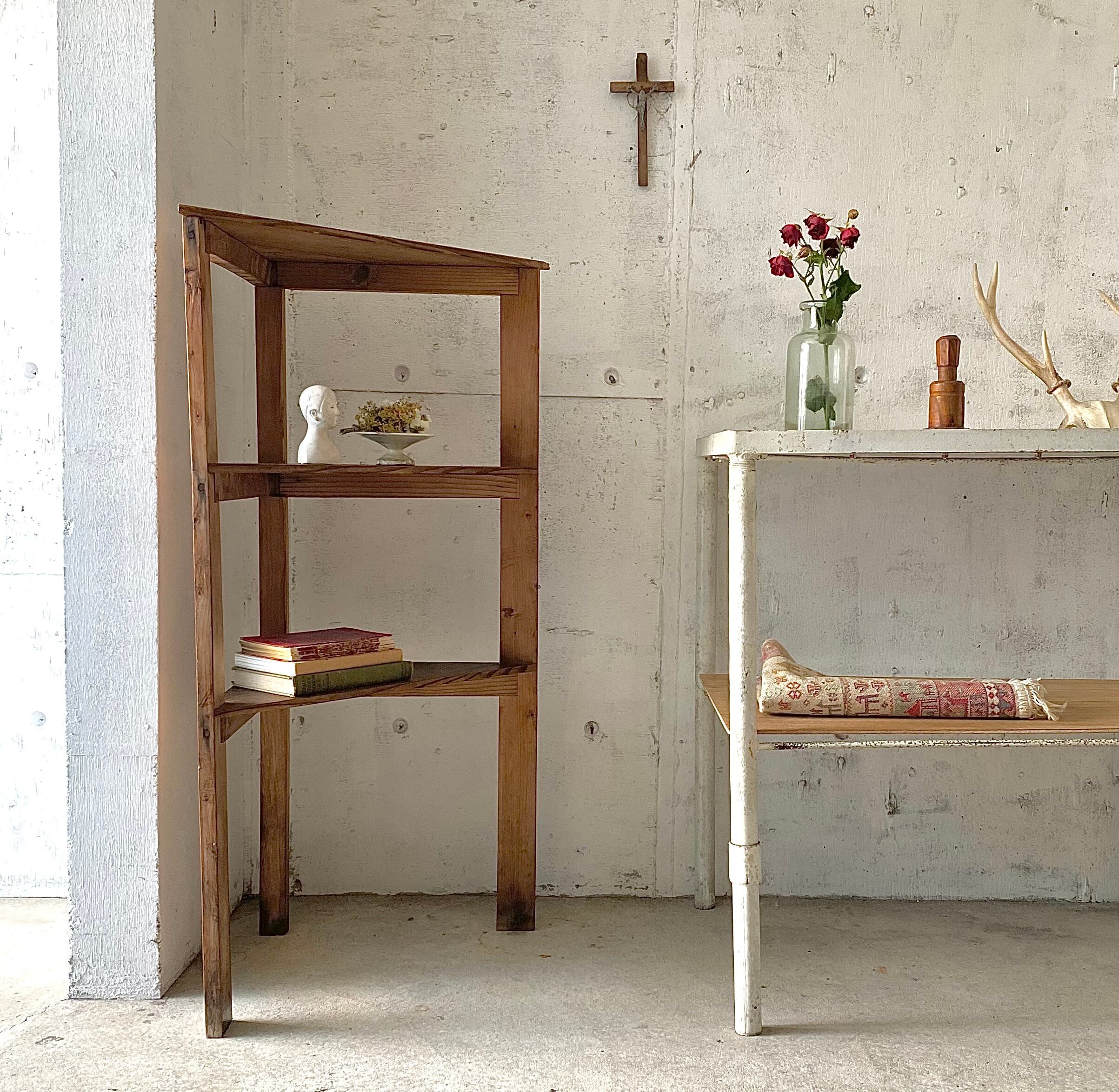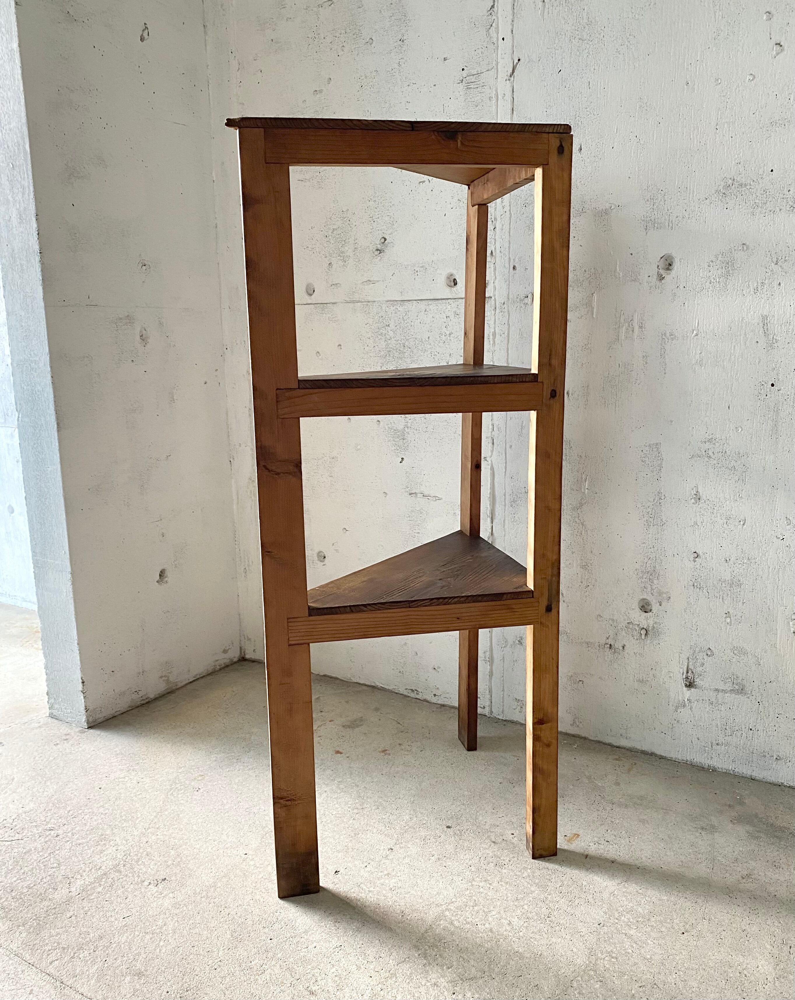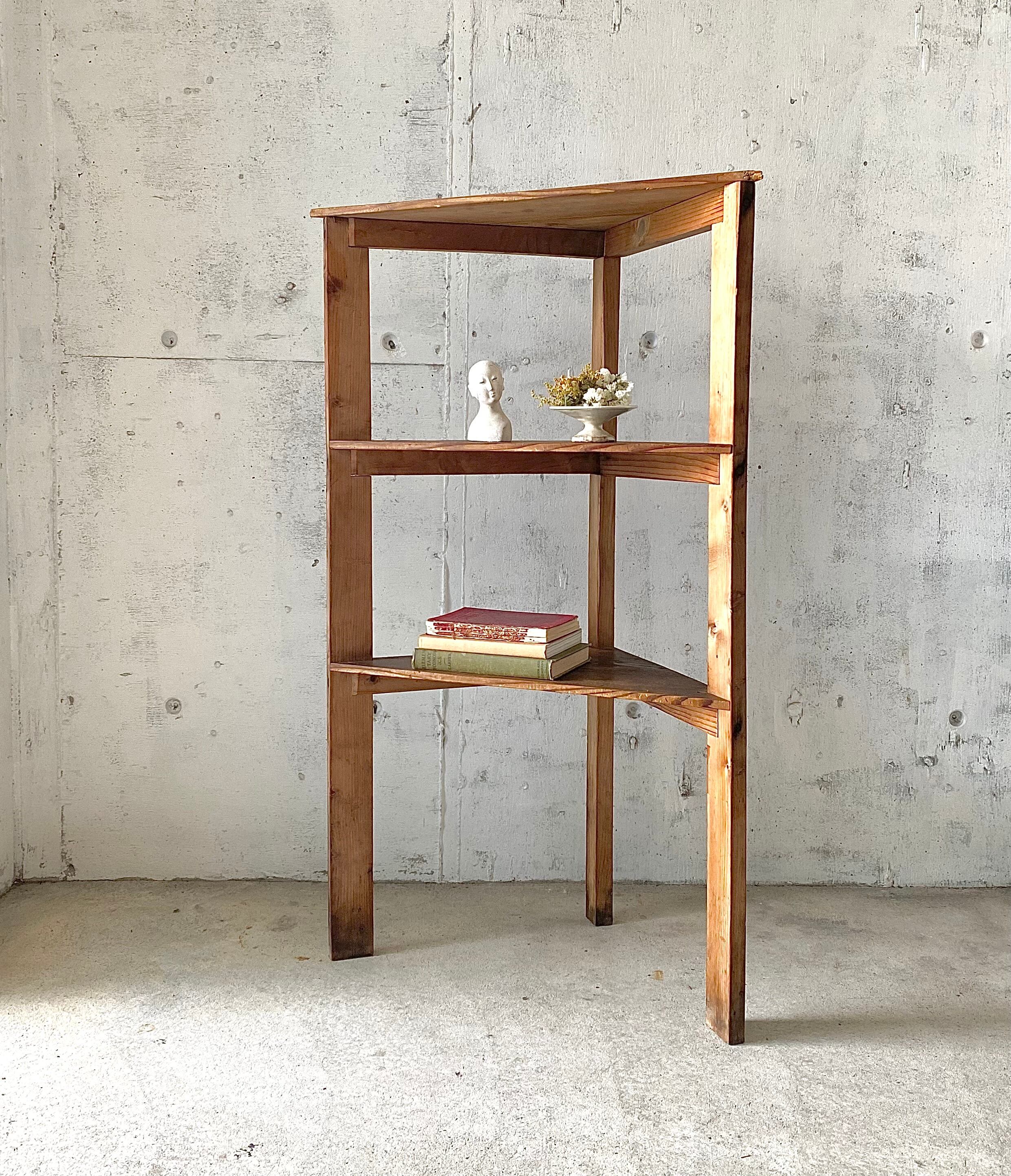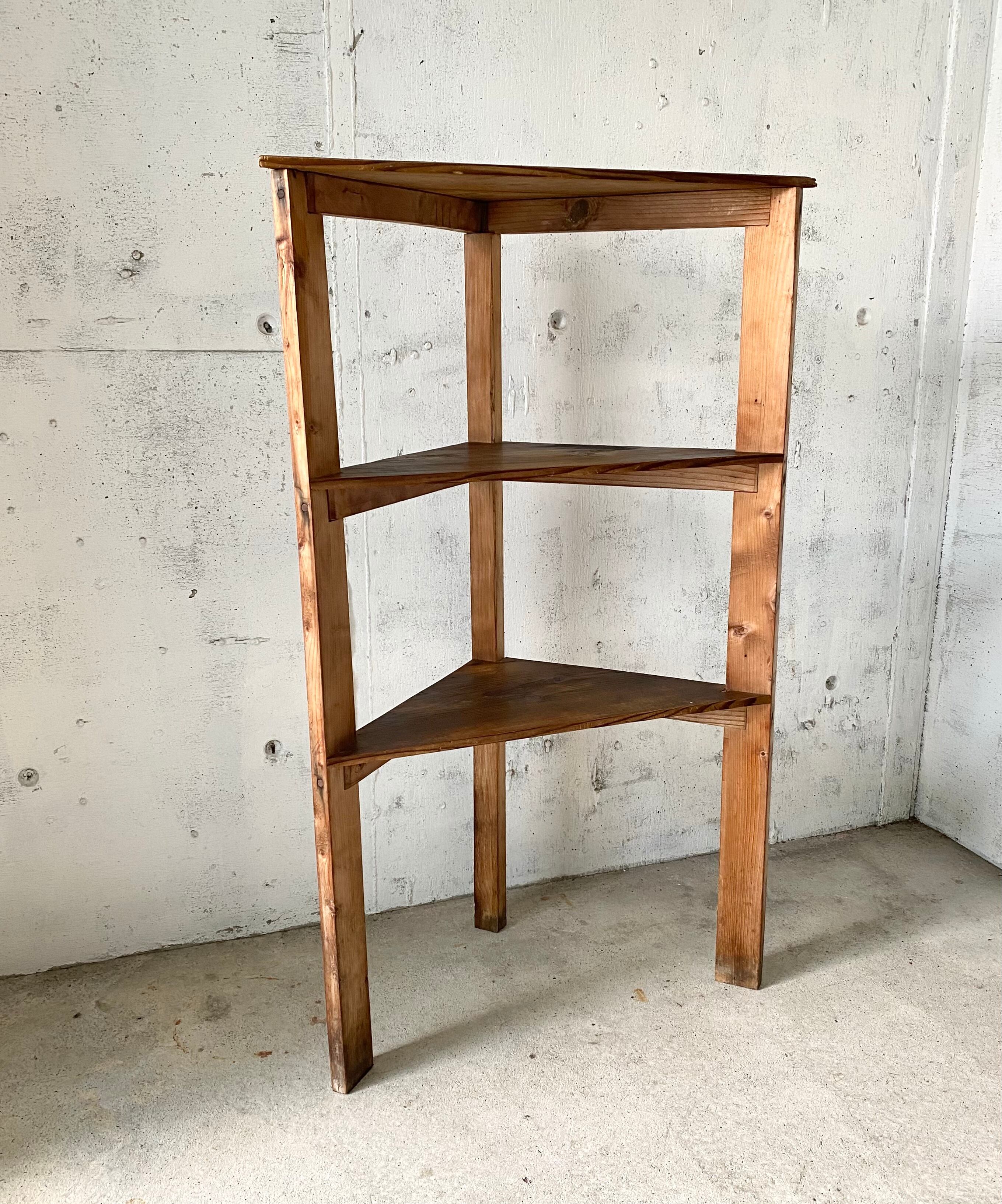 経年変化の古木の風合いが魅力的なコーナーラック。少しのがたつきはありますが状態は良いです。リビングや趣味部屋、玄関先のコーナーに置いて小物やカギなどを置くラックとしてや、キッチンで食器や調味料のストック棚としても素敵です。