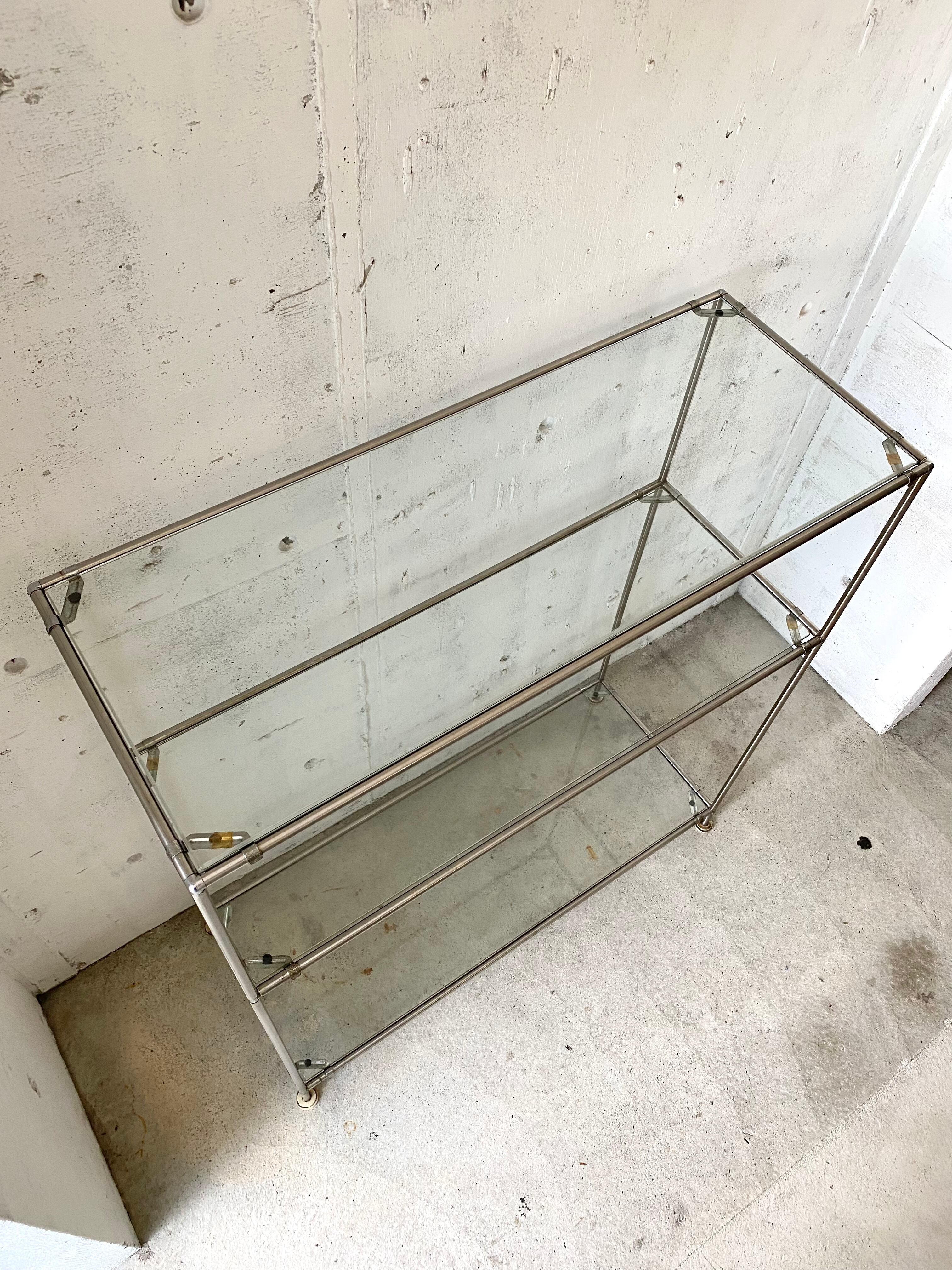 ガラス板と細身の綺麗なシルエットのフレーム、すっきりとした姿が感じ良いシェルフ。キッチンで食器や調味料のストック棚としてや、リビングや趣味でお気に入りのコレクションや植物をディスプレイする棚としても素敵です。