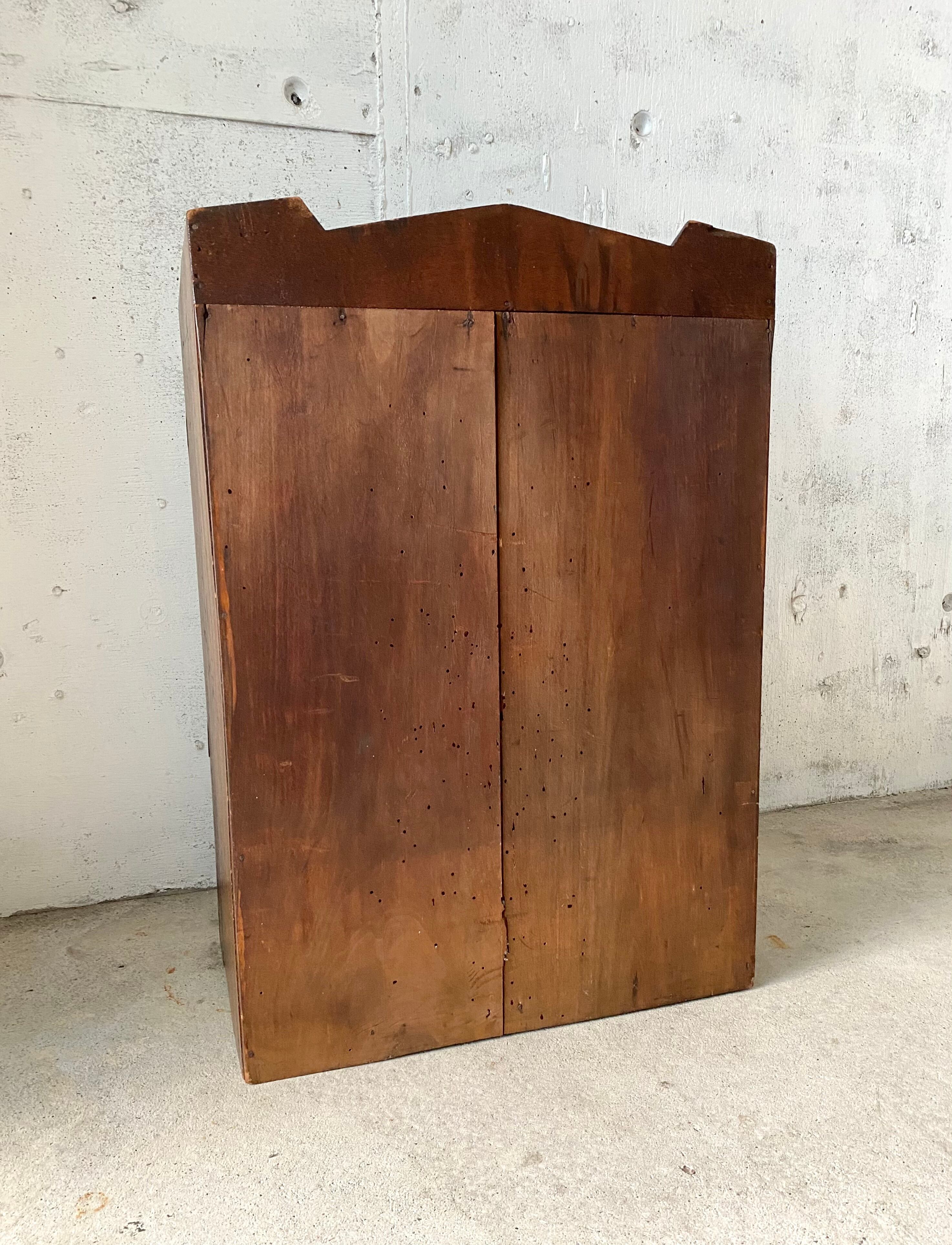 古い収納棚になります。スレや当たりキズ、禿げ、欠け、隙間、穴、サビ、虫食い、割れ、落としきれない汚れなどがあります。全体的に状態も良いのでまだまだ活躍してくれます。