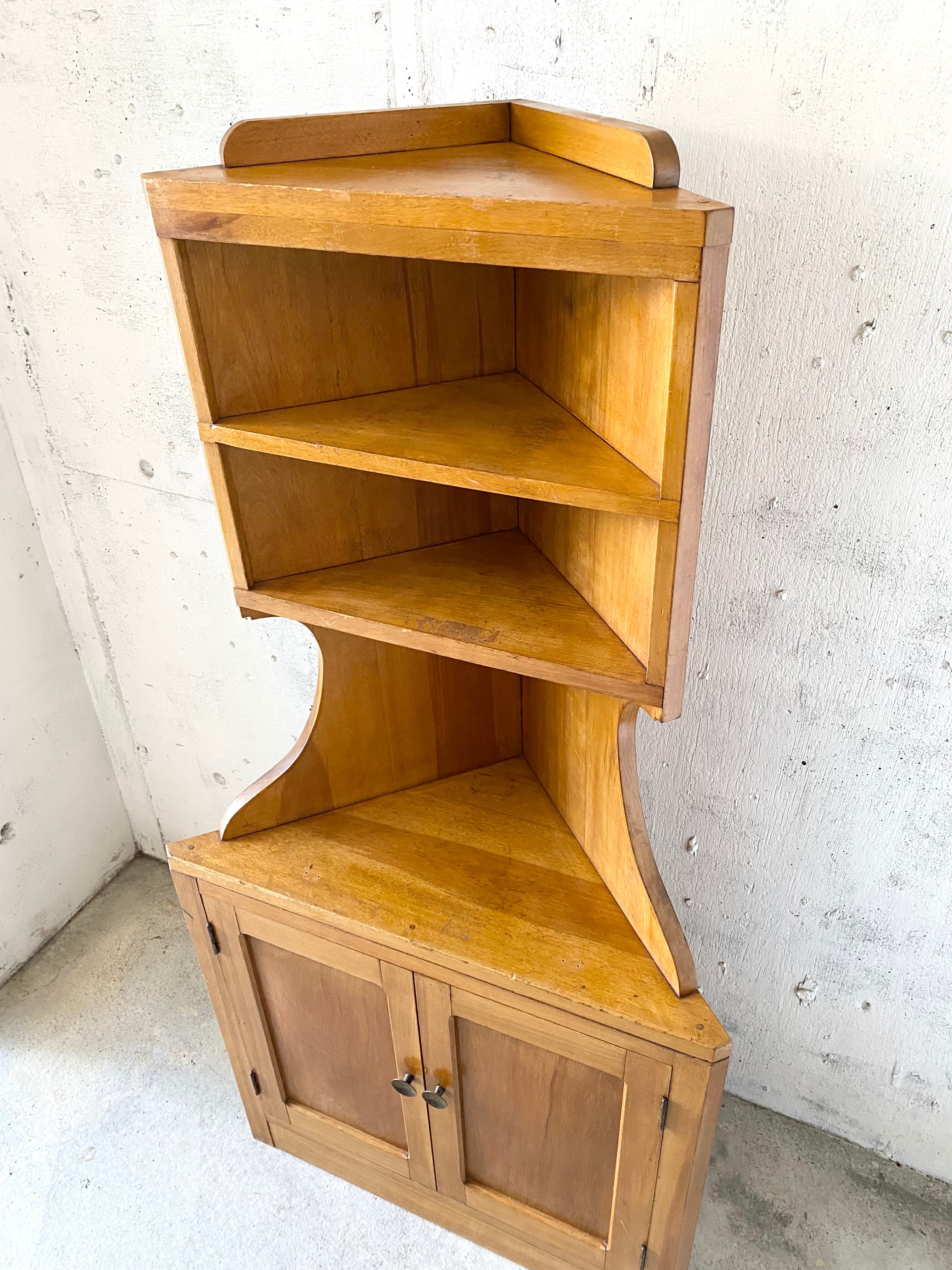 経年変化の雰囲気良い木肌と取手、個性のある姿が感じ良いコーナーラック。リビングや趣味部屋、玄関先のコーナーに置いて小物やカギなどを置くラックとしてや、キッチンで食器や調味料のストック棚としても素敵です。
