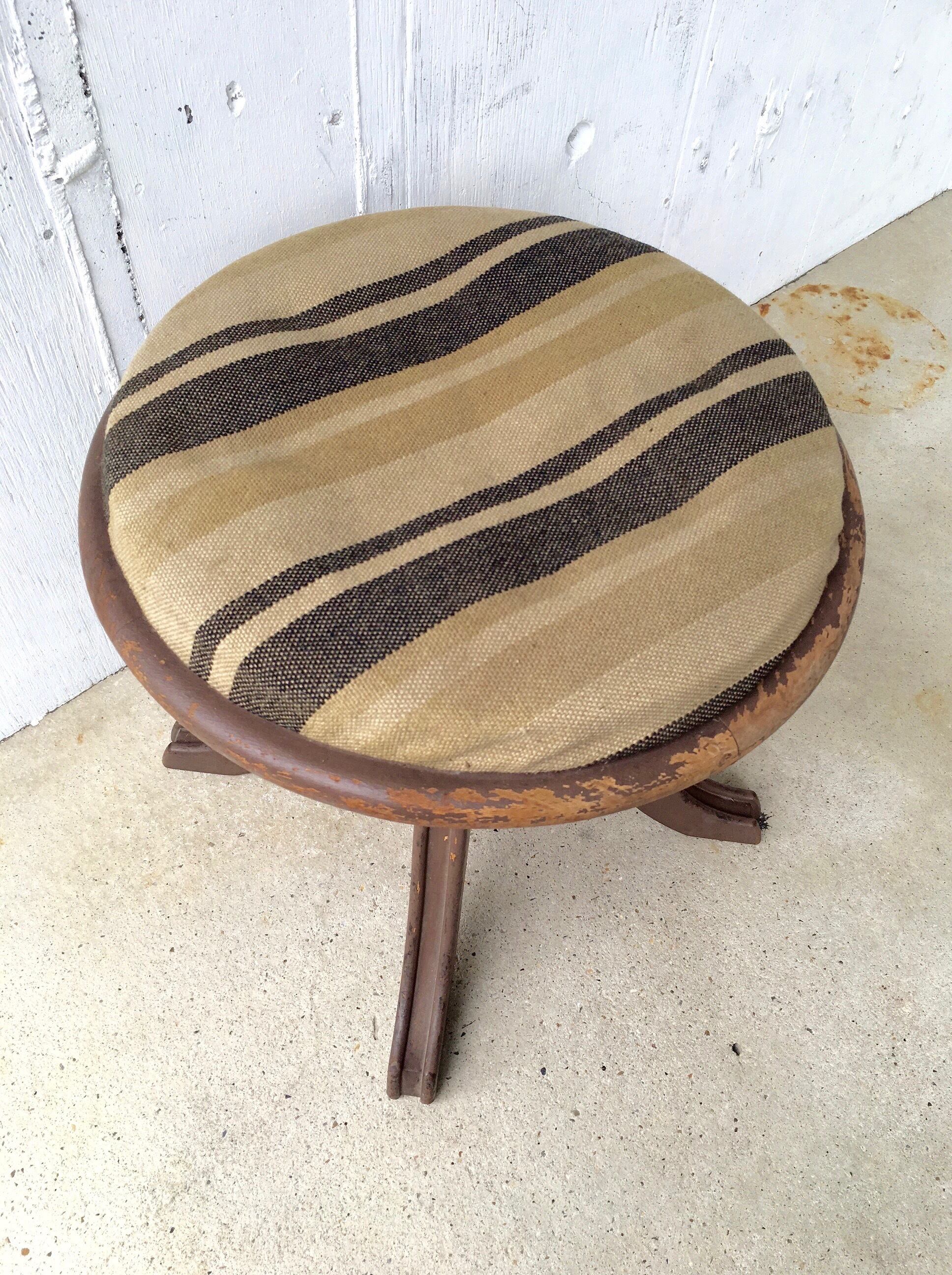 愛らしい佇まいのインダストリアルな回転椅子です。 縞模様の座面と無骨なアイアン脚が魅力的なひと品。特に目立ったがたつきはありません。お店やお部屋のインテリアにそっと馴染んでくれる 、すてきな雰囲気のアイテムです。
