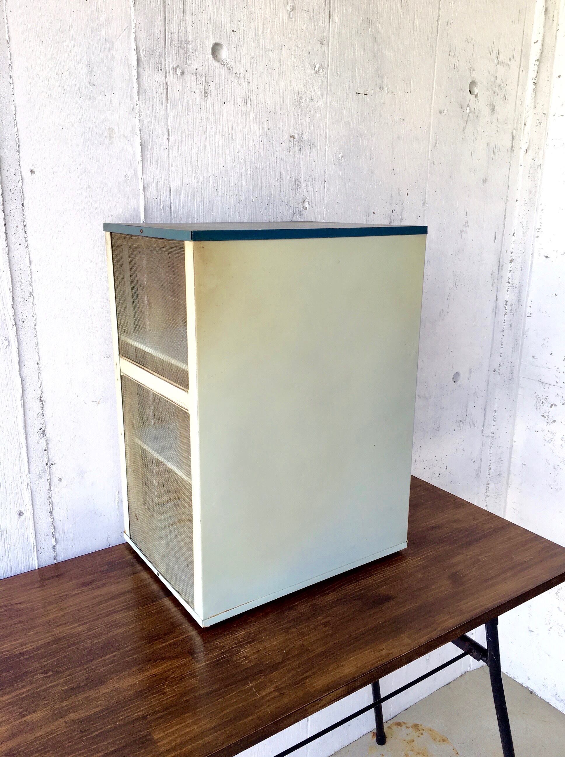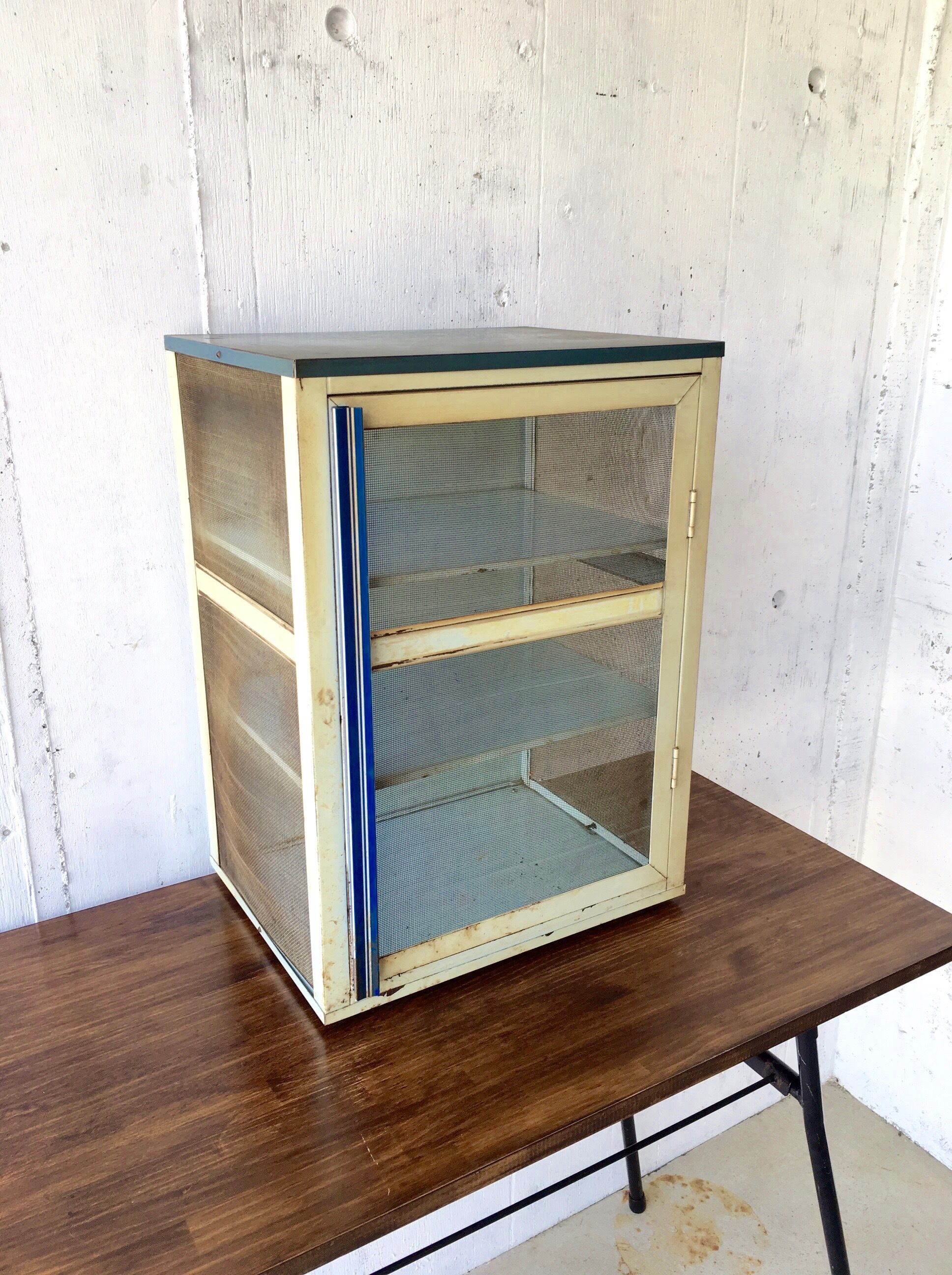 古い収納棚になります。スレや剥げ、当たりキズ、サビ、落としきれない汚れなどがあります。扉の開閉も比較的スムーズに行えます。全体的に状態も良くしっかりとしていて、まだまだ実用的に活躍してくれます。