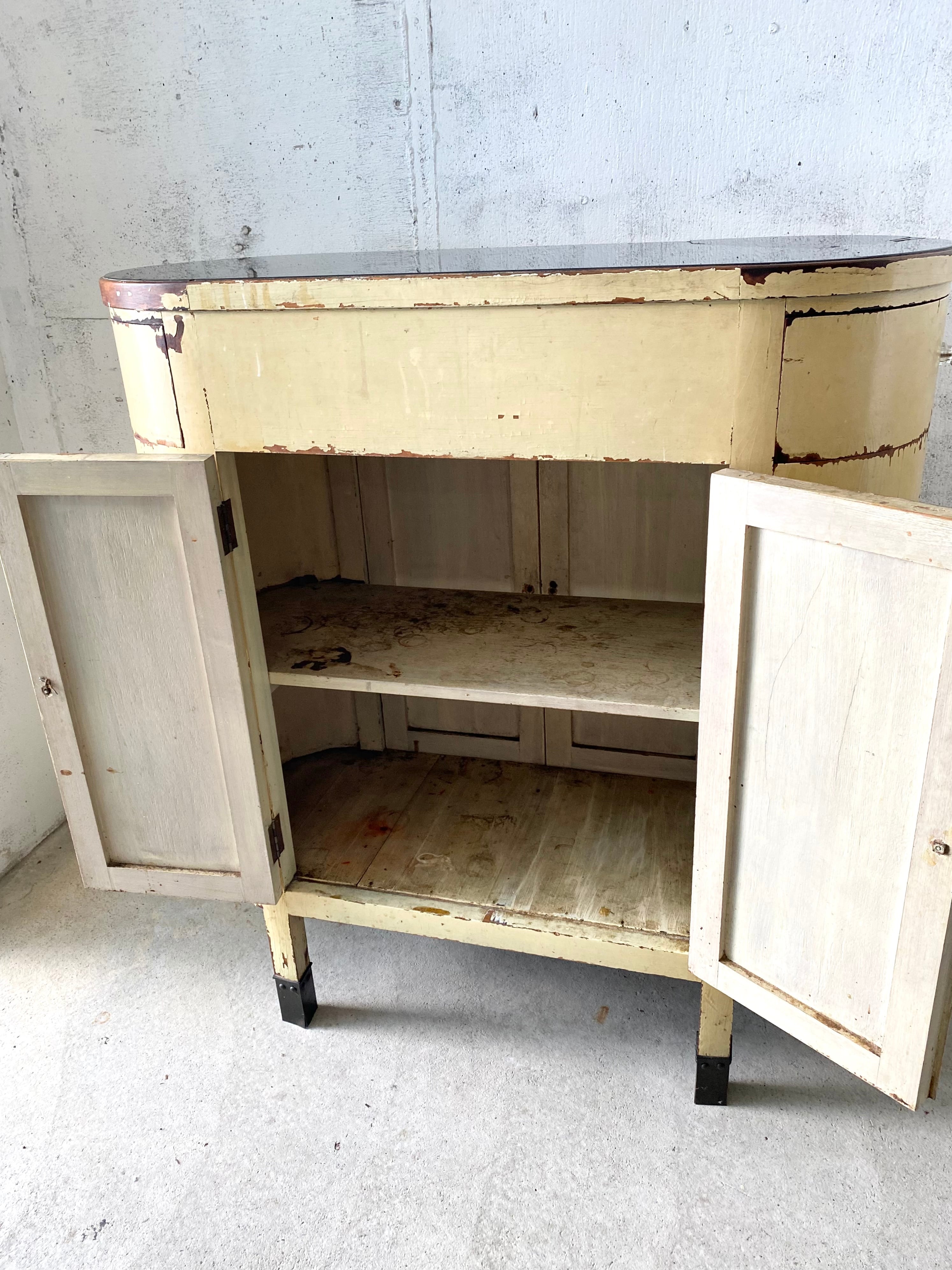 古いカウンターシェルフになります。スレや欠け、当たりキズ、割れ、天板の割れ、反り、サビ、隙間、落としきれない汚れなどがあります。扉、引出しの開閉は比較的スムーズに行えます。どっしりと重量感があり、全体的に状態も良いのでまだまだ実用的に活躍してくれます。
