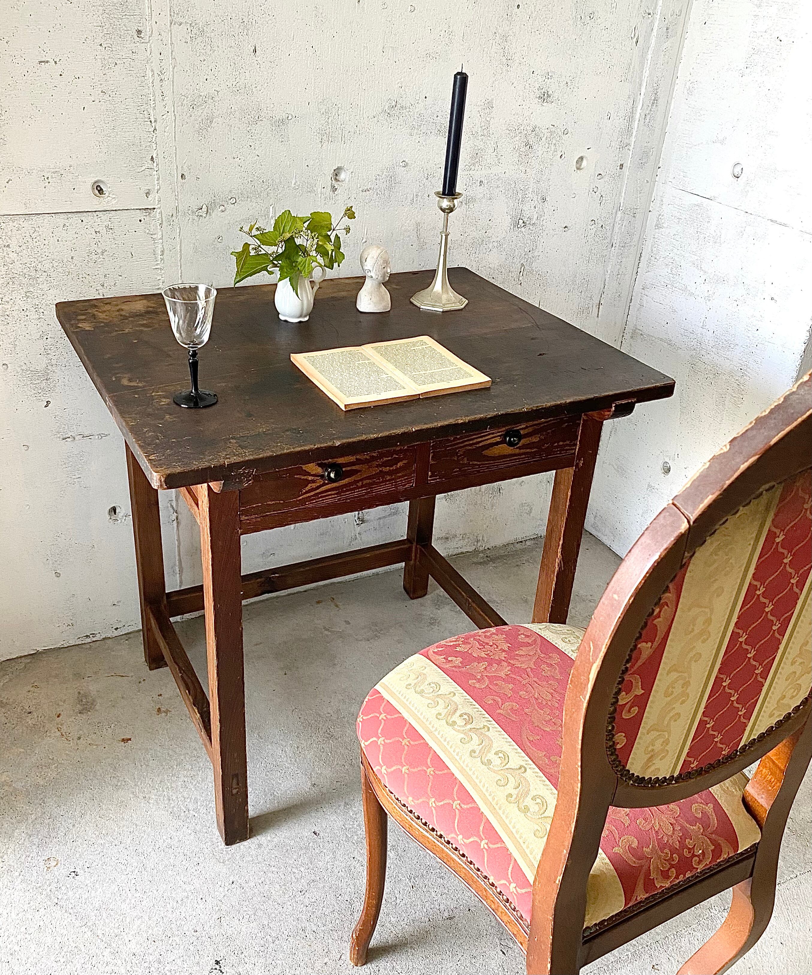 経年変化の雰囲気ある木肌と取手、すっきりとした姿が感じ良い木製デスク。アトリエで作業をするデスクとしてや、子供部屋でお子さんの勉強机としても素敵です。