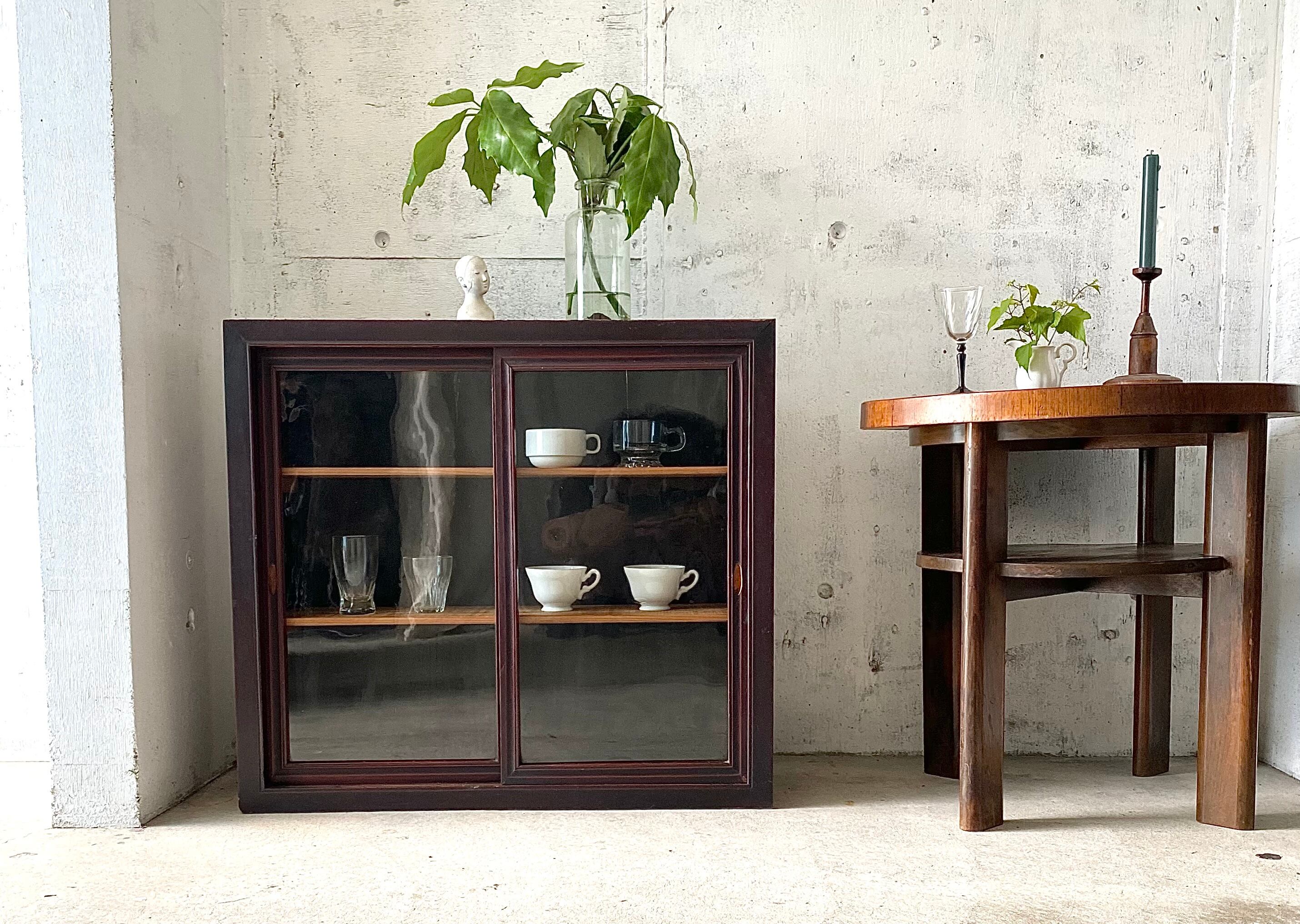 経年変化の落ち着きある木肌、ガラス引戸が雰囲気良い収納棚。引戸の開閉は比較的スムーズに行えます。キッチンで食器や調味料の収納としてや、リビングで本や小物の収納としても素敵です。