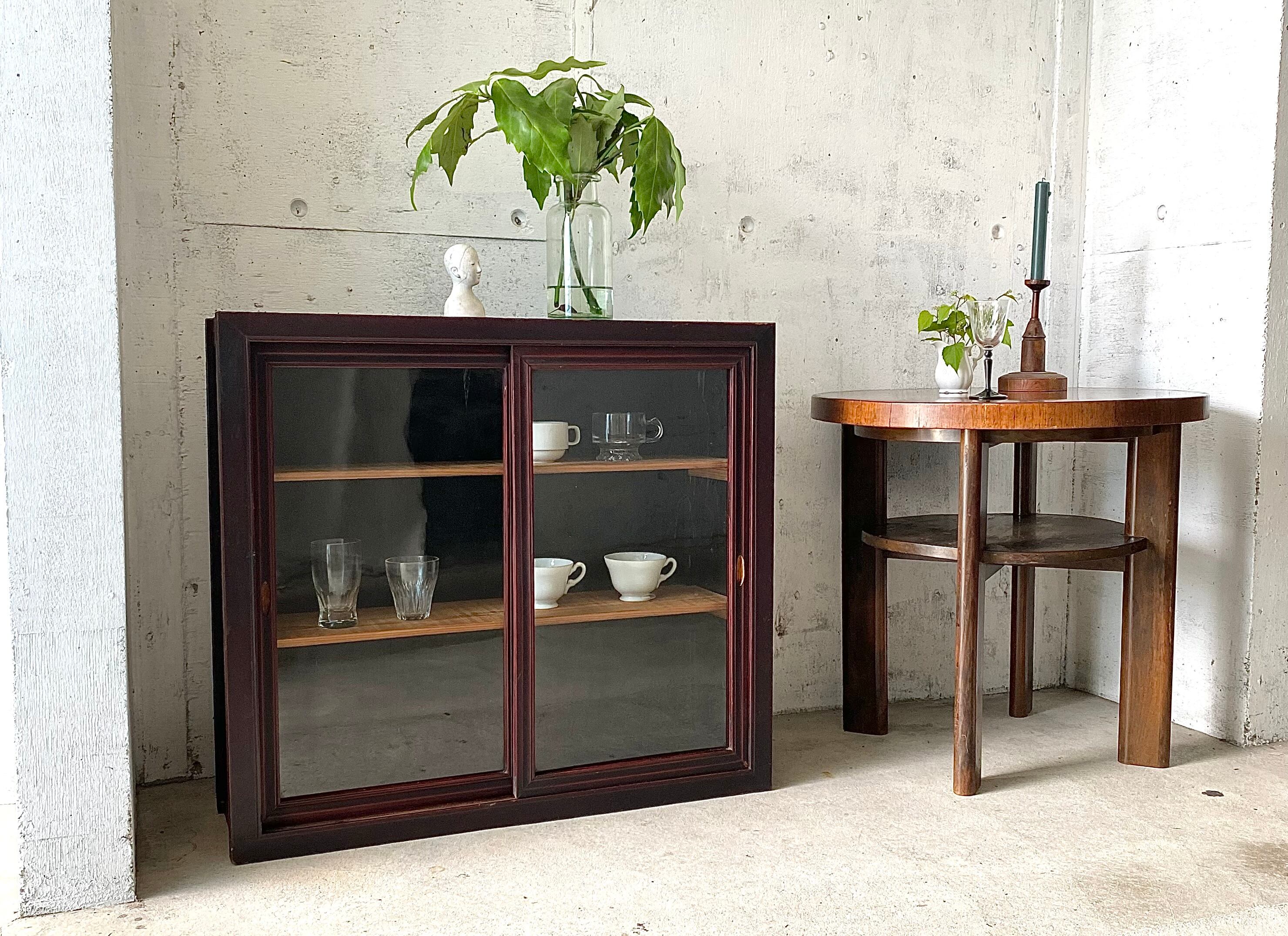 落ち着きある姿のガラス引戸収納棚[古家具]