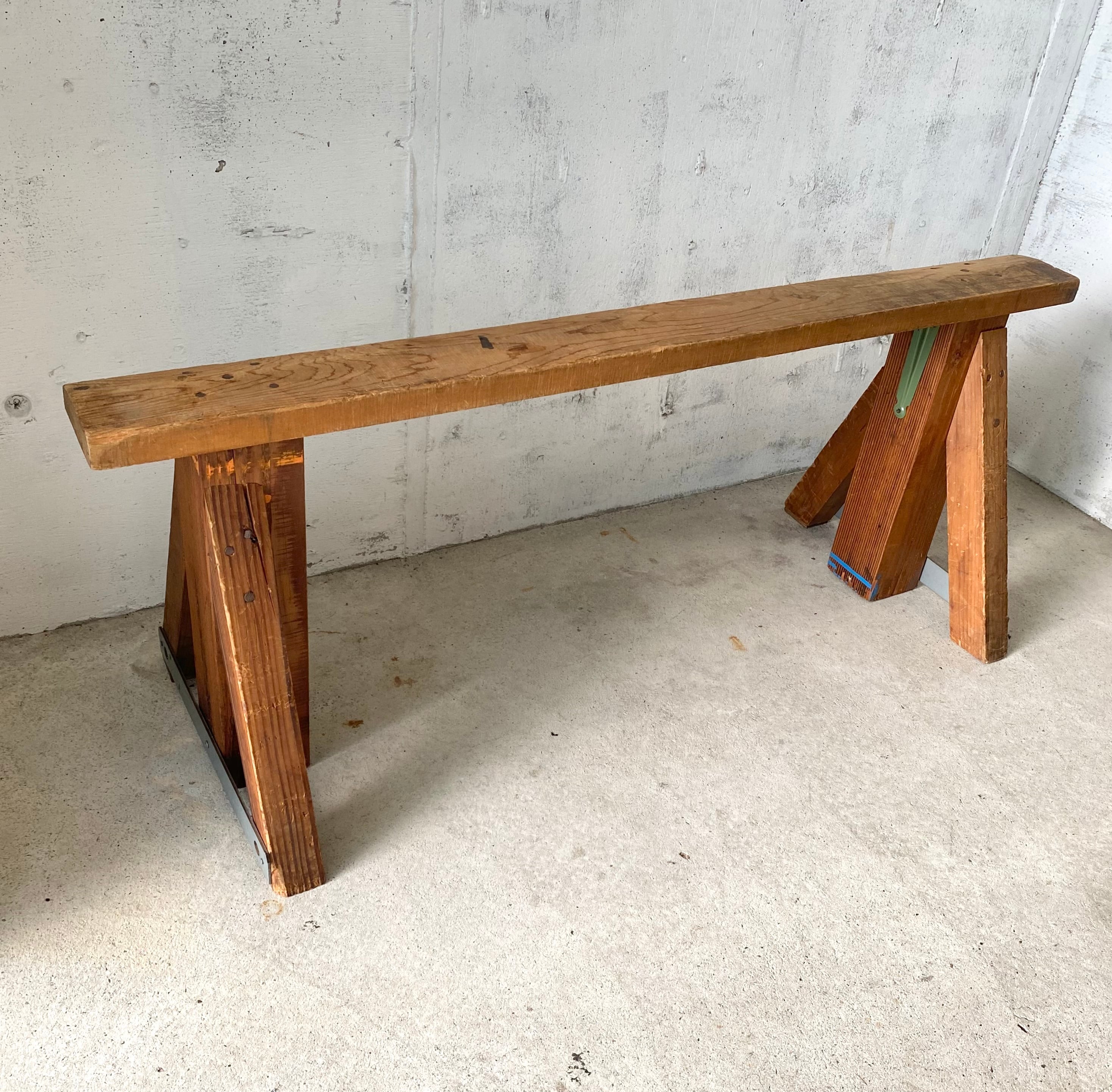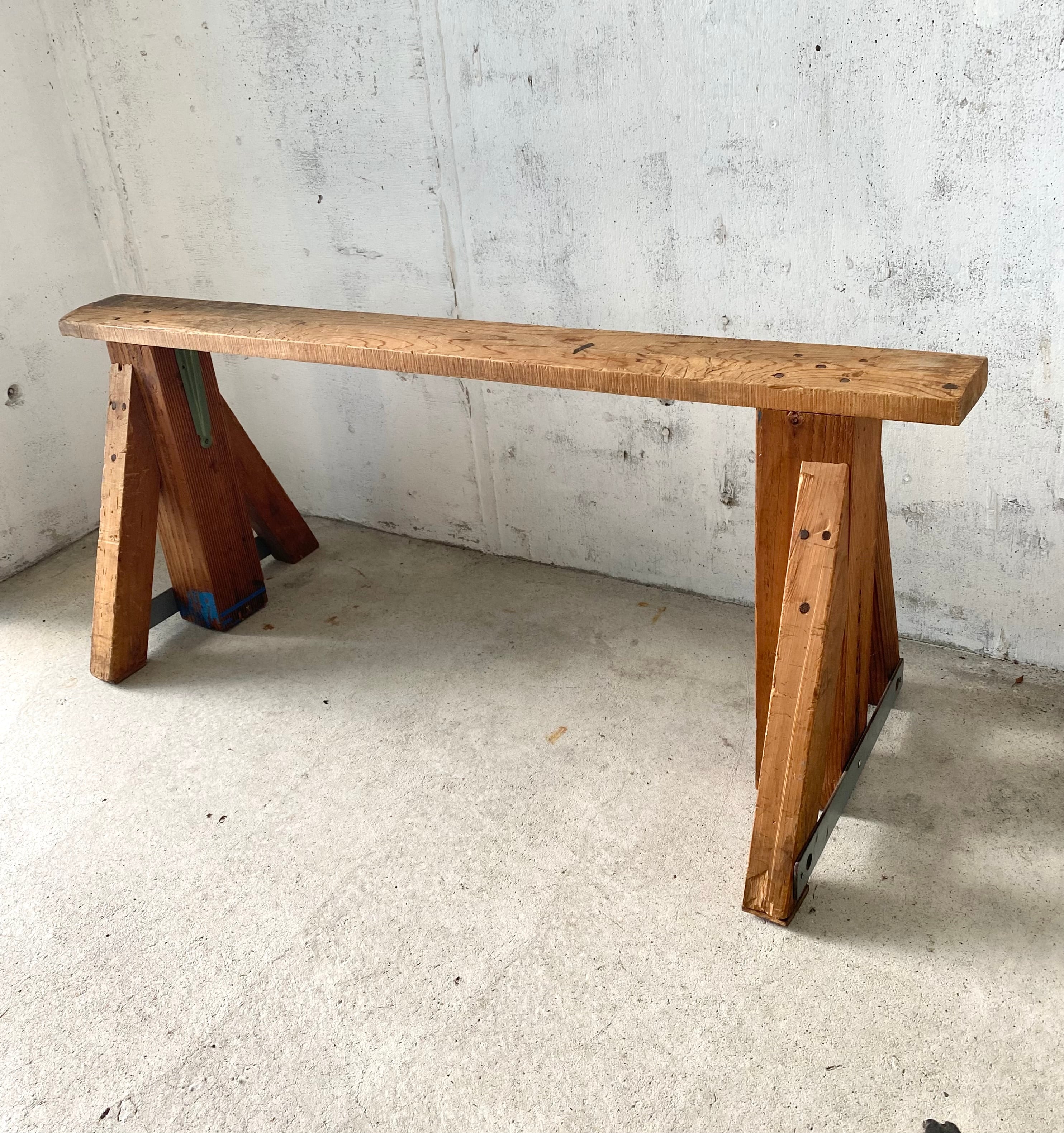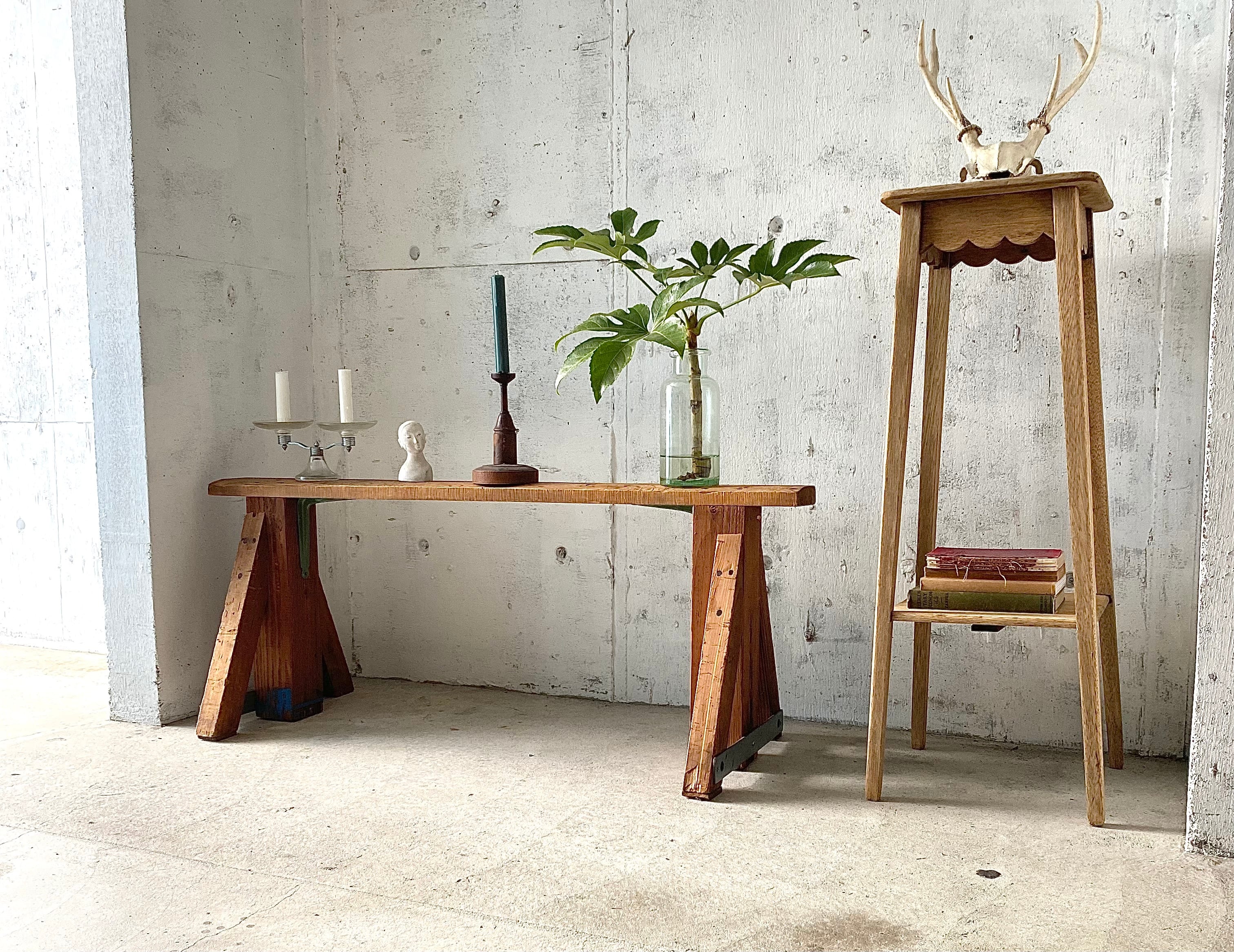 経年変化の古木の風合いと味のある金具、横幅のある姿が感じ良い飾り台。リビングやガーデニングでお気に入りの植物や小物を飾る台としてや、玄関先のベンチとしても活躍してくれそうです。