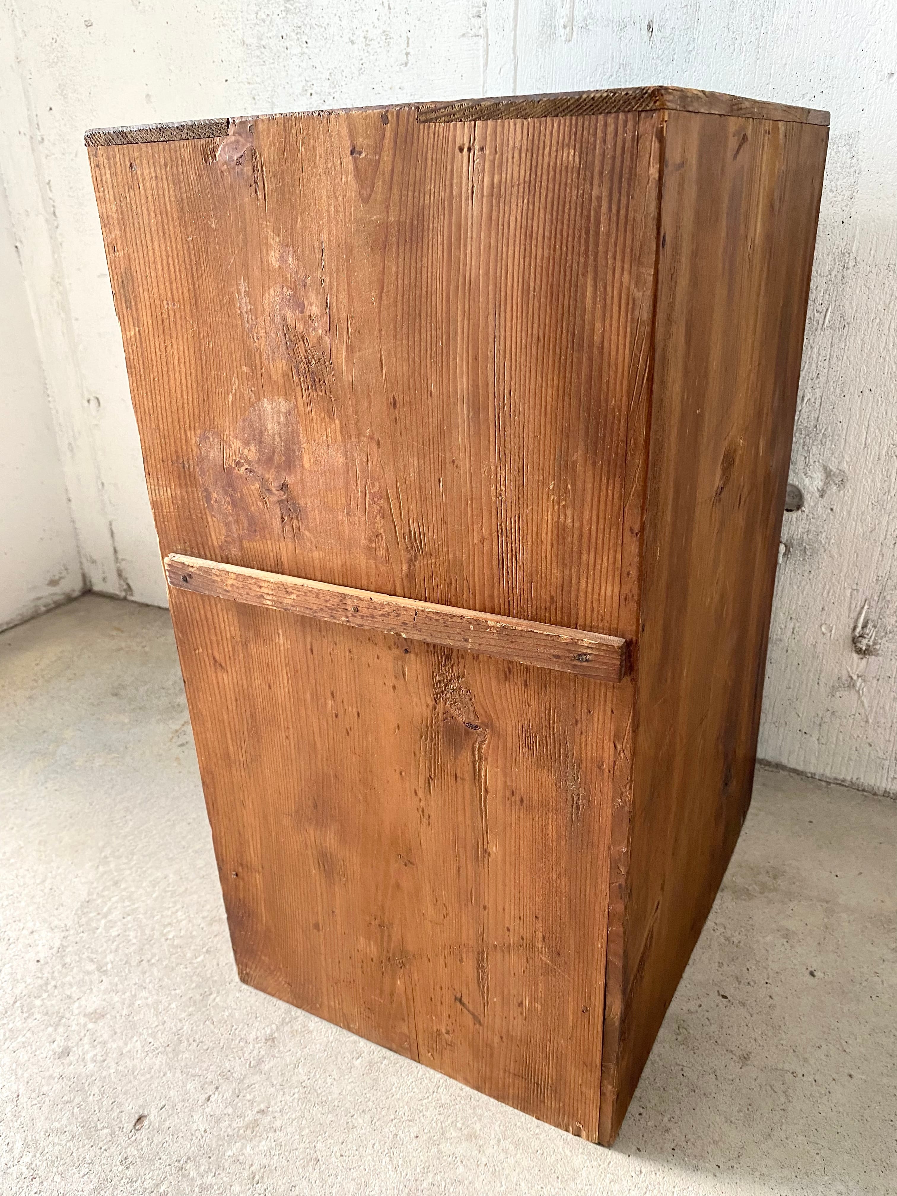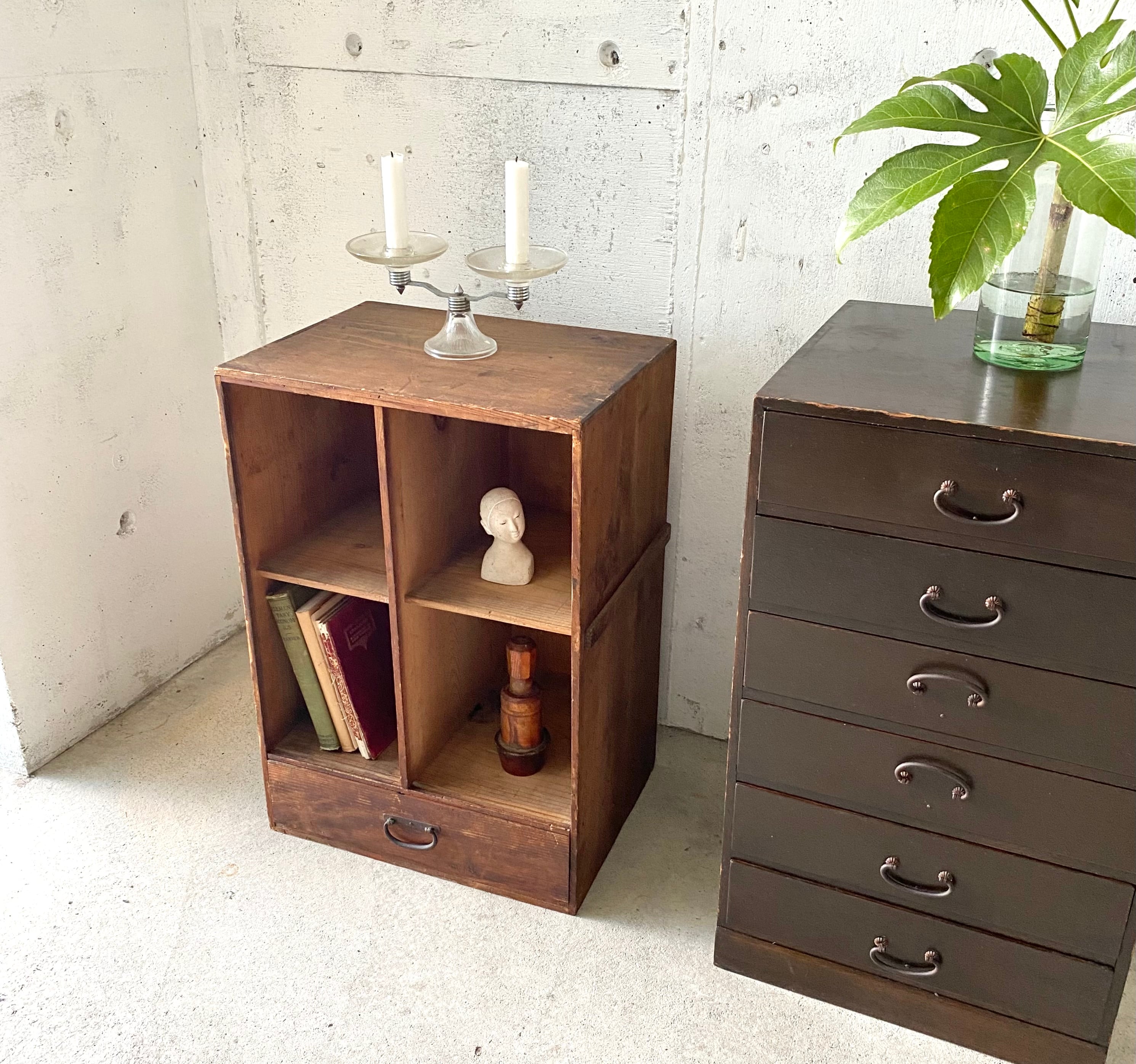 古い仕切り棚になります。スレや欠け、当たりキズ、割れ、禿げ、隙間、サビ、落としきれない汚れなどがあります。引出しの開閉は比較的スムーズに行えます。全体的に状態も良いのでまだまだ実用的に活躍してくれます。