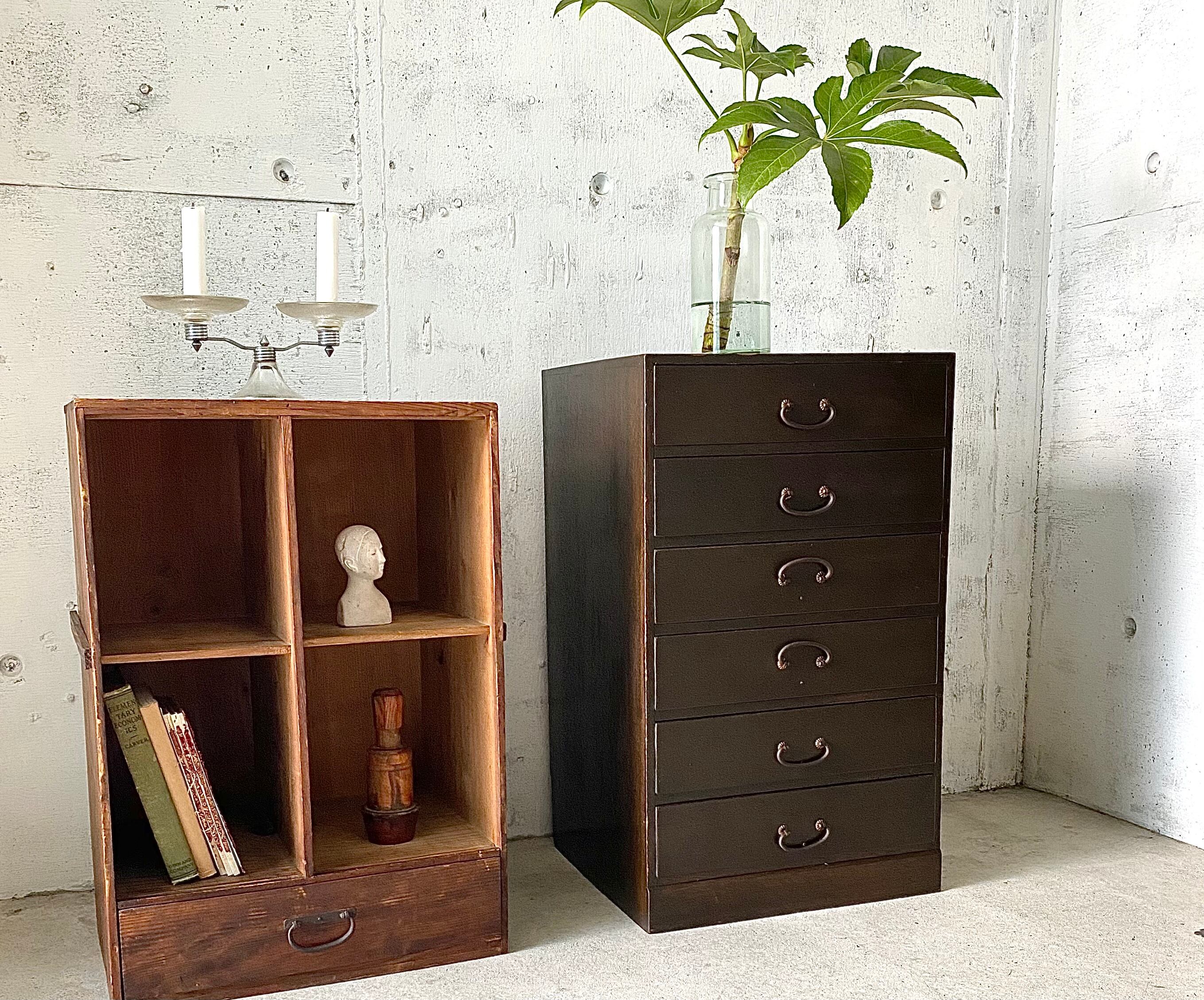経年変化の味のある木肌と取手、落ち着きある佇まいが感じ良い収納棚。引出しは6杯あり収納力も十分です。作業スペースやリビングで紙物や書類、細々した物の収納としても活躍してくれそうです。