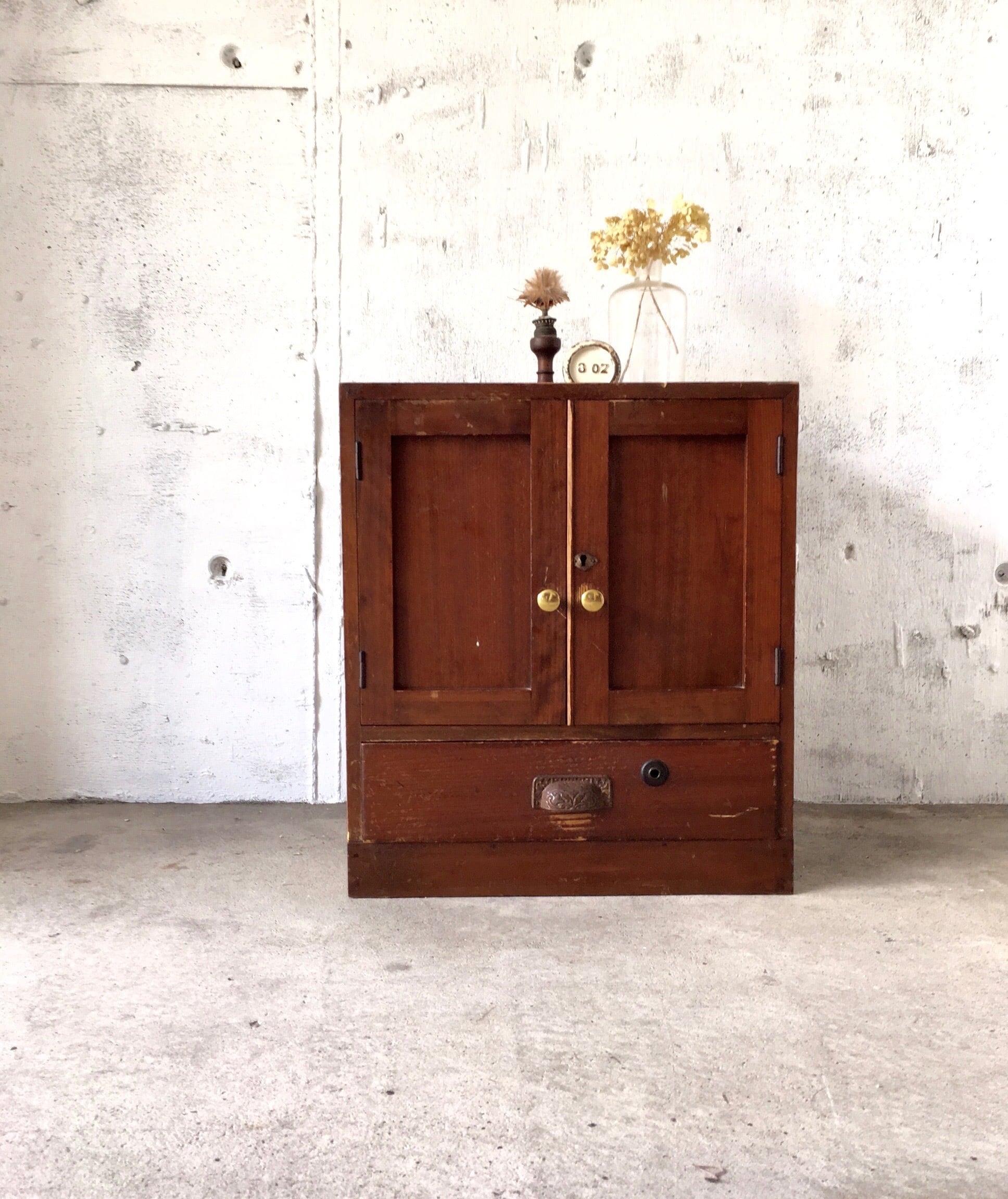 経年変化の使い込まれた木の風合いと味のある真鍮取手が魅力的な収納棚。収納力もたっぷりで使い勝手も良いです。扉、引出しの開閉もスムーズに行え、日常気軽にお使いいただけます。キッチンで小皿などの食器のストック棚に使ってみたり、リビングで本や小物、紙物などの整理に使ってみても素敵です。お部屋に合った使い方でいろいろとお楽しみください。