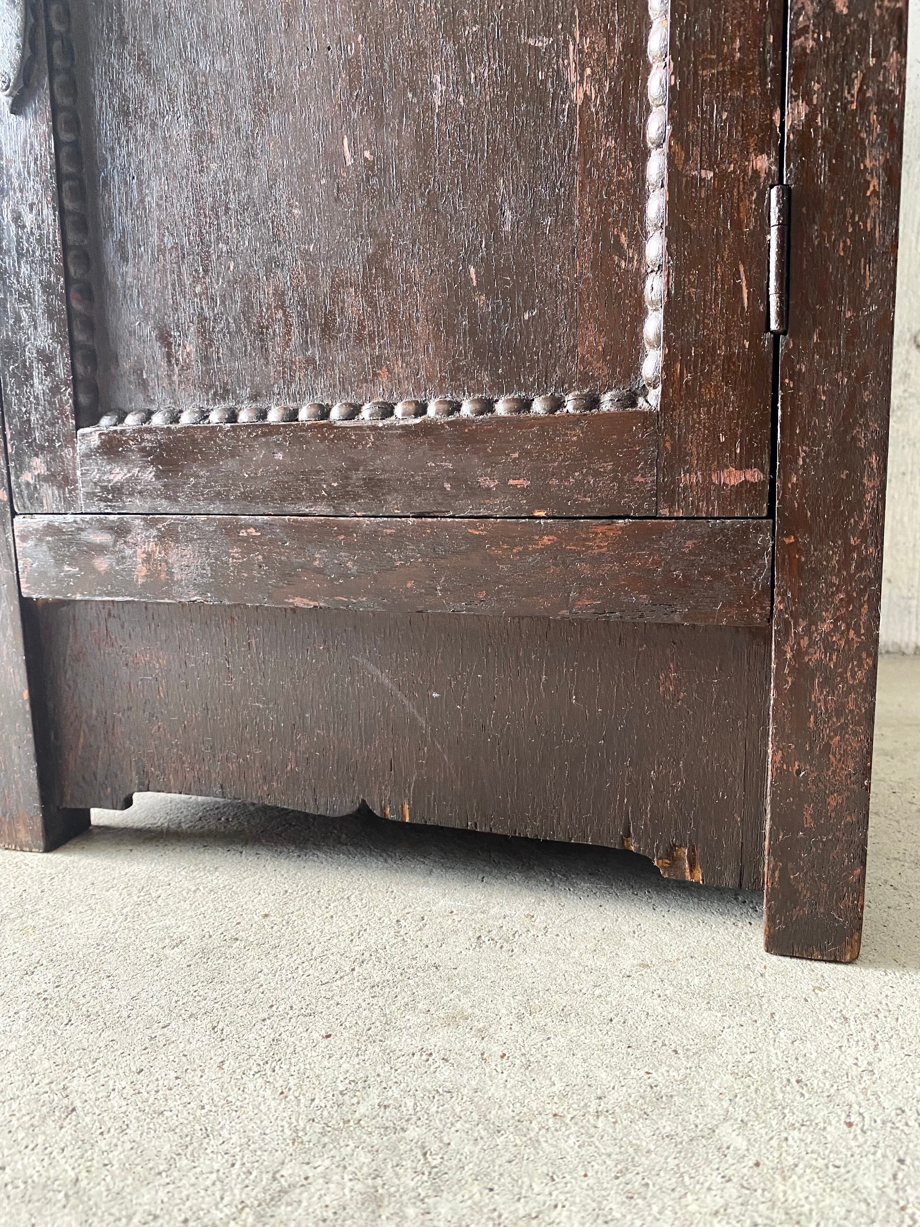 古い飾り台になります。スレや欠け、当たりキズ、割れ、禿げ、隙間、サビ、落としきれない汚れなどがあります。扉、引出しの開閉は比較的スムーズに行えます。全体的に状態も良いのでまだまだ実用的に活躍してくれます。