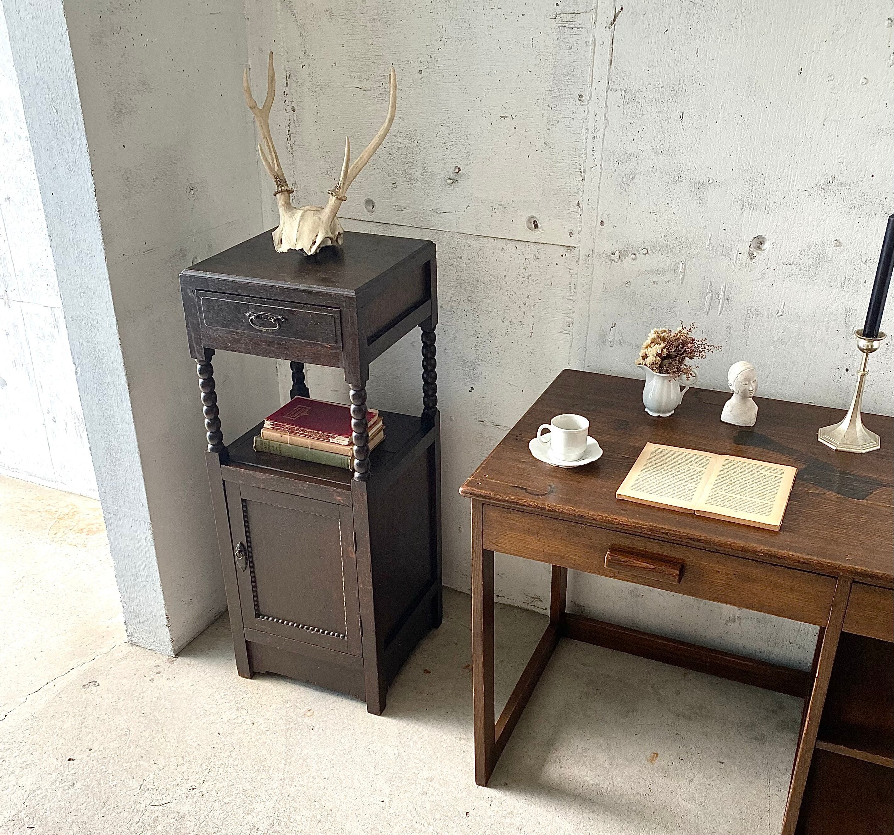 経年変化の味のある木肌と取手、個性のある姿が感じ良い飾り台。引出し、扉の開閉は比較的スムーズに行えます。玄関先やリビングで植物や小物を飾る台としてや、寝室で卓上ライトを置く台としても素敵です。