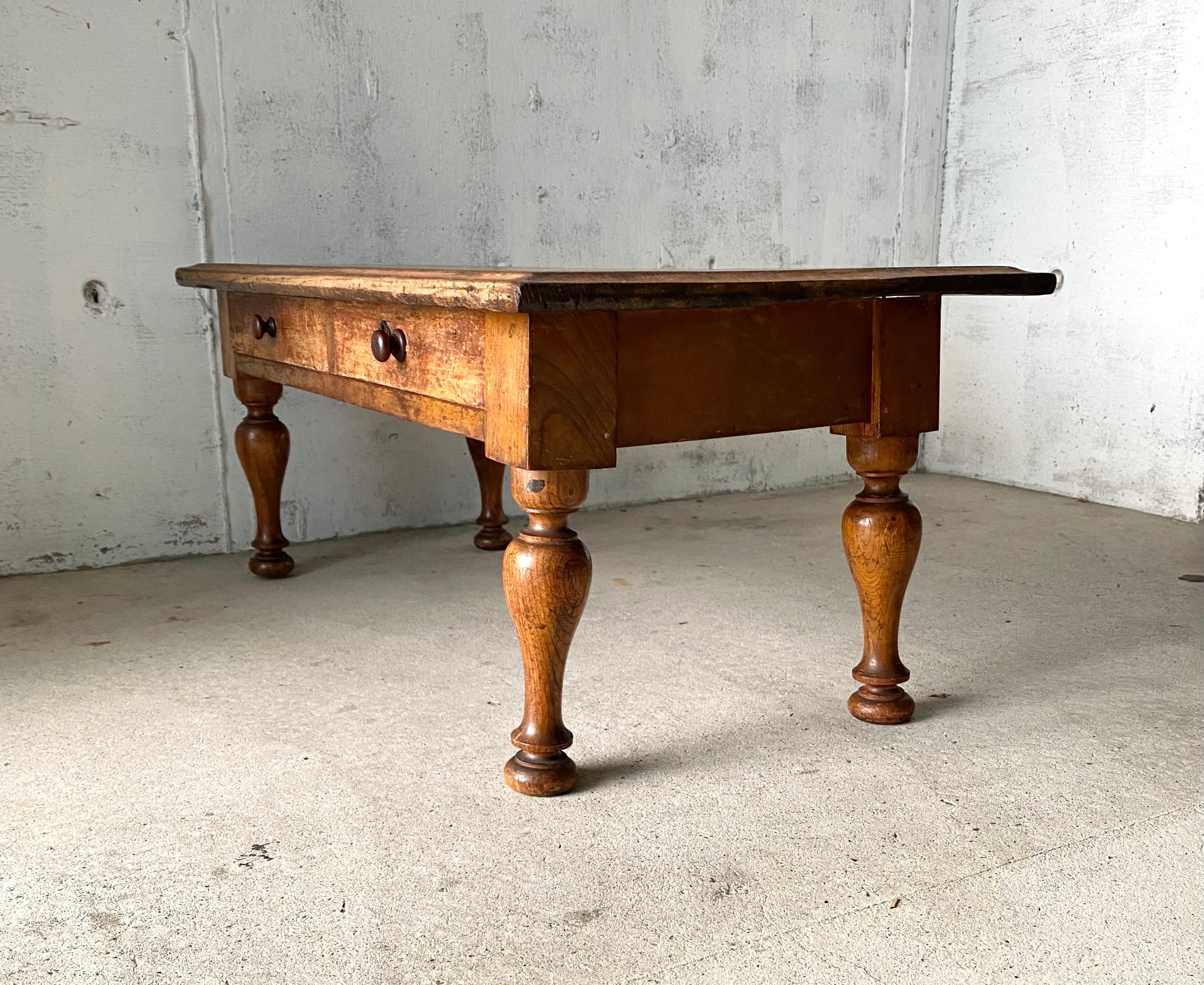 経年変化の上品な佇まい、個性的なろくろ脚が感じ良いローテーブル。引出しの開閉はスムーズに行えます。ソファテーブルや作業テーブルとして、お気に入りのコレクションを飾る台としても素敵にお使い頂けそうです。