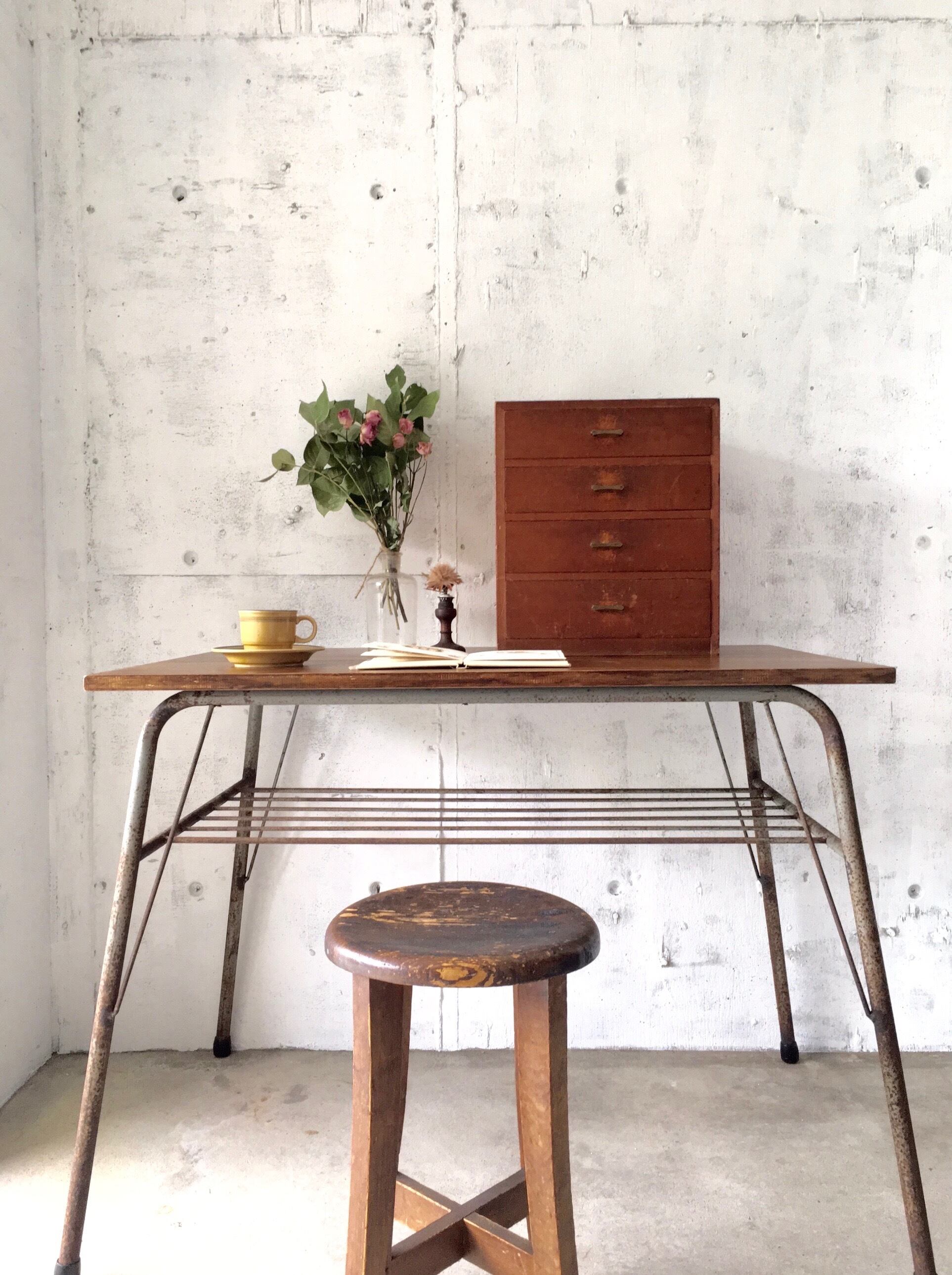 使い込まれた木の風合いと小振りな真鍮取手が可愛いらしい小引き出し。引出し中は比較的綺麗で開閉もスムーズに行え、B5サイズが余裕を持って入る大きさです。お部屋のカウンター上やリビング、作業場などで細々したものやステーショナリーの整理に役立ってくれそうです。
