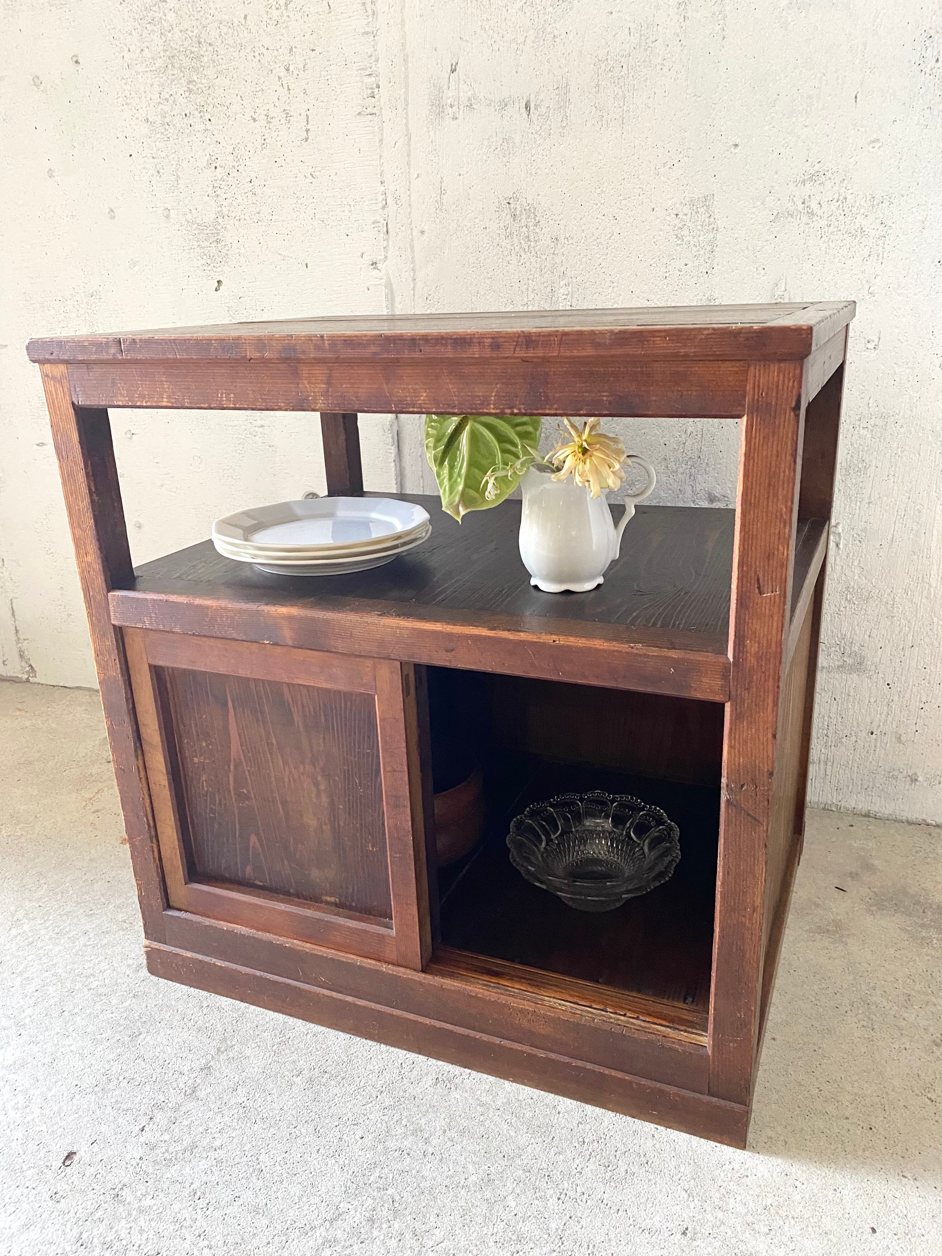 経年変化の味のある木肌、上品な佇まいが感じ良い引戸収納棚。キッチンやリビングなどの棚脇、卓上、カウンター上に置いて食器や調味料、本や小物の収納としても素敵です。