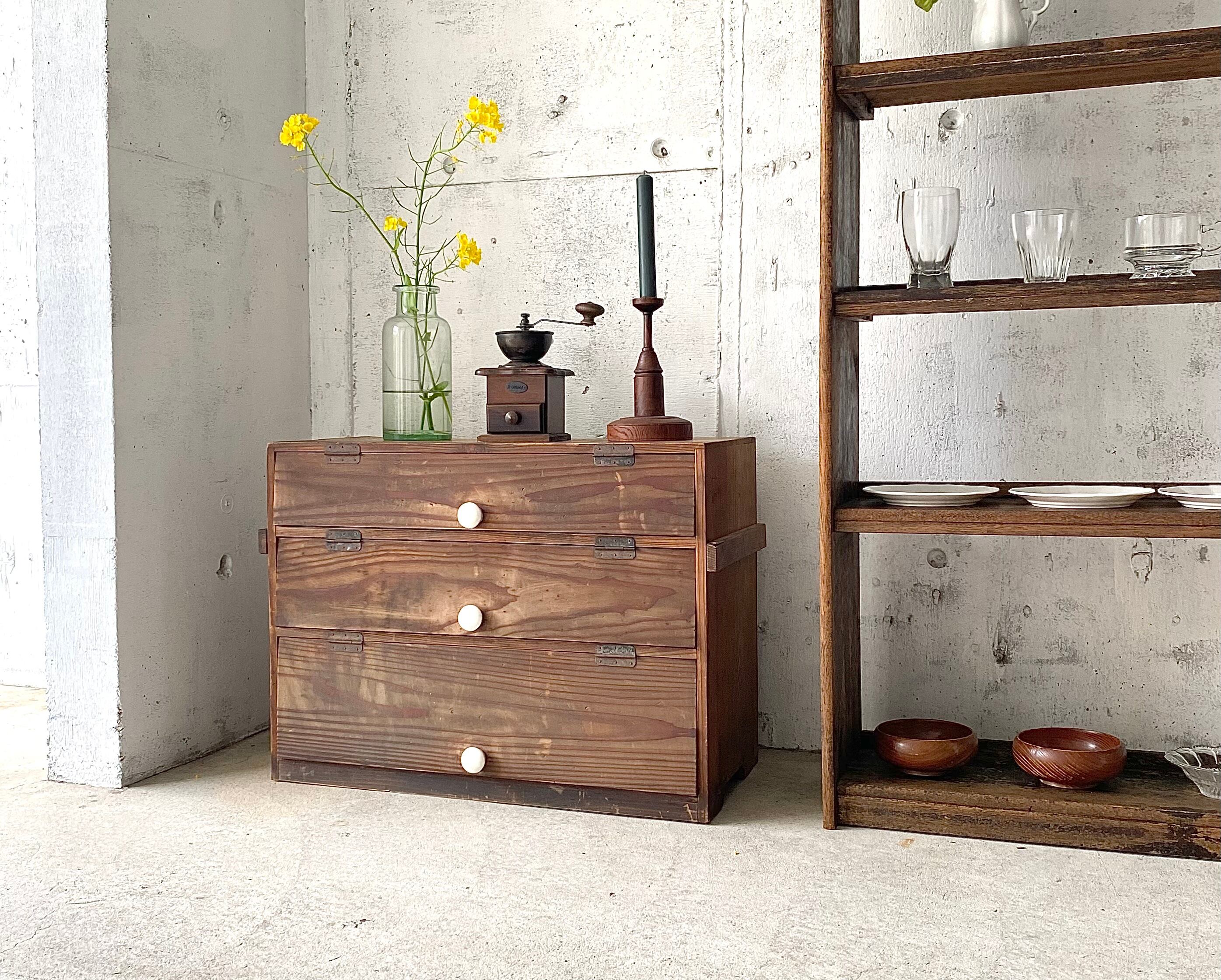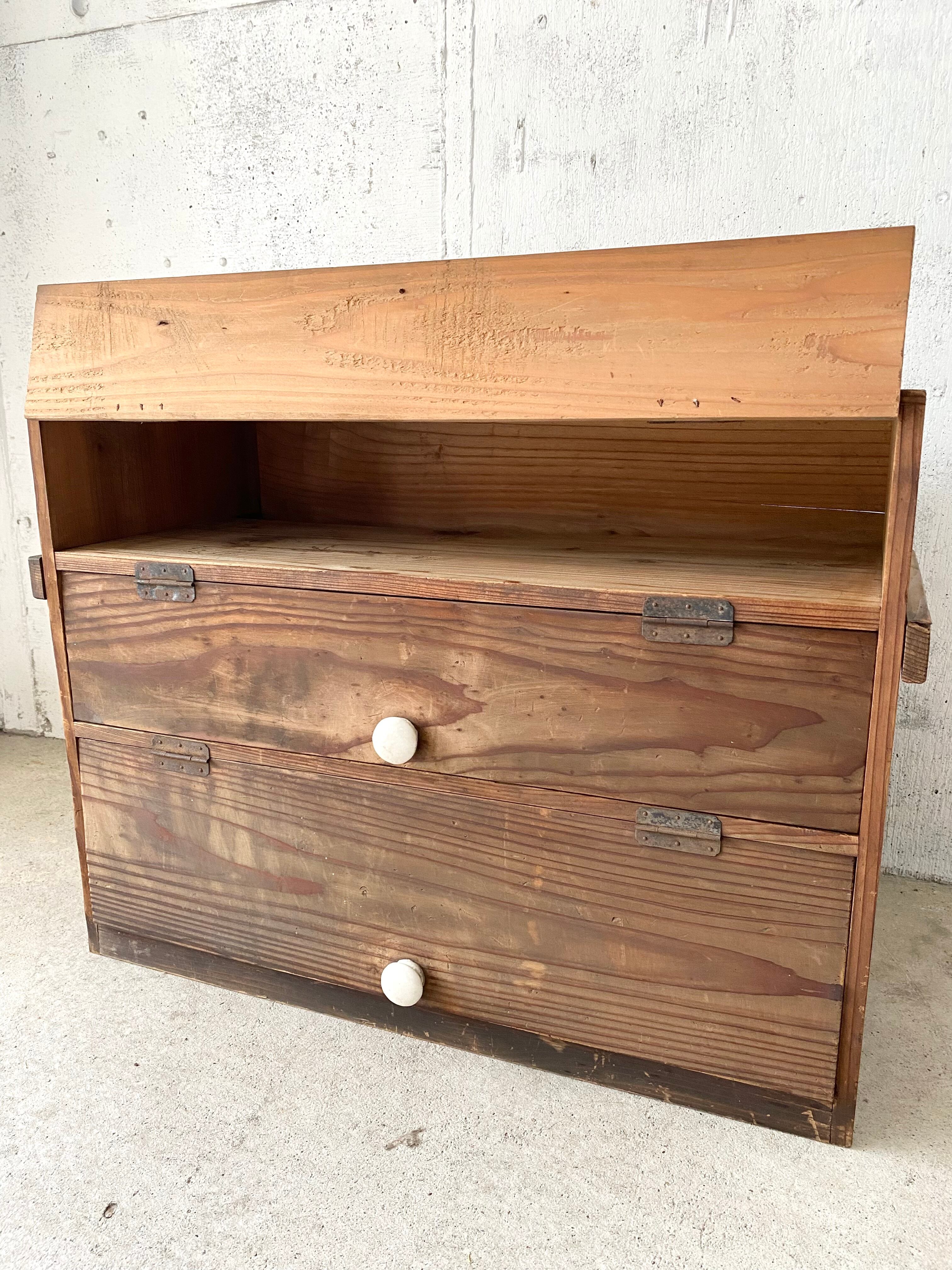 経年変化の味のある木肌と取手、パタパタ扉が感じ良い収納棚。キッチンで食器や調味料のストック棚としてや、アトリエで本や紙物、小物の収納としても素敵にお使い頂けそうです。