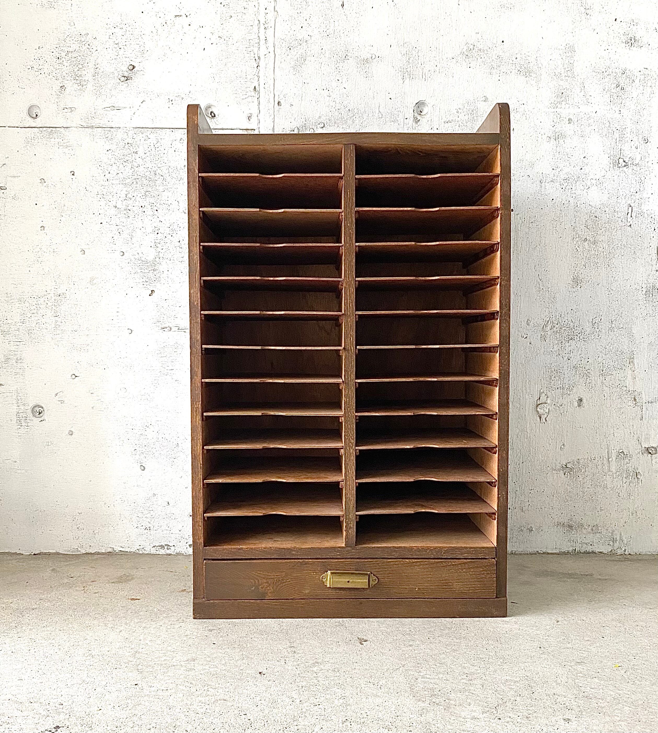 古いカルテケースになります。スレや当たりキズ、禿げ、欠け、割れ、落としきれない汚れなどがあります。仕切りは取り外し出来ますが、下から4段目の取り外しは硬いです。全体的に状態も良いのでまだまだ実用的にお使いいただけます。