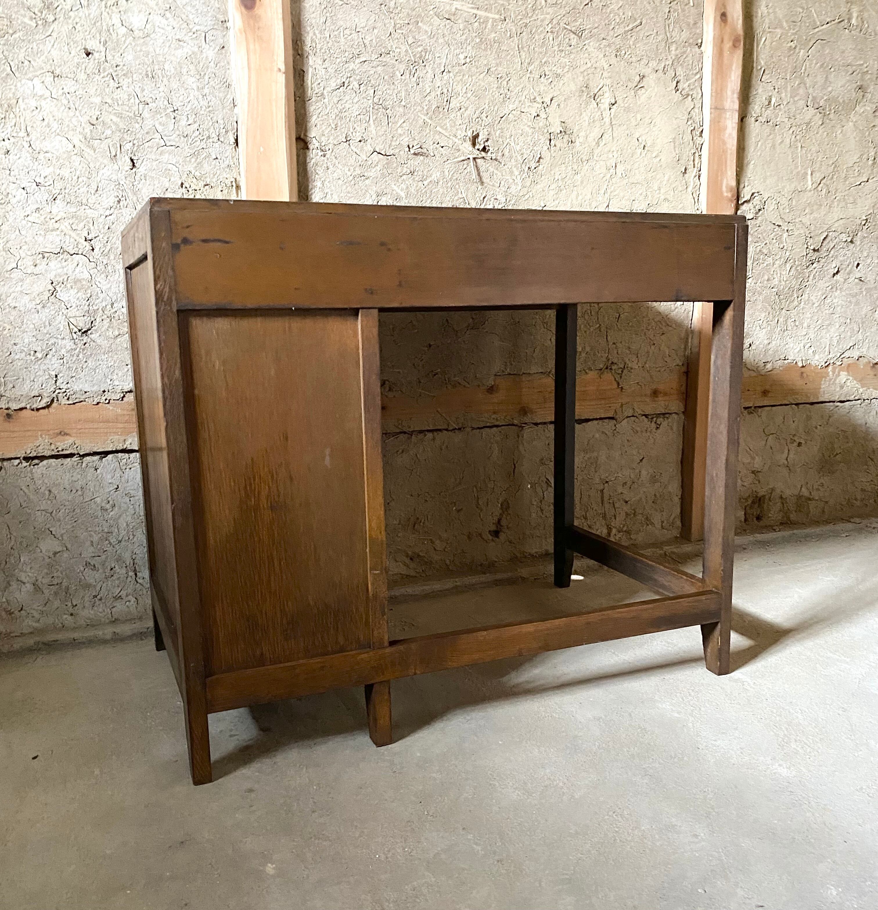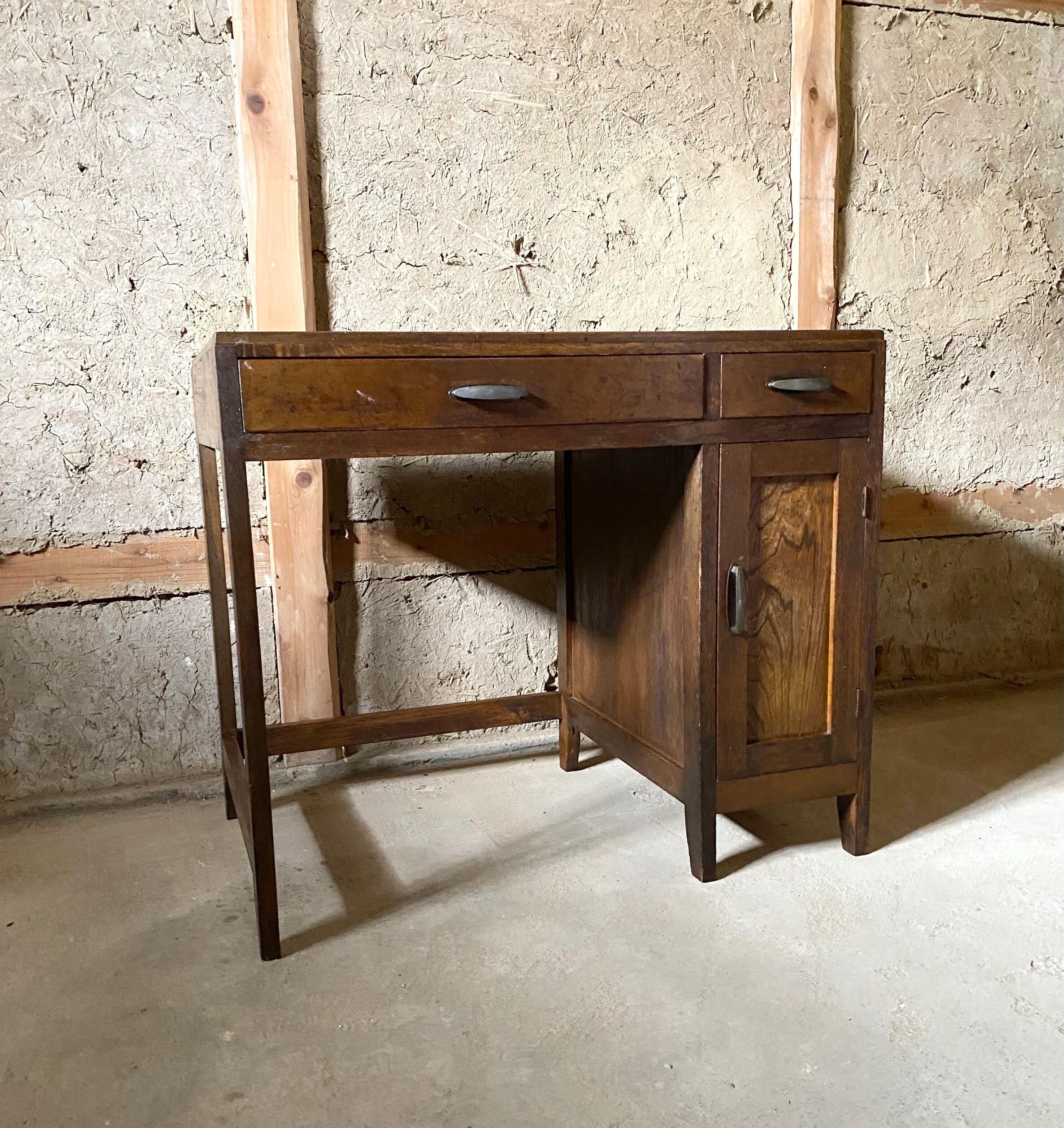 古いデスクになります。スレや剥げ、反り、割れ、サビ、隙間、当たりキズ、落としきれない汚れなどがあります。少しのがたつきはありますが、引出しの開閉はスムーズに行えます。全体的に状態も良くまだまだ実用的に活躍してくれます。