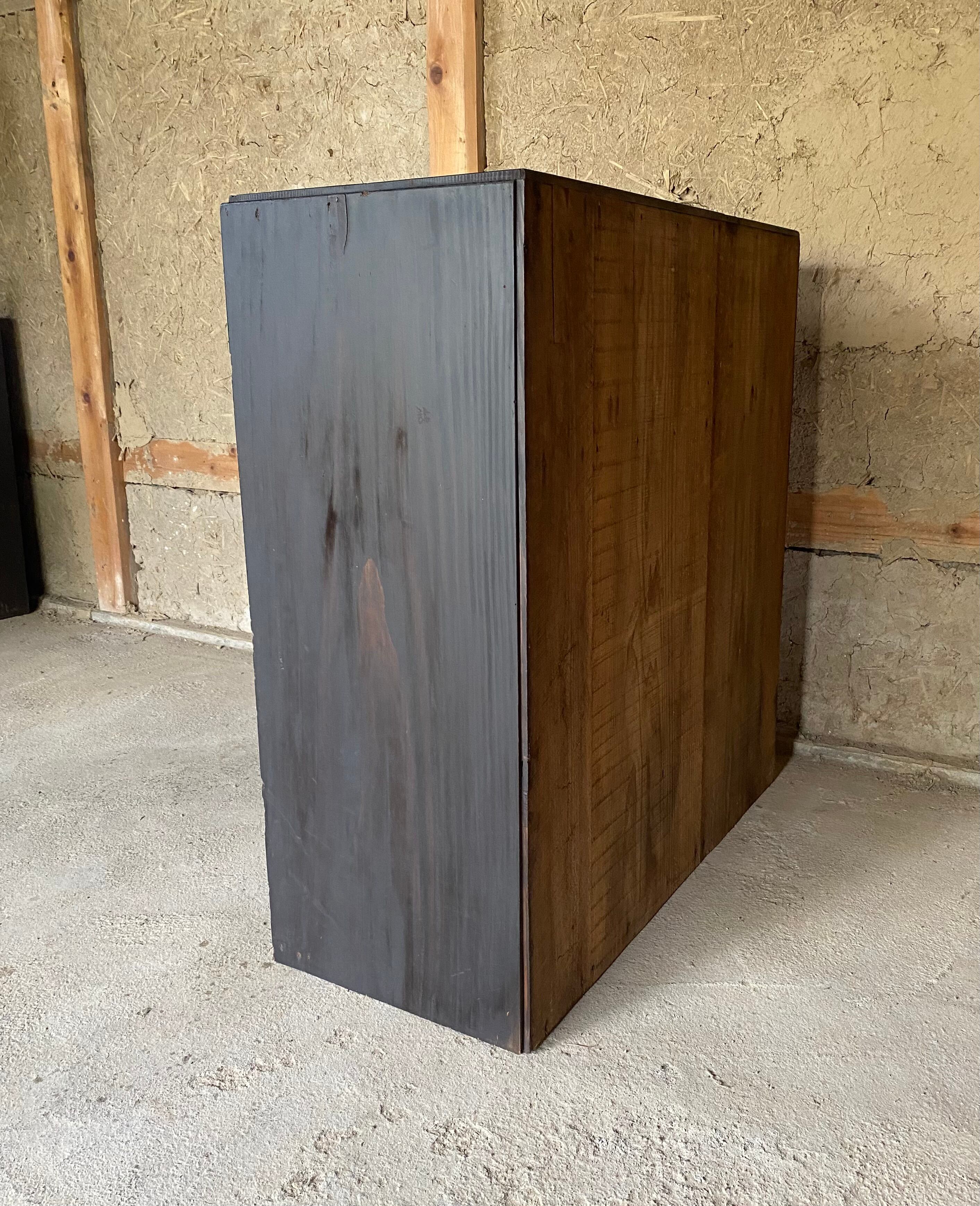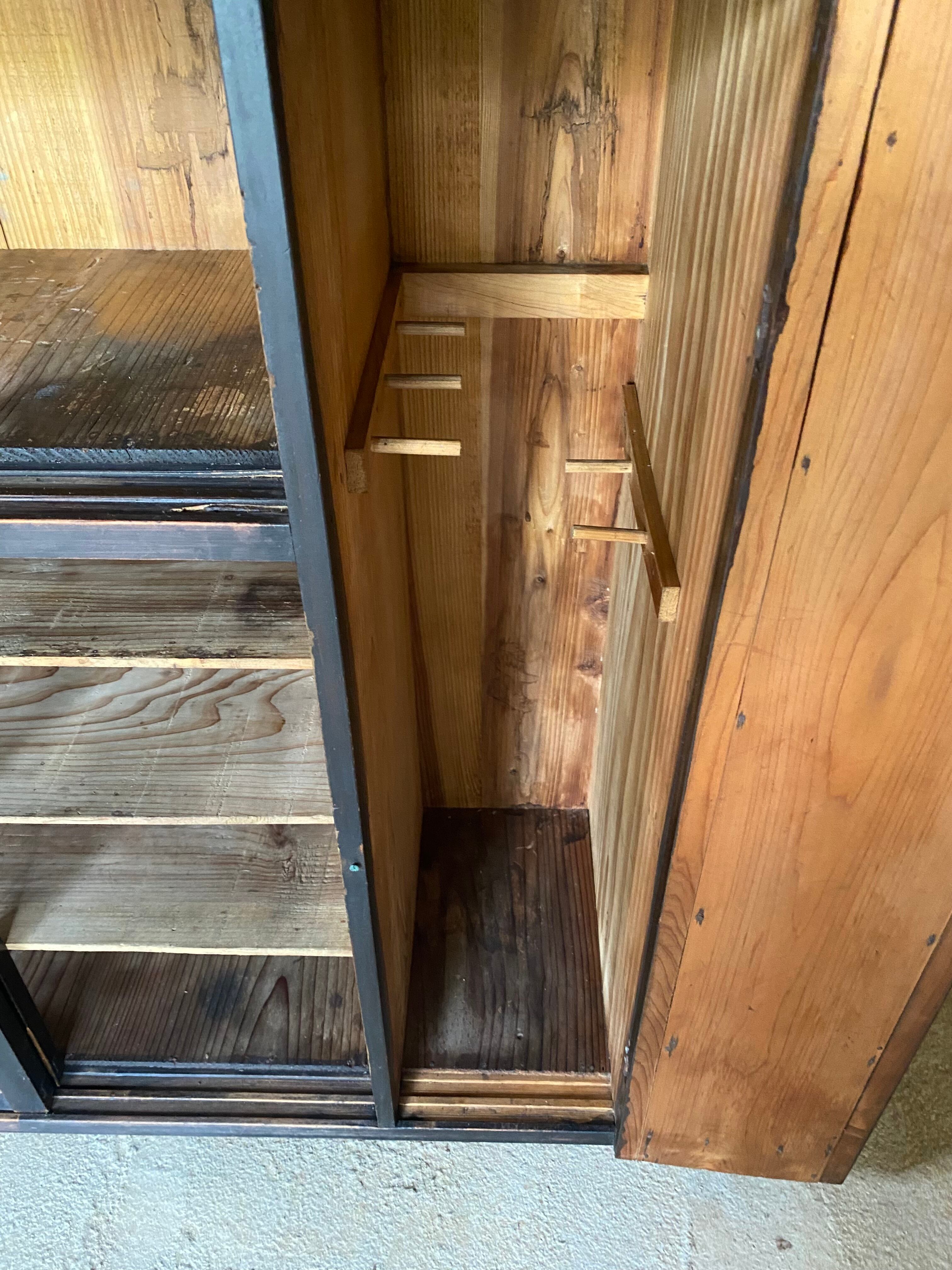 古い収納棚になります。スレや当たりキズ、禿げ、欠け、浮き、反り、穴、落としきれない汚れなどがあります。扉、引戸の開閉は比較的スムーズに行えます。特に目立つガラスの割れはなく、全体的に状態も良いのでまだまだ活躍してくれます。