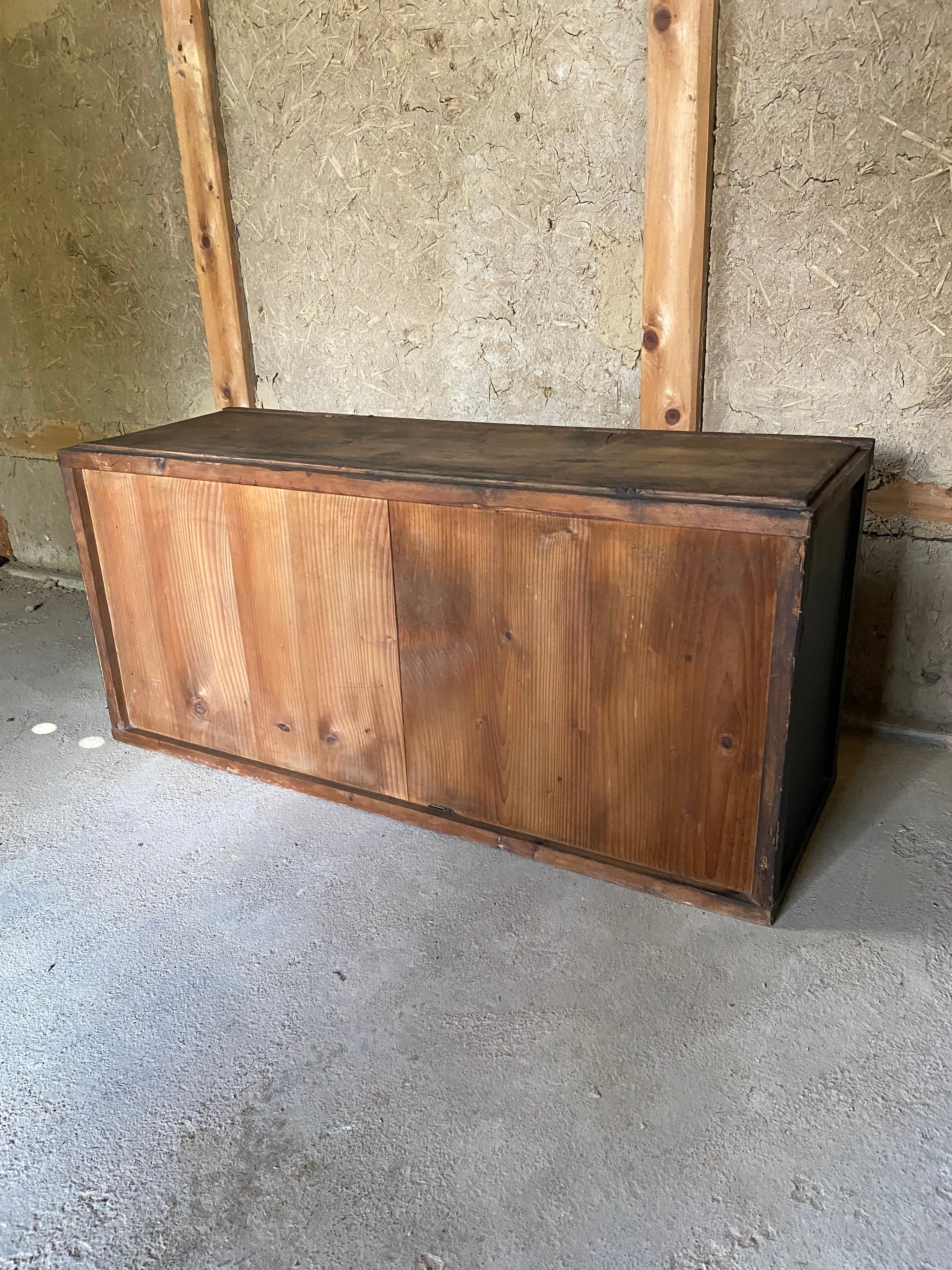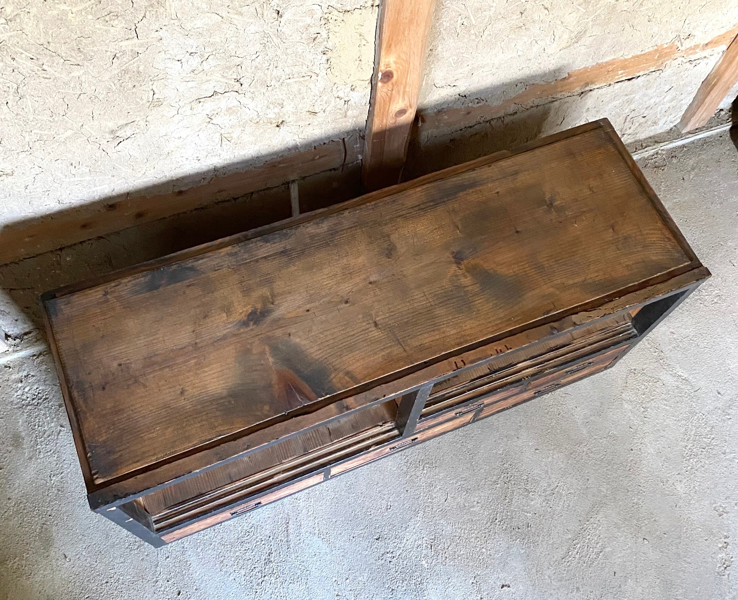古いローボードになります。スレや剥げ、反り、サビ、隙間、当たりキズ、割れ、落としきれない汚れなどがあります。引出しの開閉はスムーズに行えます。全体的に状態も良くまだまだ実用的に活躍してくれます。