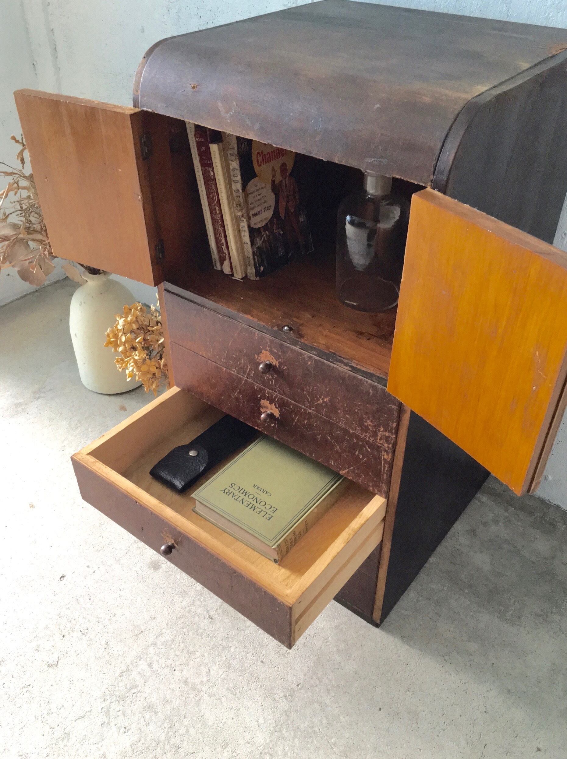 古い収納棚になりますので、スレや剥げ、当たりキズ、割れ、欠け、落としきれない汚れなどがあります。引出し、扉の開閉はスムーズに行え、日常気軽にお使いいただけます。引出し中も綺麗です。全体的に状態も良いのでまだまだ実用的に活躍してくれます。