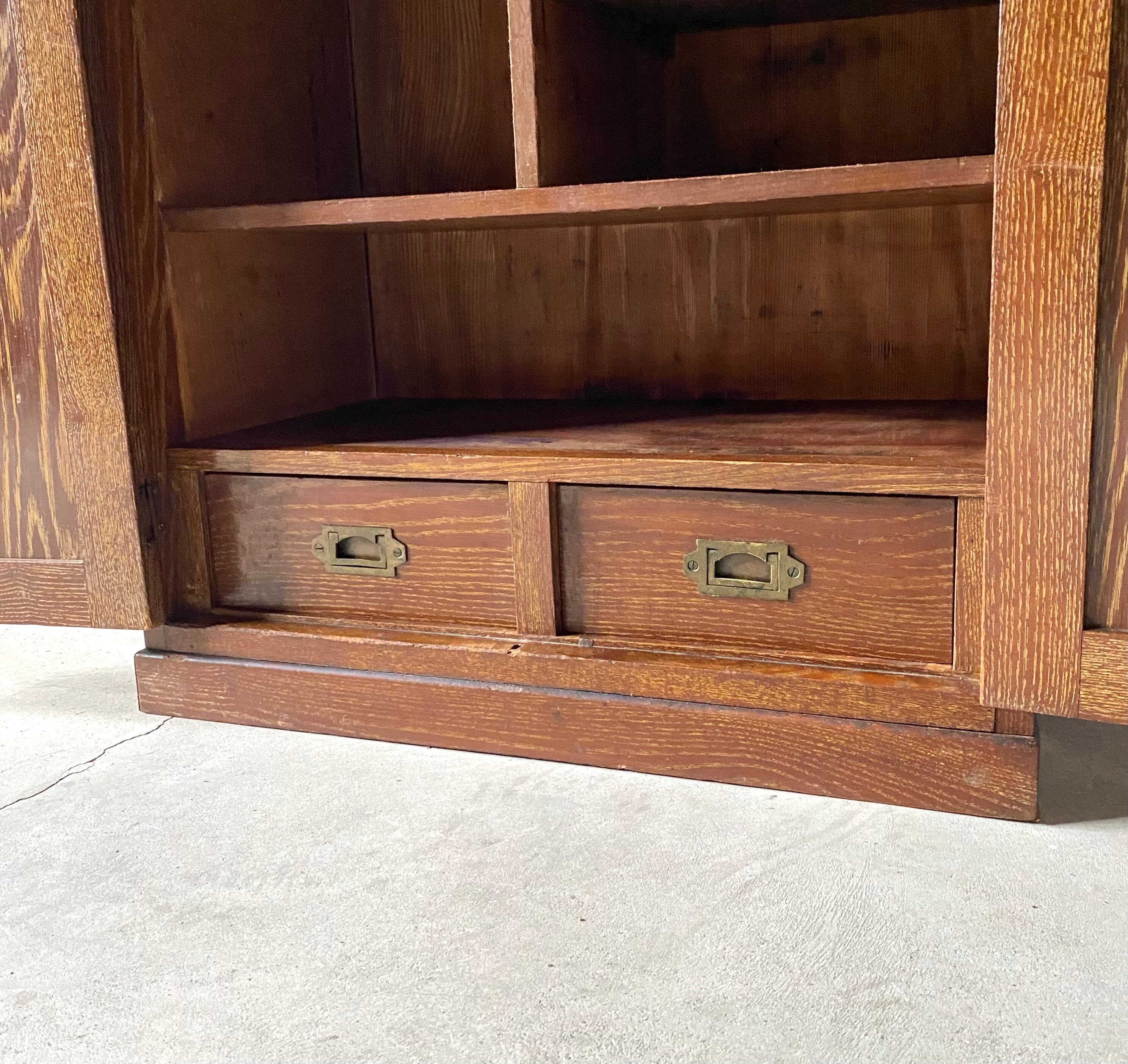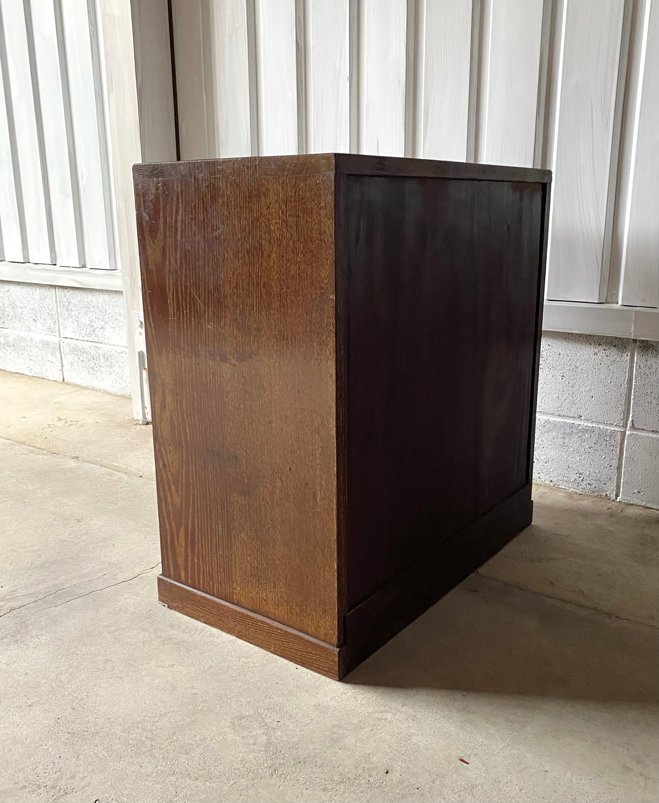 古い収納棚になります。スレや欠け、当たりキズ、割れ、禿げ、隙間、サビ、落としきれない汚れなどがあります。扉戸、引出しの開閉は比較的スムーズに行えます。全体的に状態も良いのでまだまだ実用的に活躍してくれます。