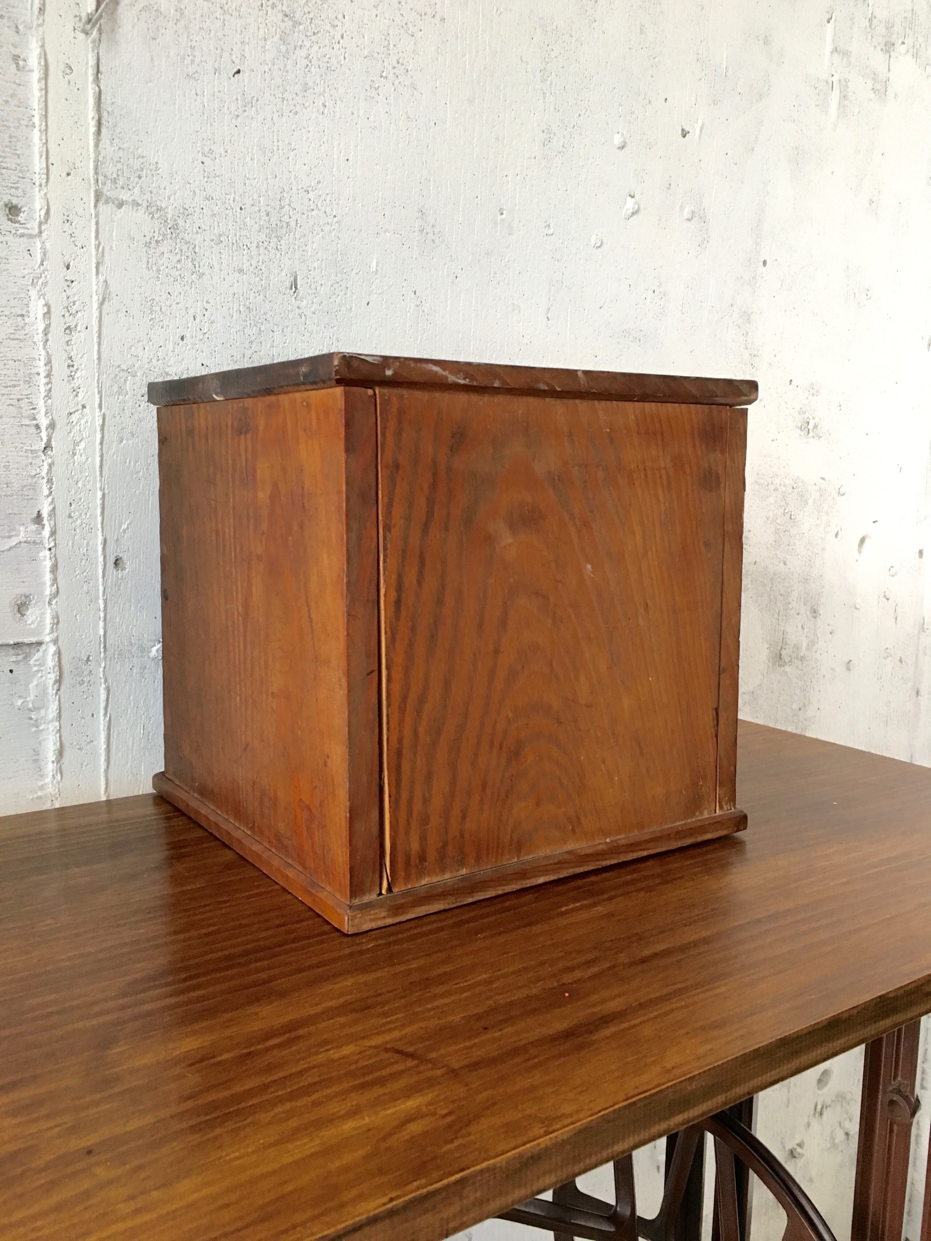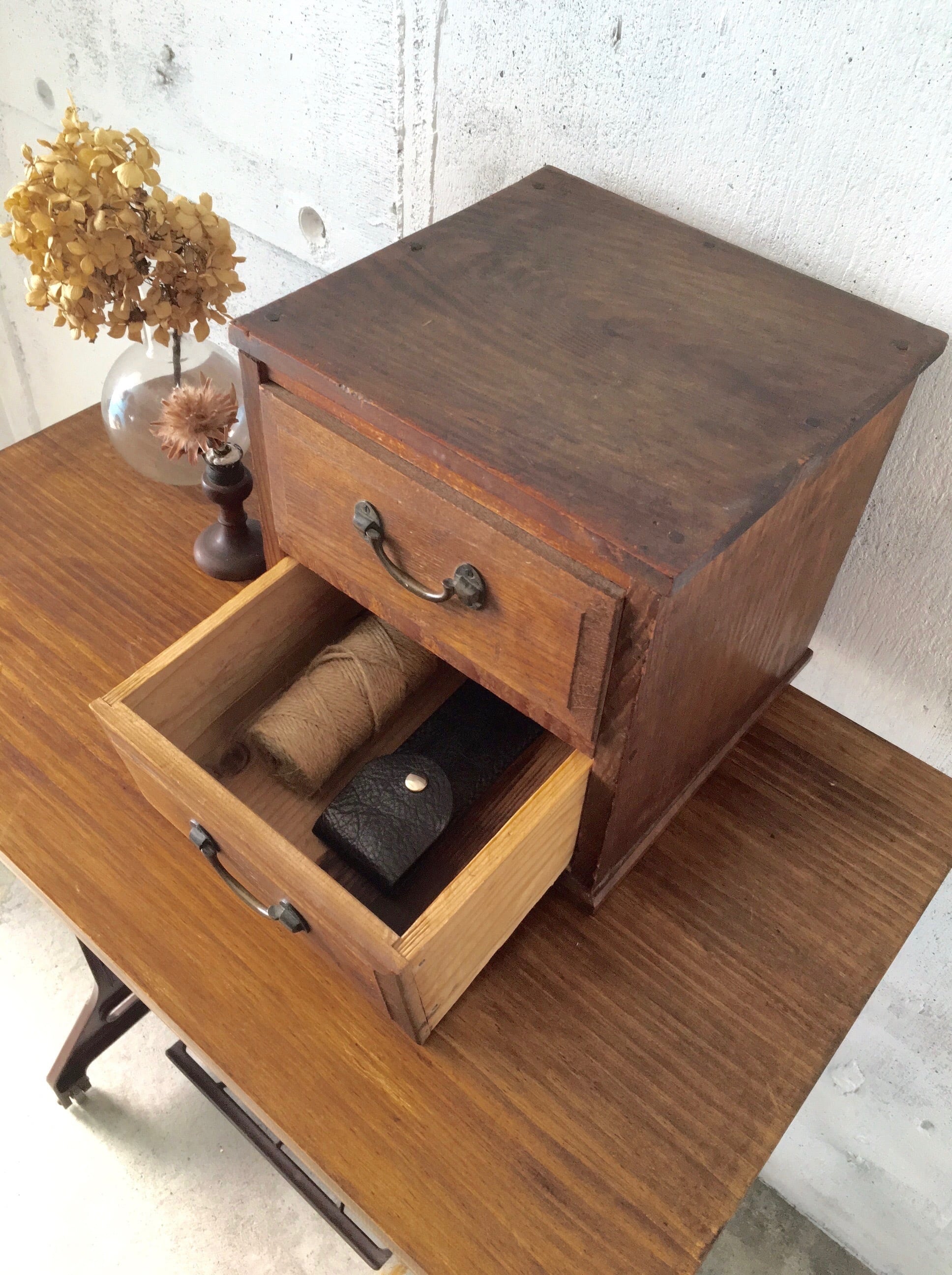 小振りなサイズ感、雰囲気の良い取手が素敵な小引き出し。引出し中は少し汚れがありますが、開閉はスムーズに行え、日常気軽にお使いいただけます。作業スペースで細々した材料、パーツ入れにしてみたり、アクセサリーなどの収納にしてみても素敵です。卓上で隣に植物や小物などを飾ってみても、バランスの良い空間が出来上がりそうです。