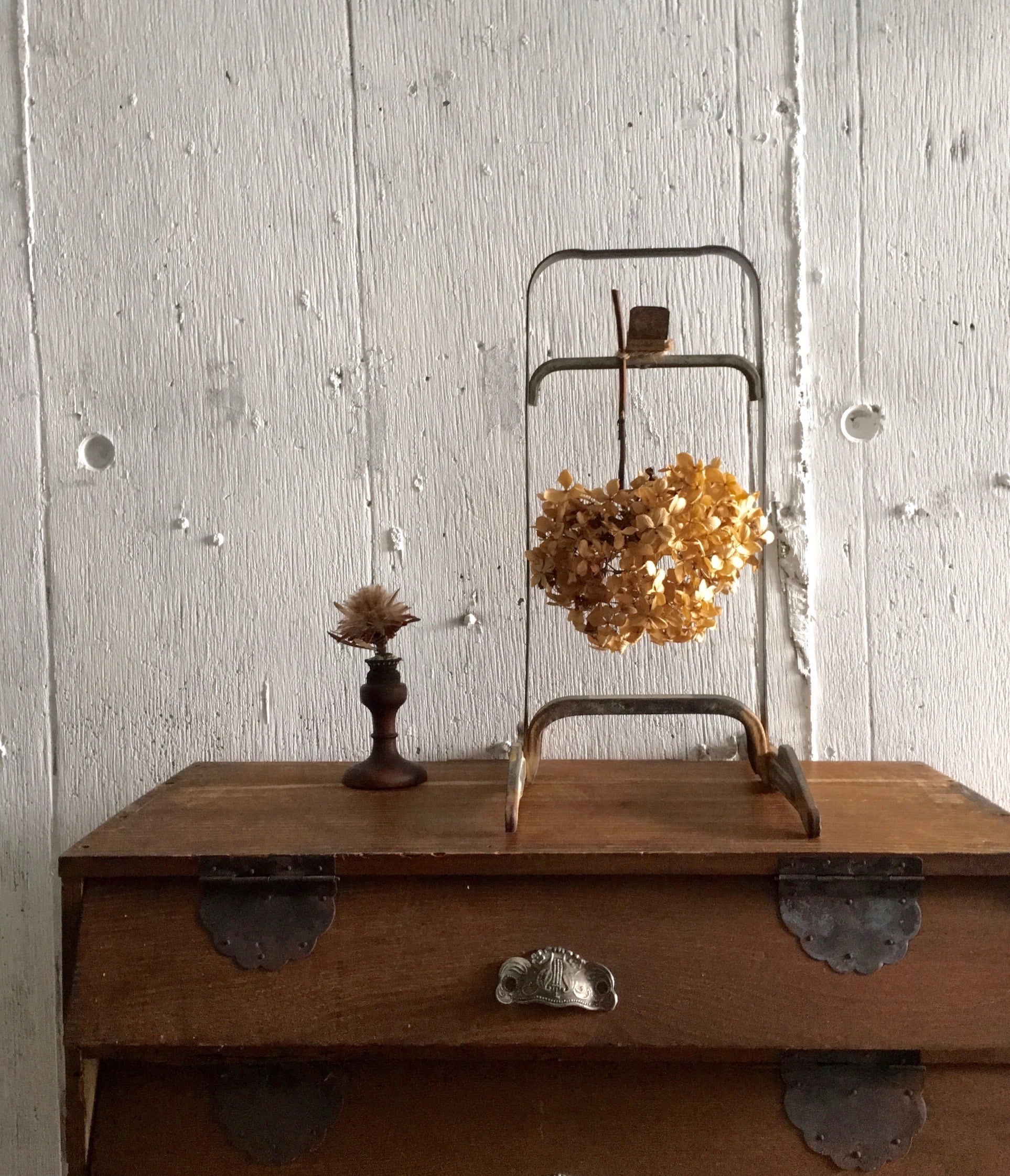 インダストリアルな格好良い雰囲気の飾り台。経年変化のアイアンの質感も感じ良いです。少しがたつきはありますが、しっかりとしています。卓上、カウンター上でドライフラワーなどを吊る下げて飾ってみたら、素敵な空間を演出できそうです。