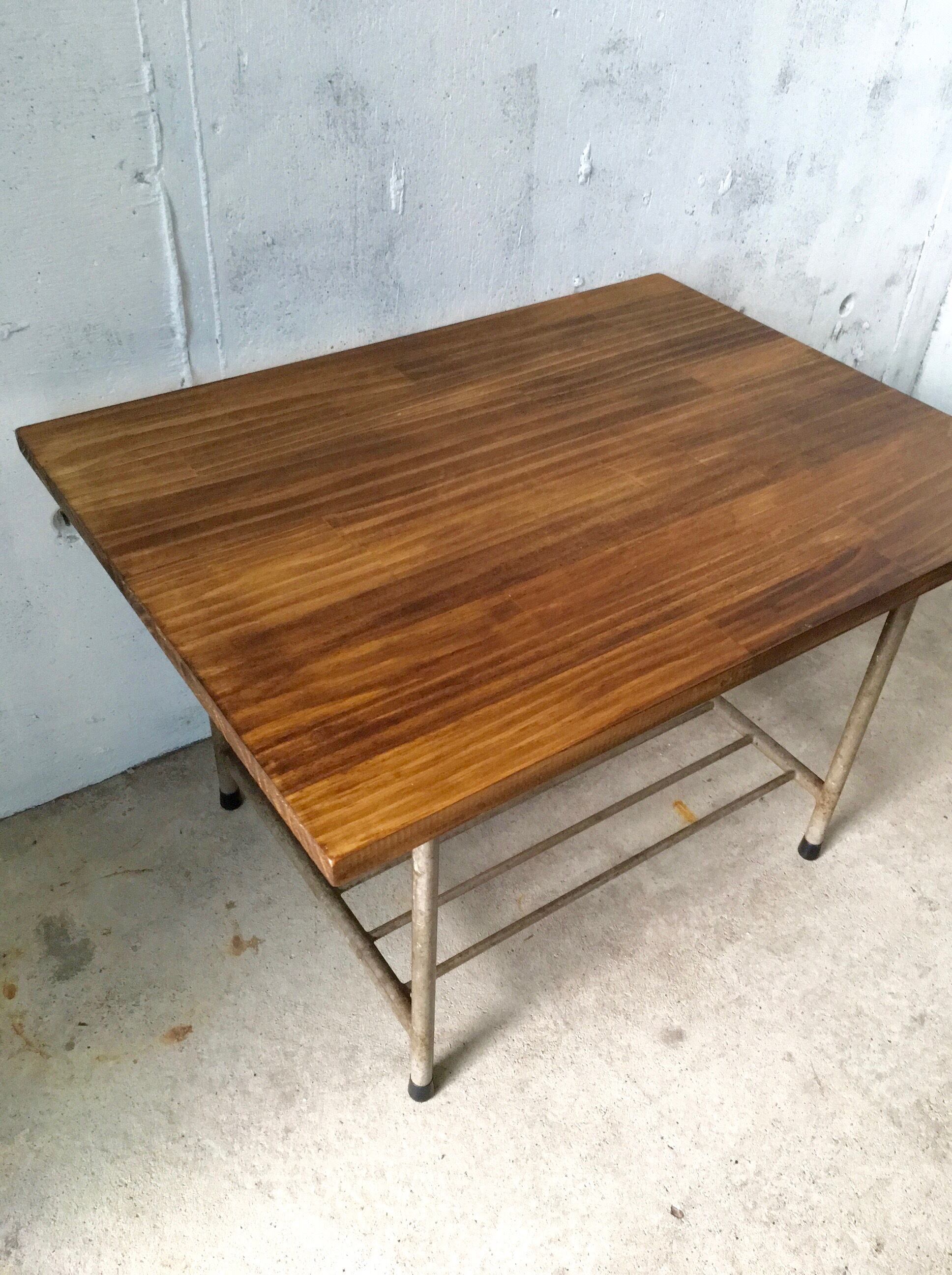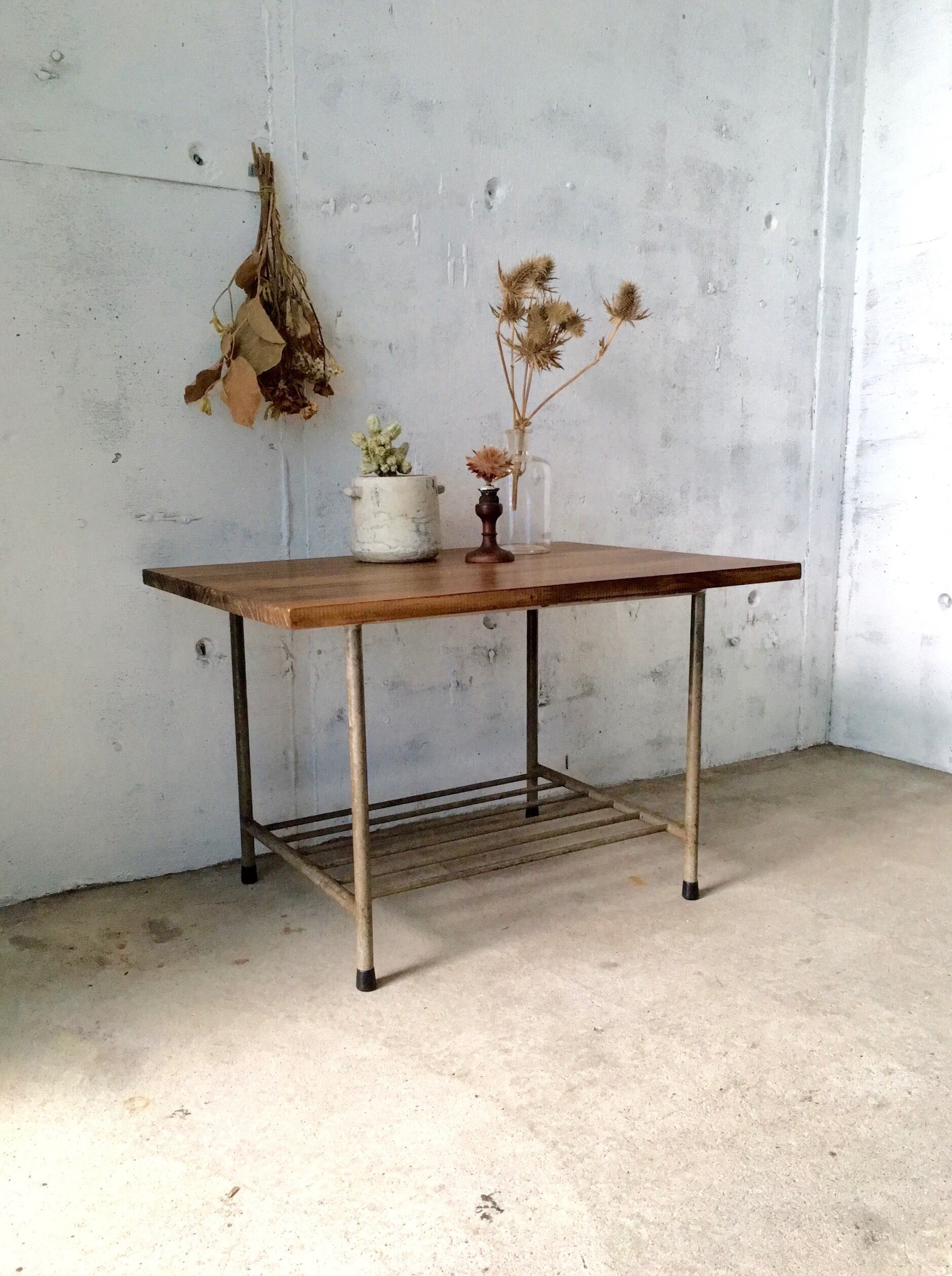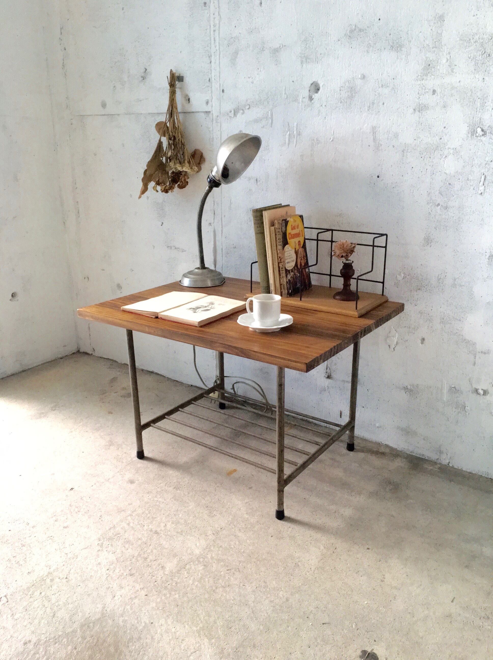古い鉄脚と新材のオリジナルリメイクのサイドテーブルになります。スレや剥げ、当たりキズ、サビ、落としきれない汚れなどがあります。古い鉄脚ですので、少しのぐらつきなどはありますが、使用上問題なくお使いいただけます。全体的に状態も良く、まだまだ実用的に活躍してくれます。