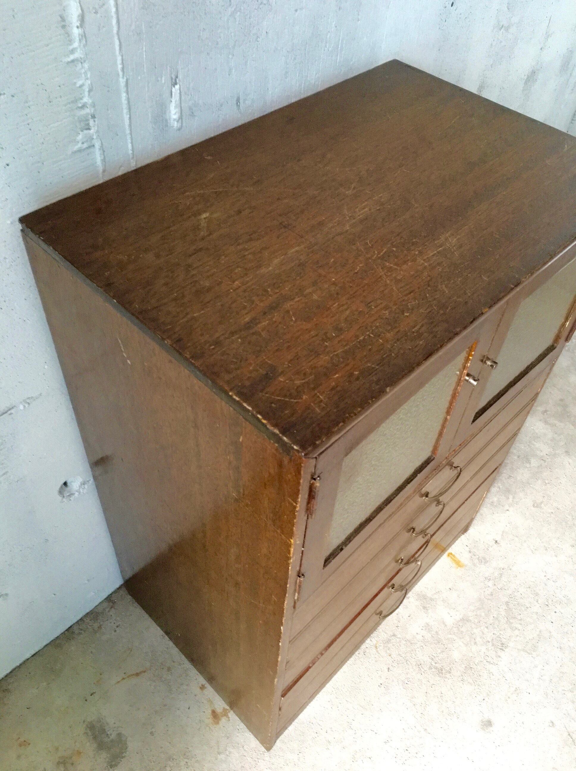 古い収納棚になります。スレや欠け、割れ、当たりキズ、落としきれない汚れなどがあります。ガラス扉、引出しの開閉は比較的スムーズに行え、日常気軽にお使いいただけます。ガラスも特に割れもなく綺麗で、全体的に状態も良いのでまだまだ実用的に活躍してくれます。